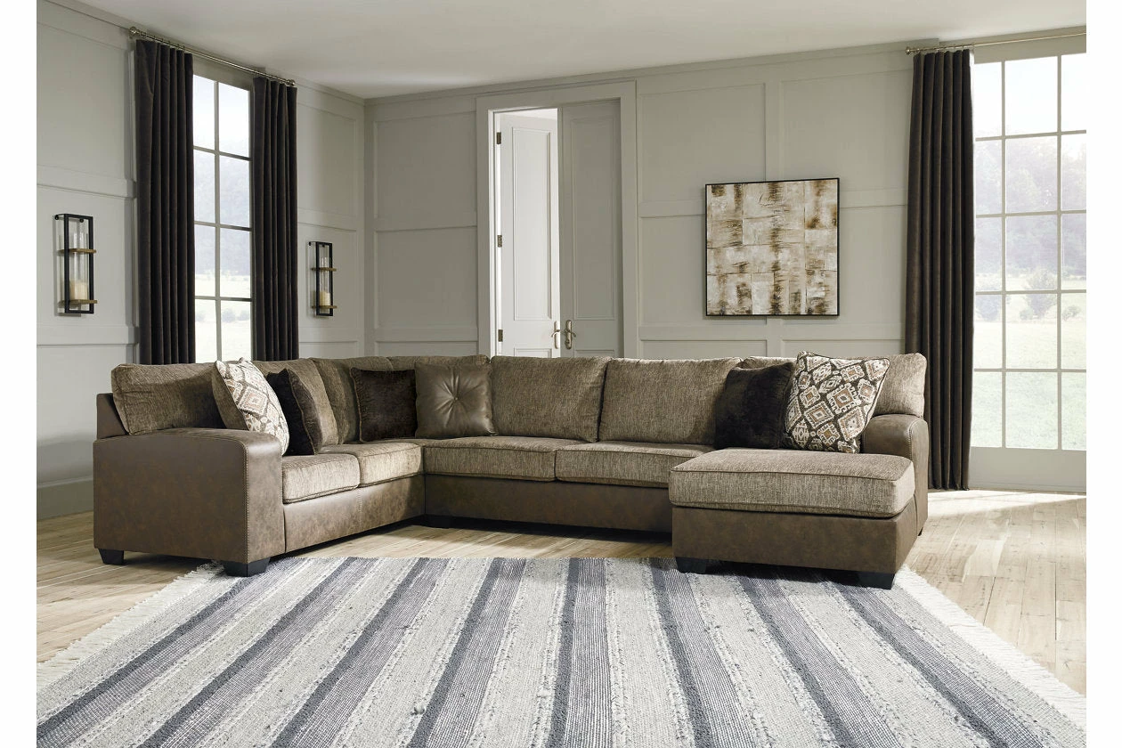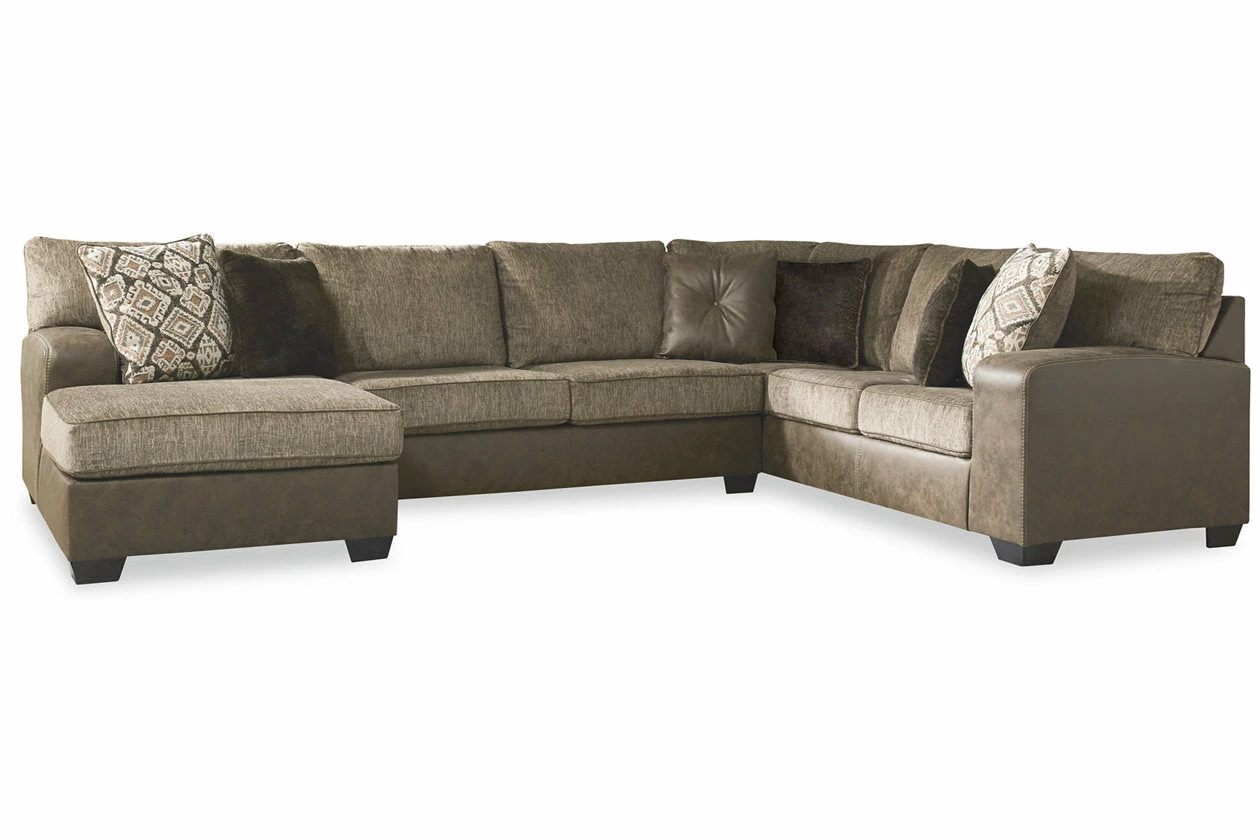 They say you can’t have it both ways. This indulgently styled sectional begs to differ. Merging cool looks with a warm, cozy feel, this decidedly modern sectional is the ultimate compromise. The sectional’s base and track armrests are wrapped in a heavy-duty faux leather with weathered treatment and contrast stitching. Rest assured, a plush chenille wraps the entire seating area—for an oh-so comfortable feel where it really counts. Designer throw pillows take the aesthetic to another level.