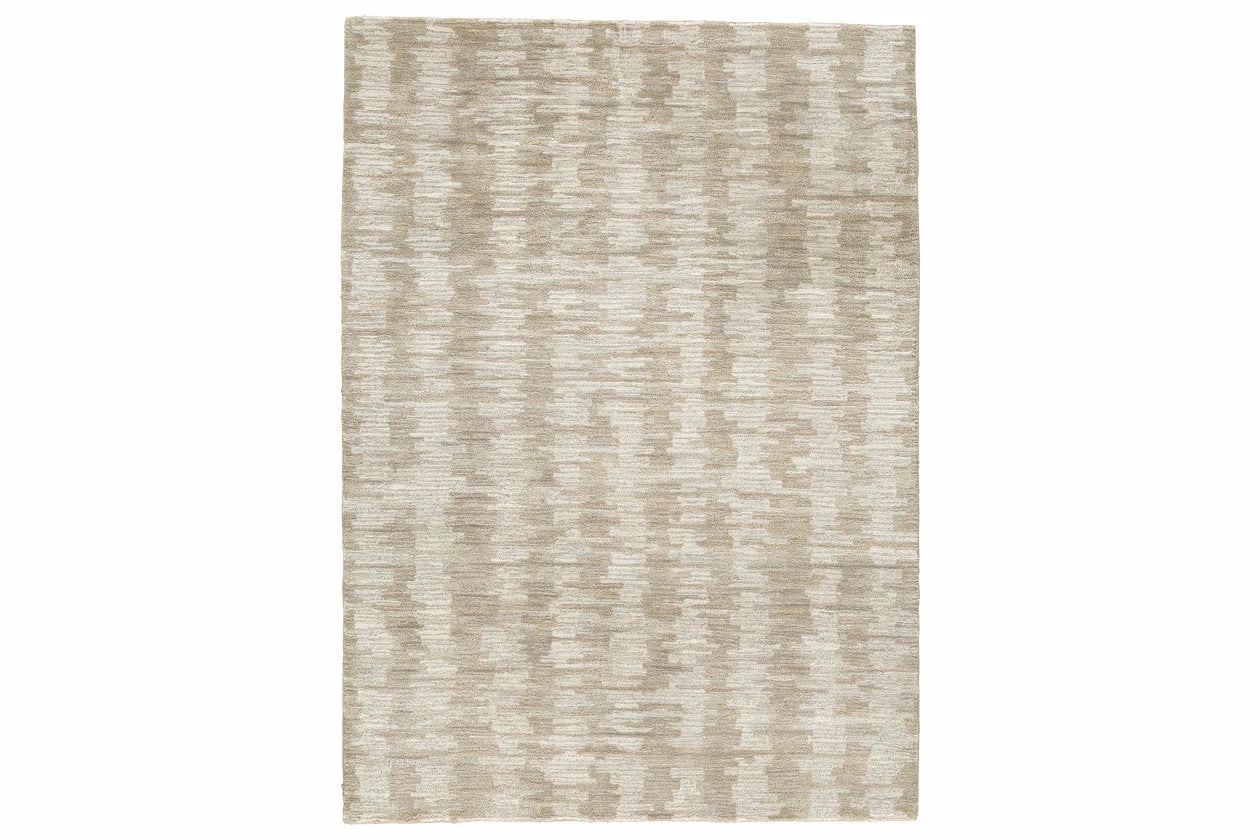 The hand-tufted modern design of this area rug will make a bold statement in any room. By alternating the pattern flow, the weavers have created a work of art alive with texture. Shades of cream and brown are blended to produce an abstract-yet-tranquil feel underfoot.