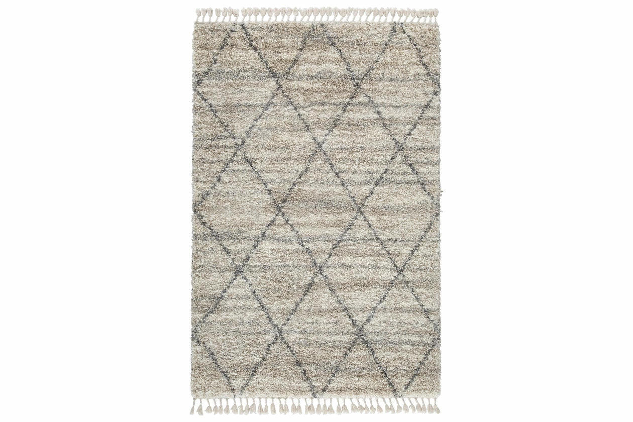 Shake up your style with woven shag. This area rug offers a deliciously comfortable underfoot experience. With a diamond design and braided tassel edge, this floor covering carries a variegated gate pattern in beige, white and shades of gray to elevate your room.