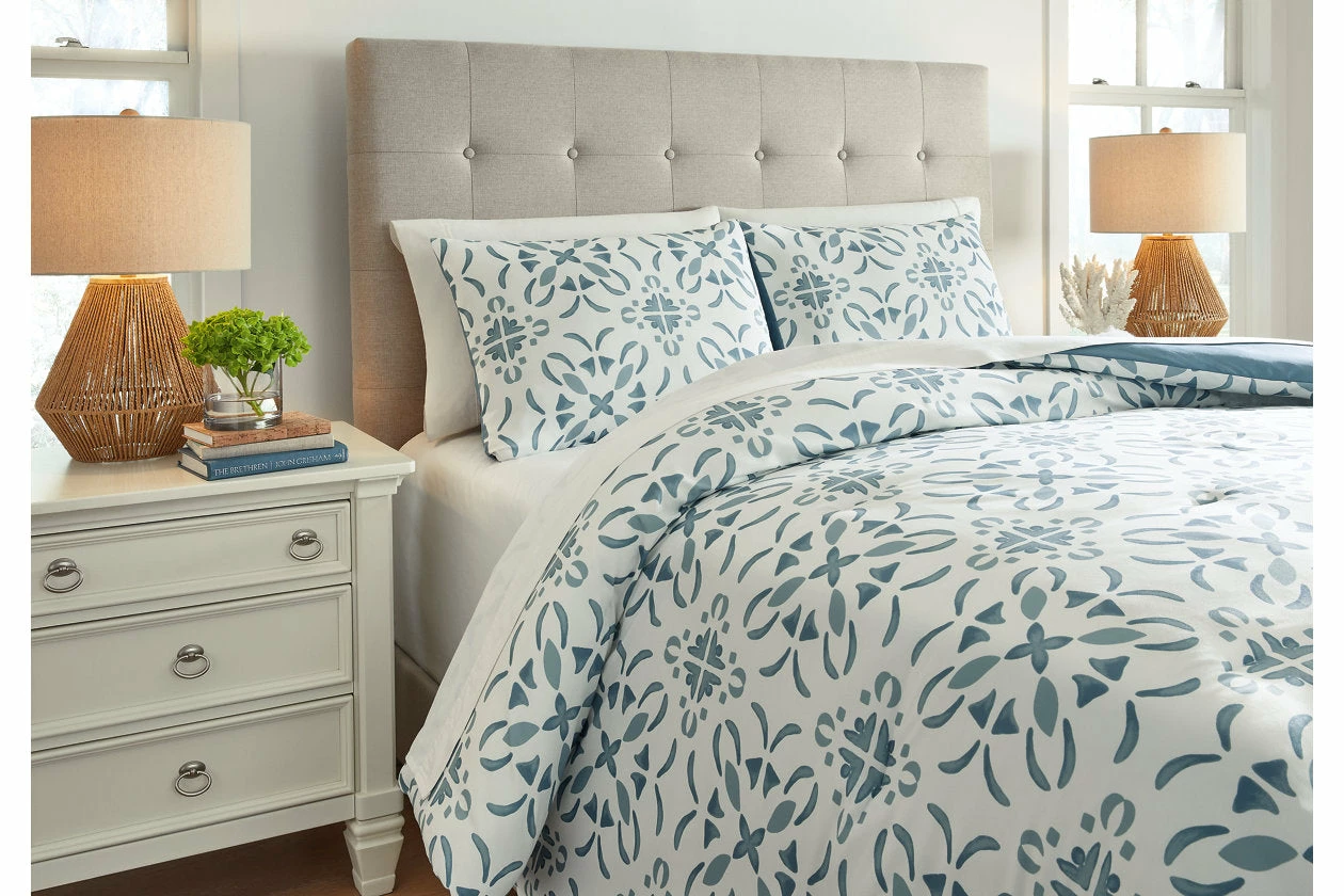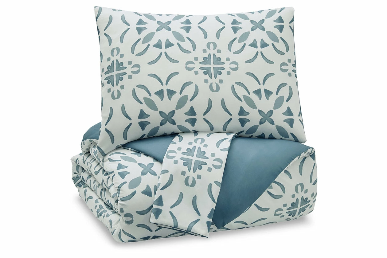 Contemporary cool from head to toe. This queen comforter set provides a pop of pattern in blue and white for your restful retreat, recalling tile motifs. It reverses to a solid blue for ultimate versatility when it comes to relaxing in refinement.