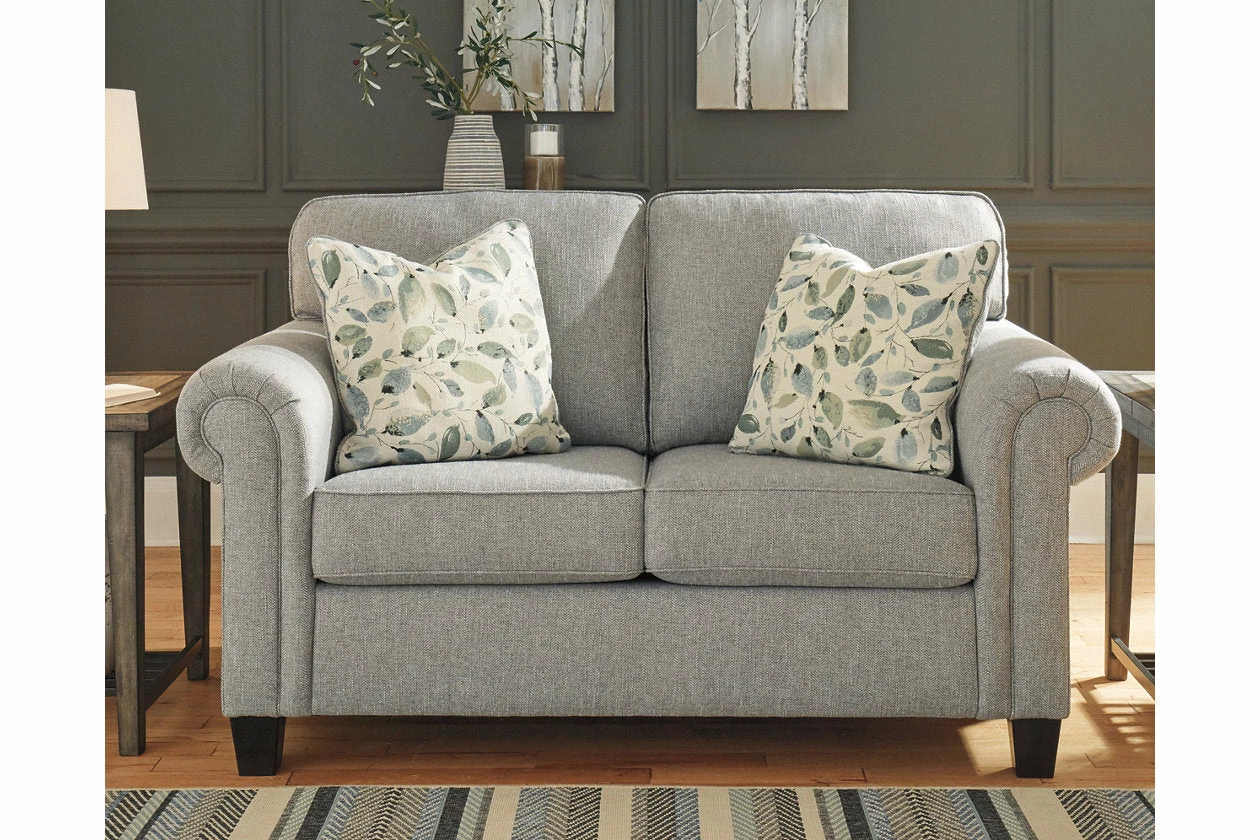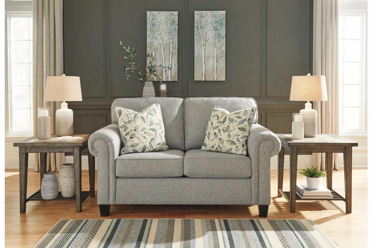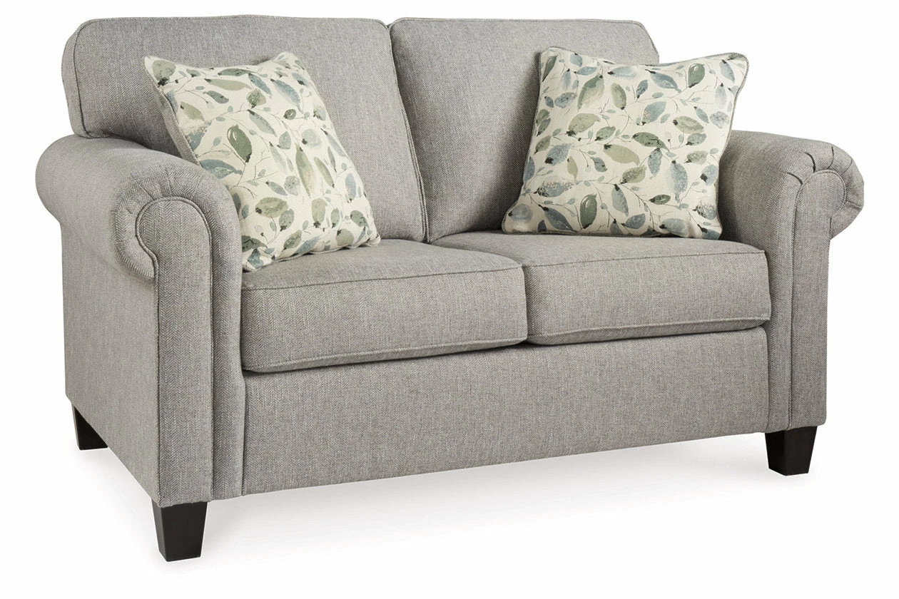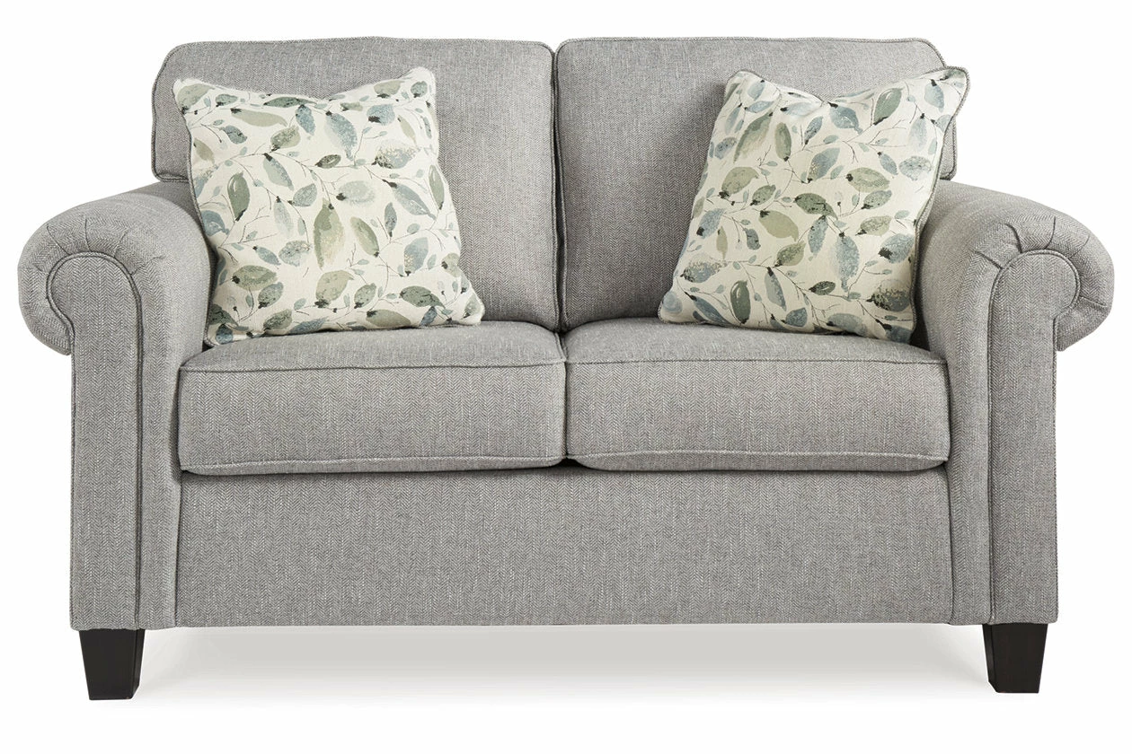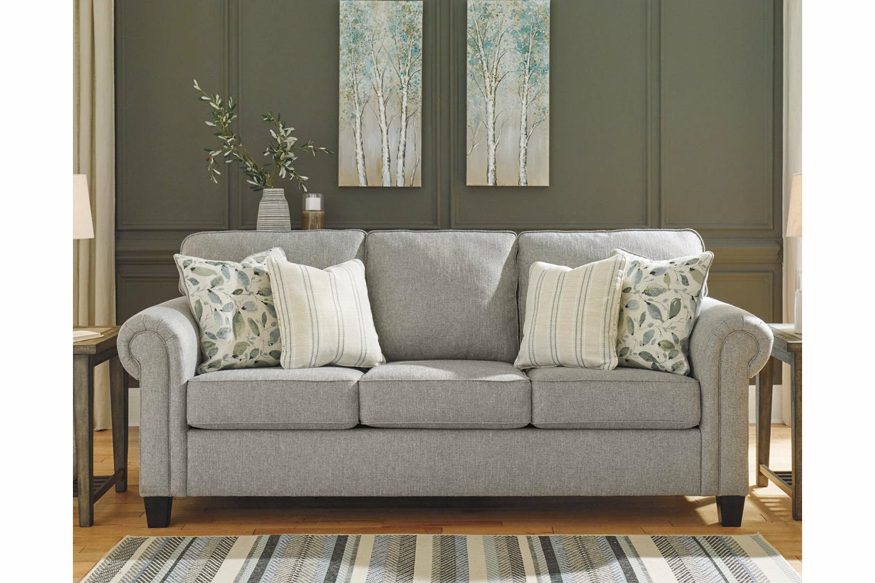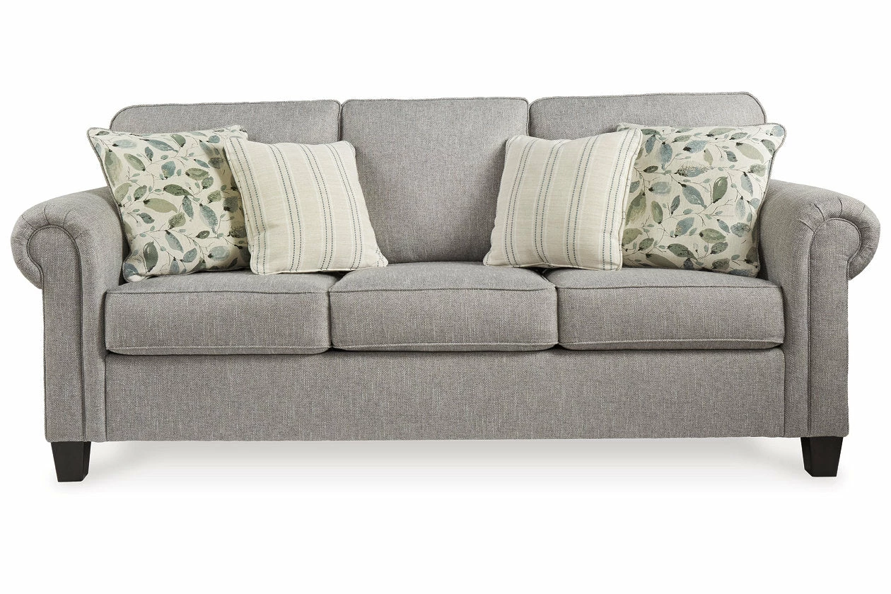 Sporting a pleasing roll arm and classic 3-over-3 cushion styling, this sofa in soft gray exudes an easy elegance sure to please. Feel-good upholstery with linen texturing is made for everyday luxury. Muted-tone toss pillows are a soothing, sophisticated complement.