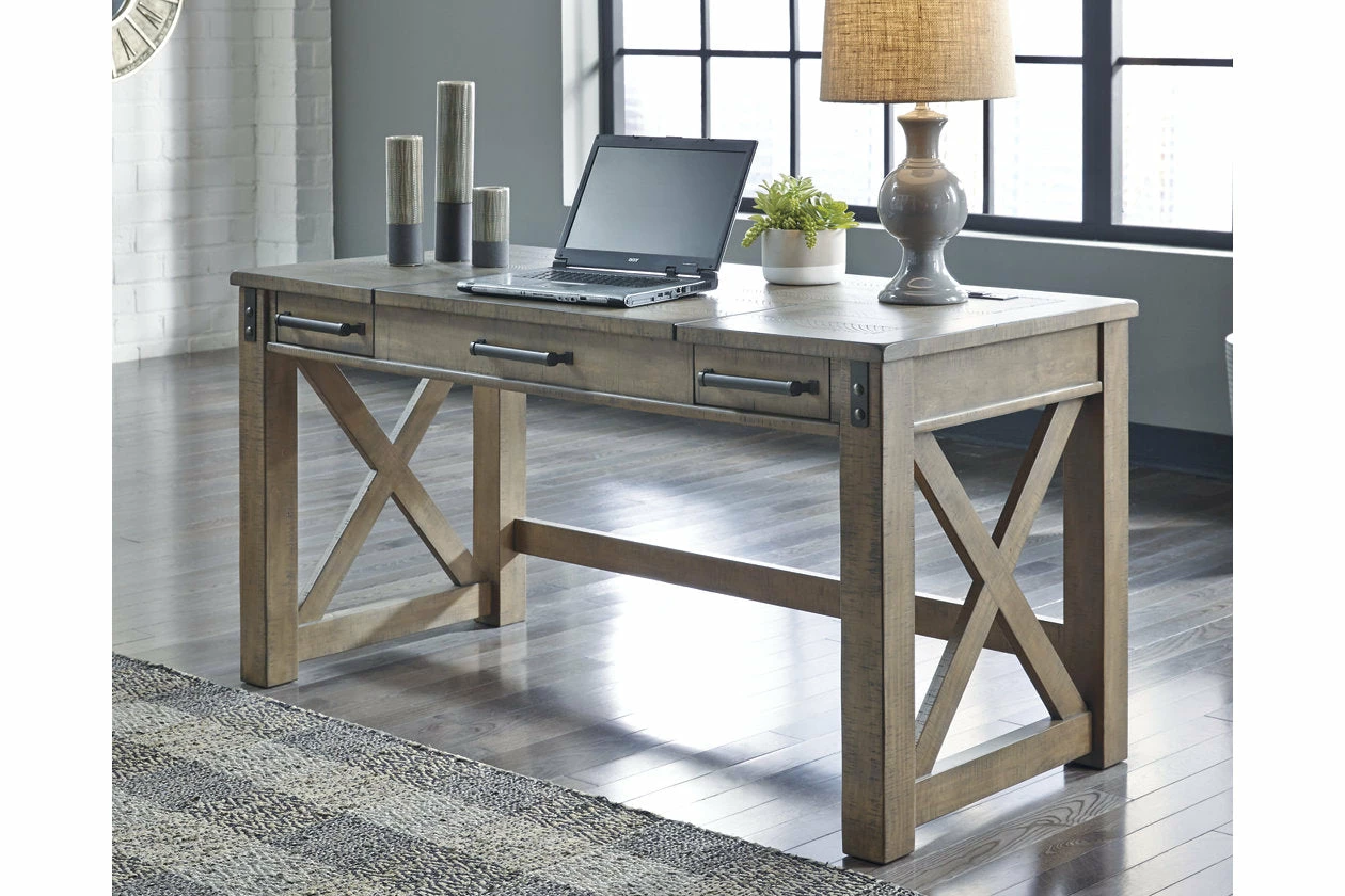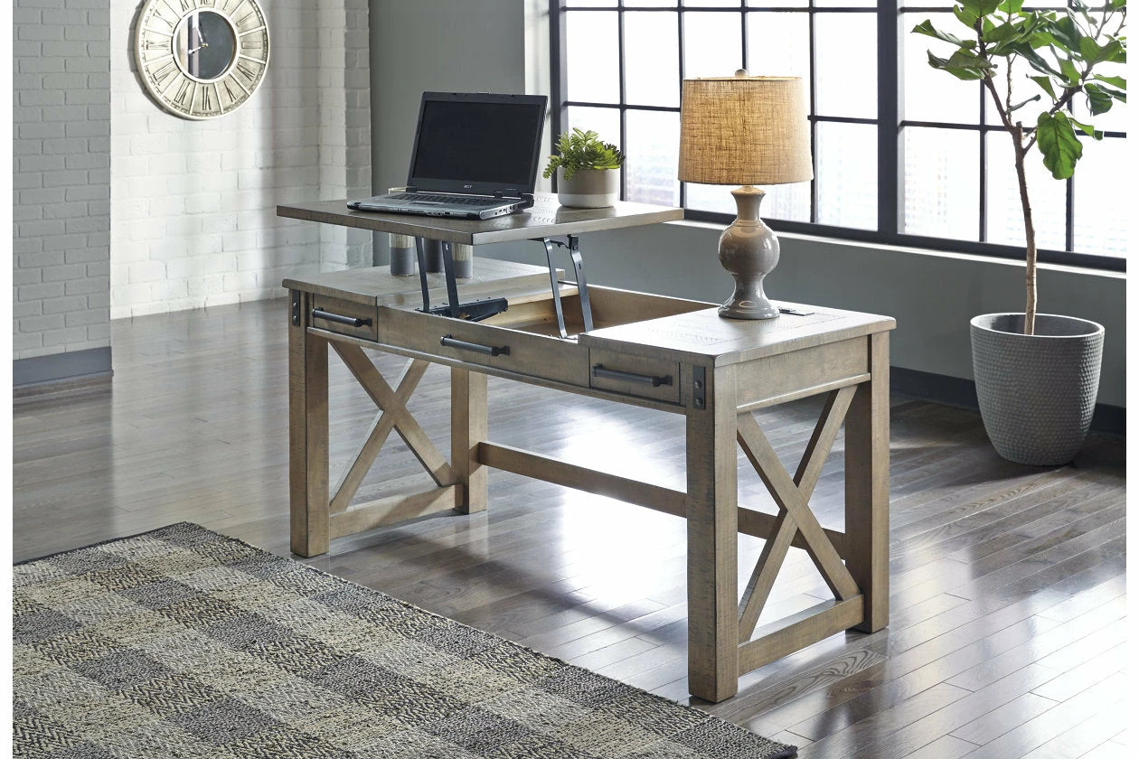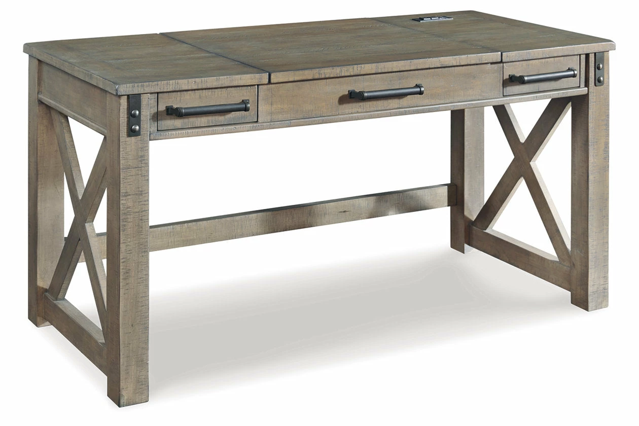 Crafted with pine veneers and wood treated to a distressed gray finish, this lift top desk is rustic farmhouse living at its best. Crossbuck styling adds striking flair, while metal industrial brackets incorporate an industrial twist. Elevating the functionality of this lift top desk all the more: two smooth-gliding drawers and conveniently placed AC power/USB plug-ins.