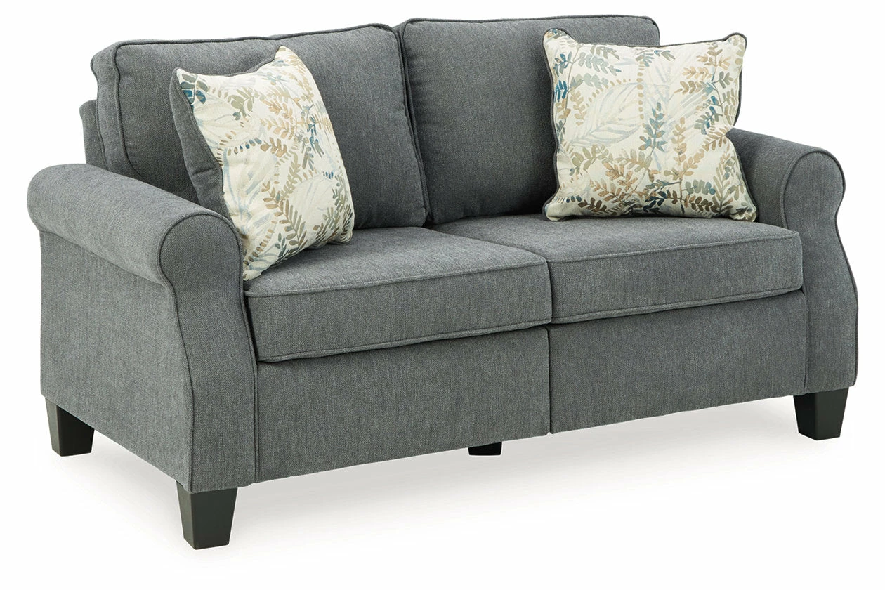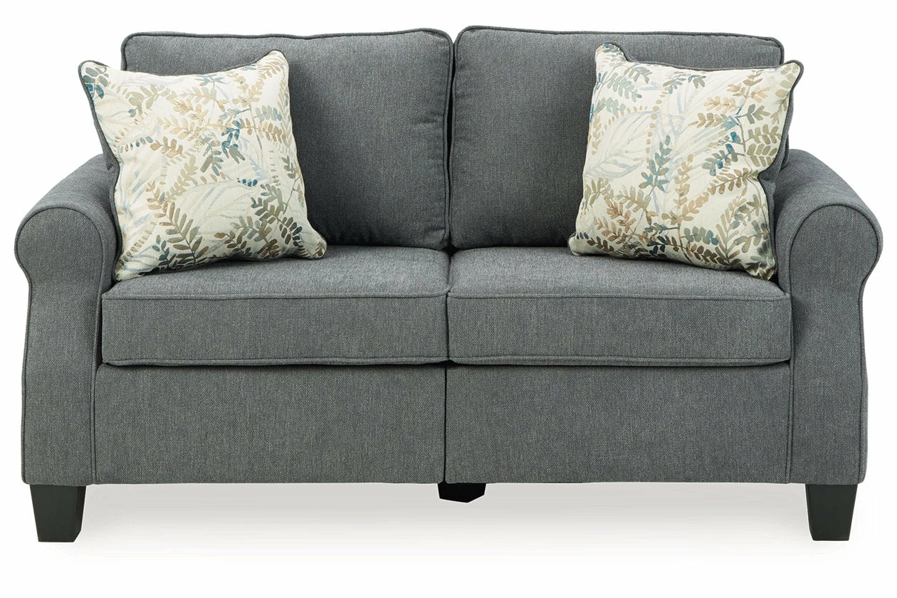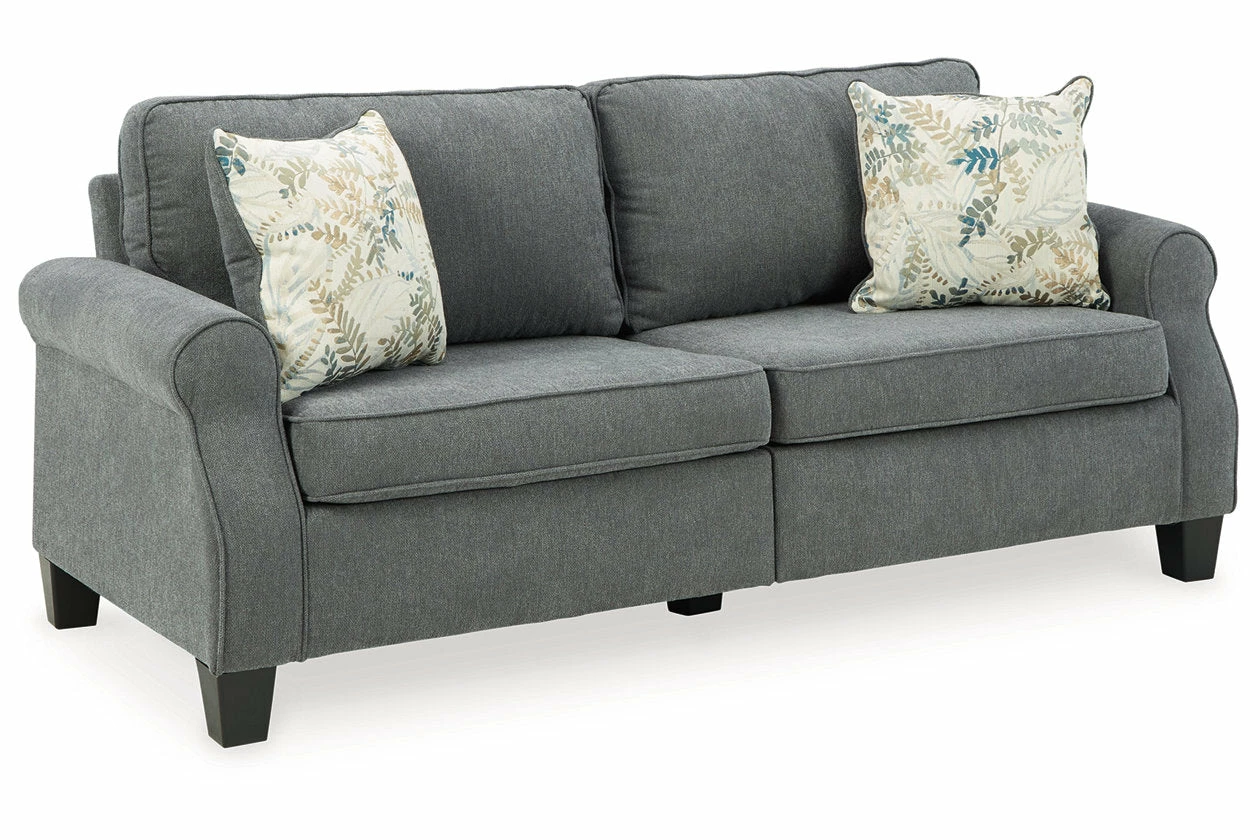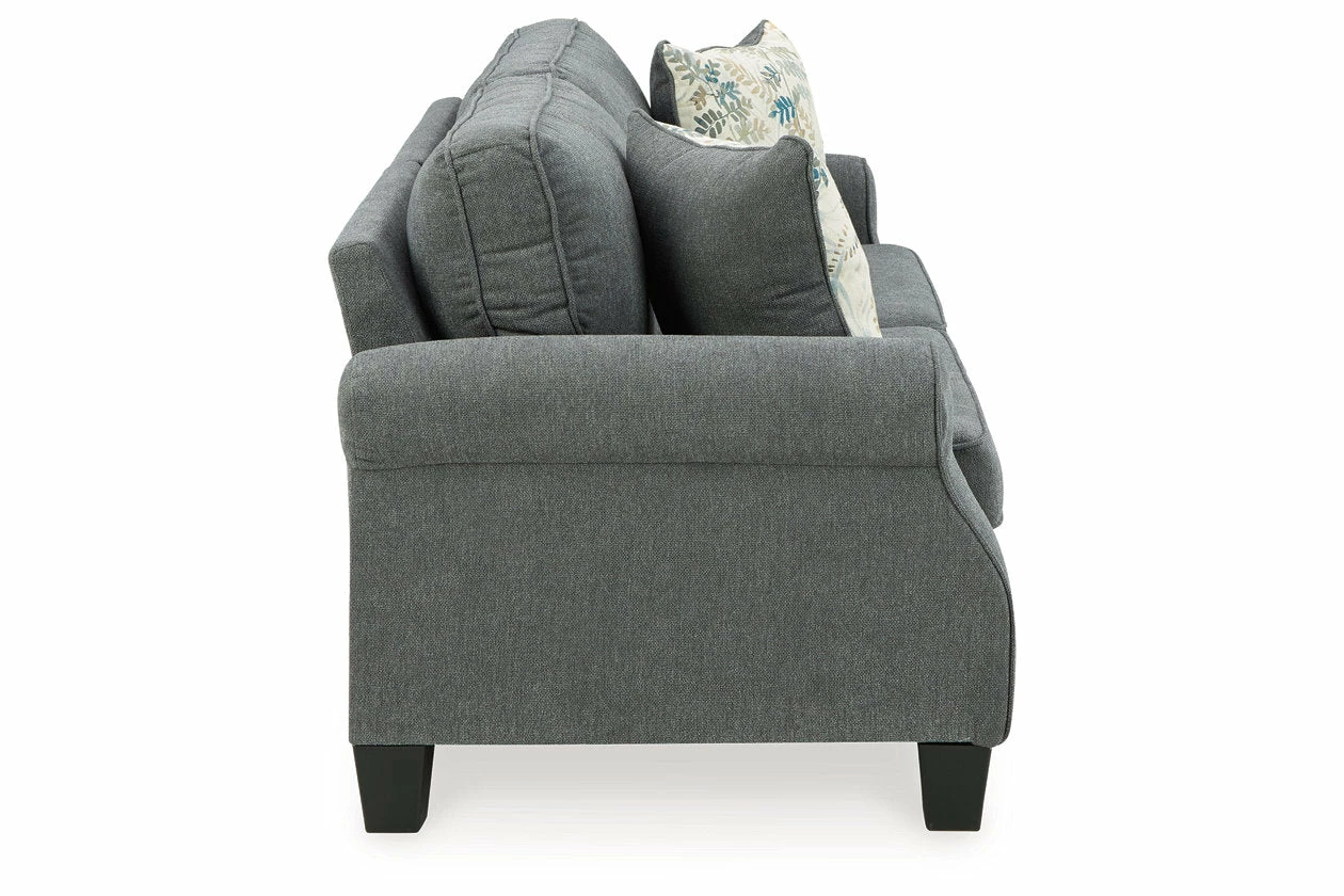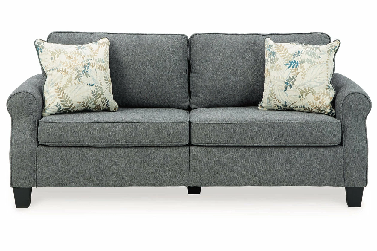 Whether your home is adorned with contemporary or American classic furnishings, this sofa has a timeless sense of elegance that’s sure to fit right in. Signature elements include roll arms and cutaway side profiling for added flair. Richly neutral and soft to the touch, the charcoal blue fabric is a brilliant reflection of your good taste that’s right on trend. Rounded cornering gives the box cushions a softened, tailored aesthetic that makes the sofa a great transitional piece of furniture.