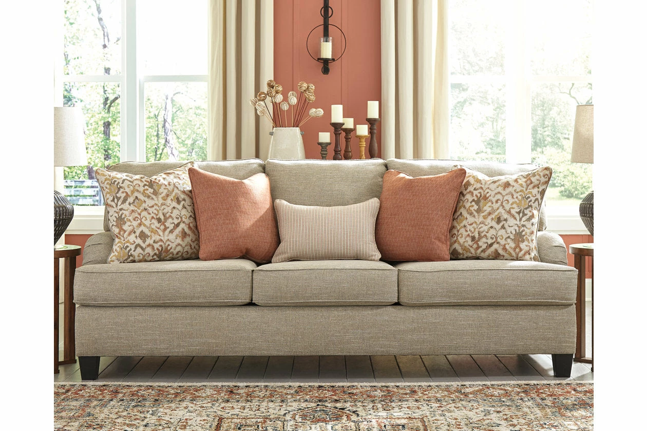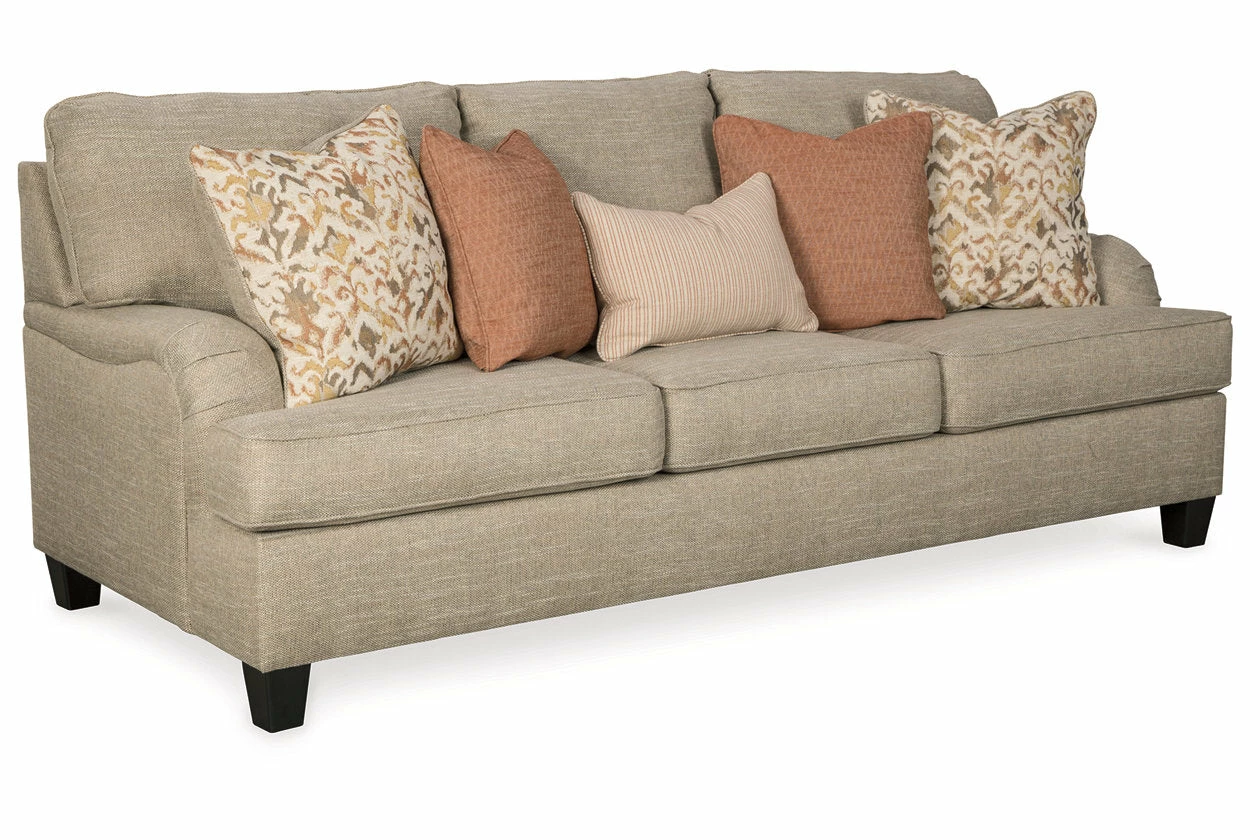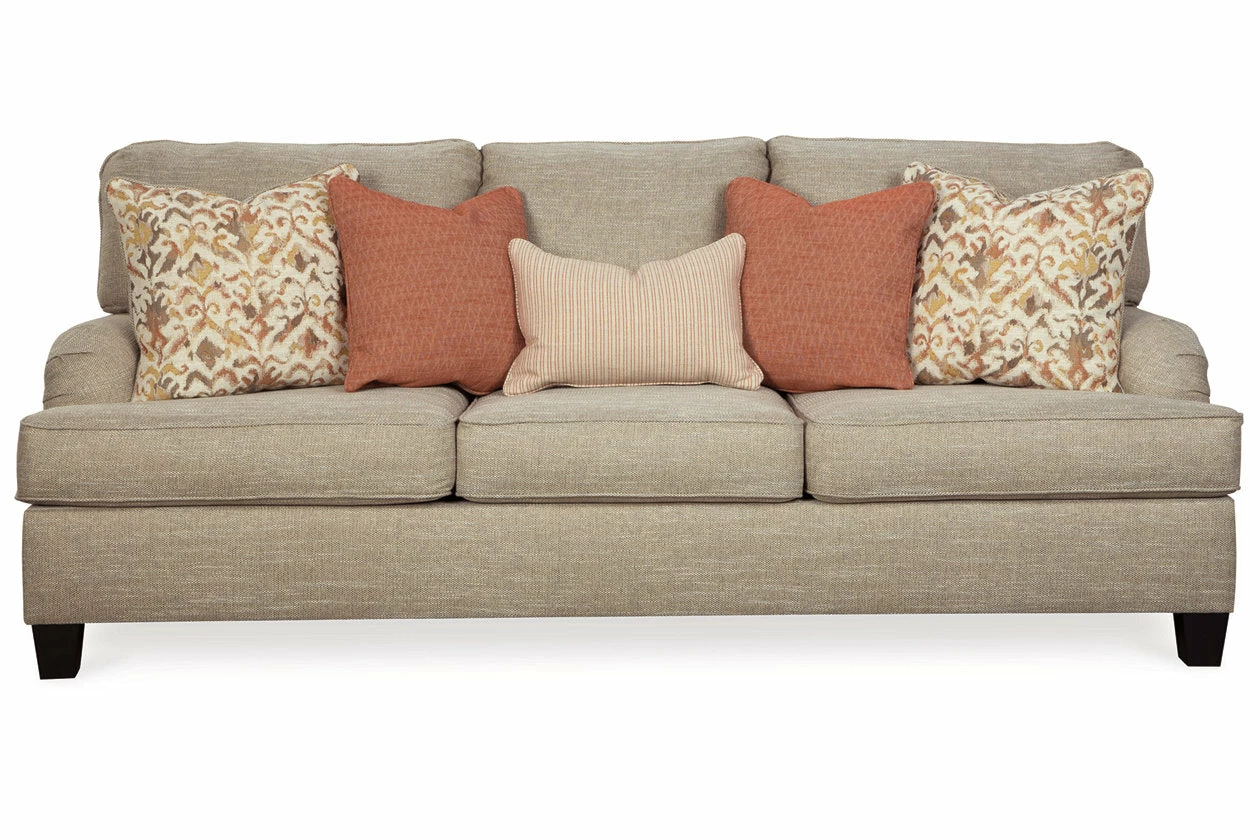 With its elegant Charles of London arms, soothing shades and sumptuous comfort, this sofa brings a classic look beautifully into the present. Loaded with multi-tonal interest, the sofa’s wheat-hue upholstery is a fresh choice in neutrals. Marvelously muted accent pillow collection includes ikat patterning, diamond texturing and a fresh laundry stripe for a warm, cozy feel, while clean-lined tapered feet in a dark finish infuse a sense of modern appeal.