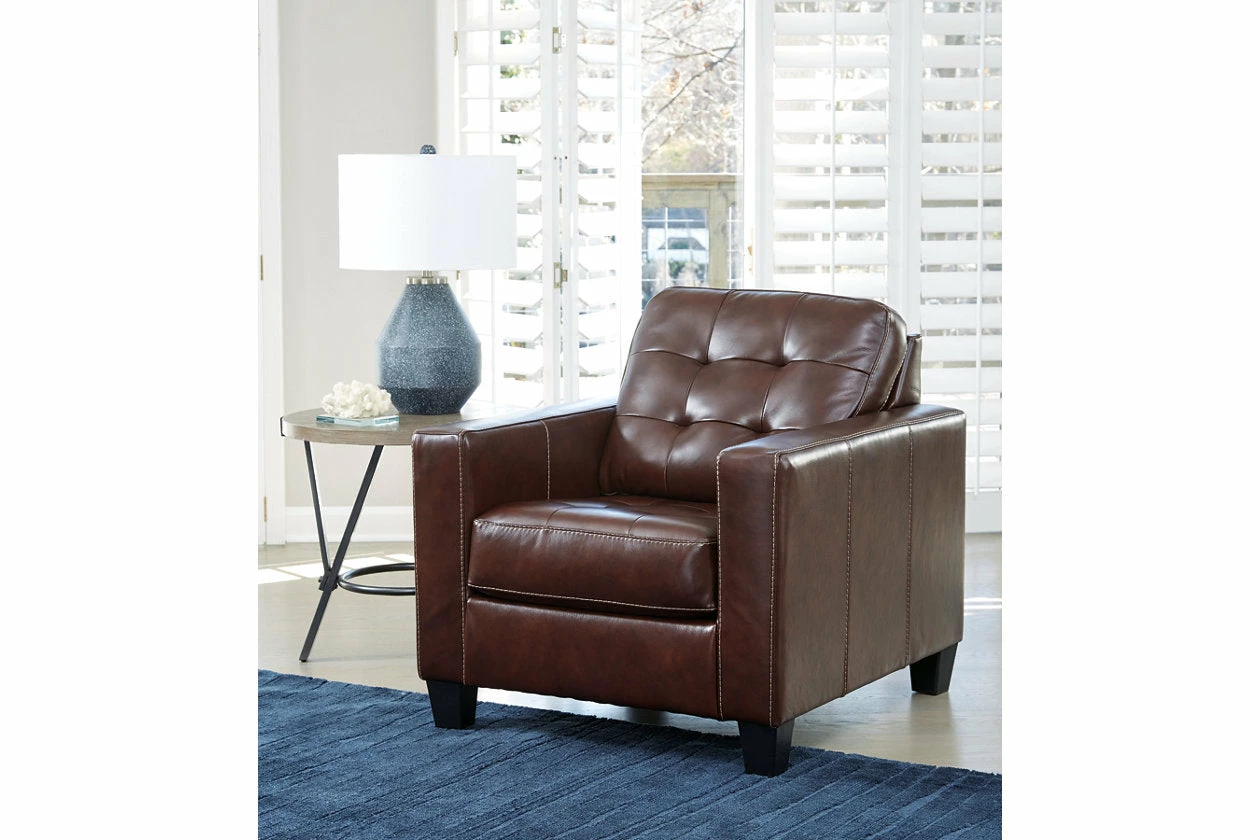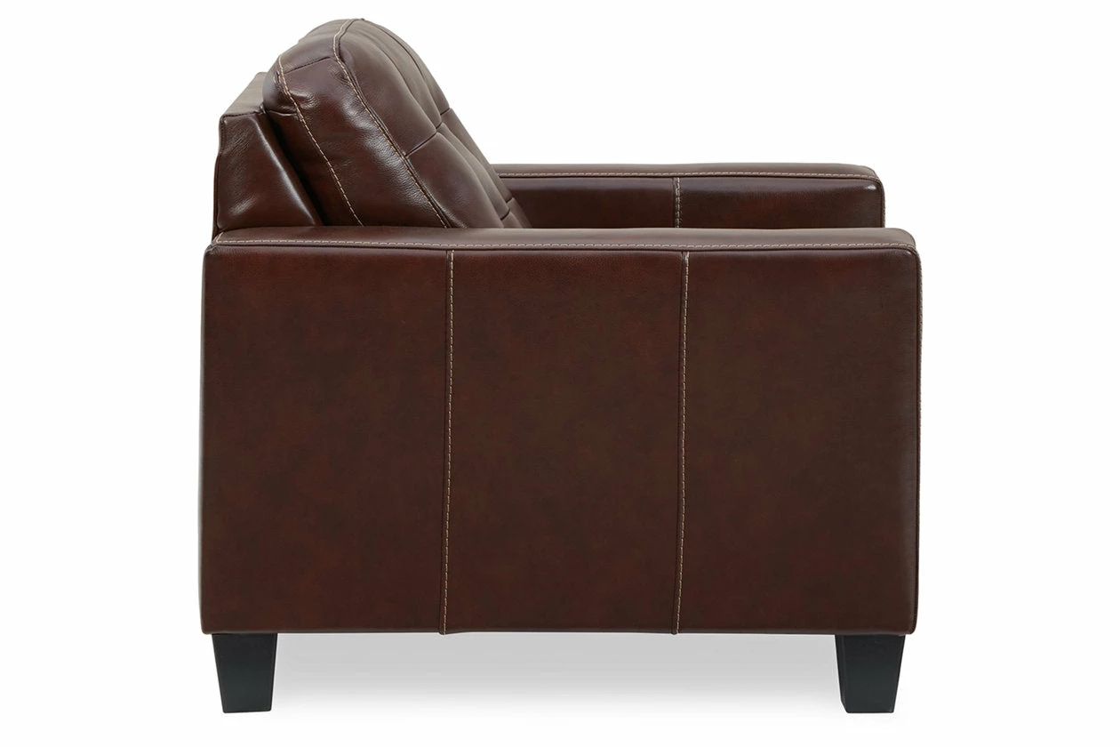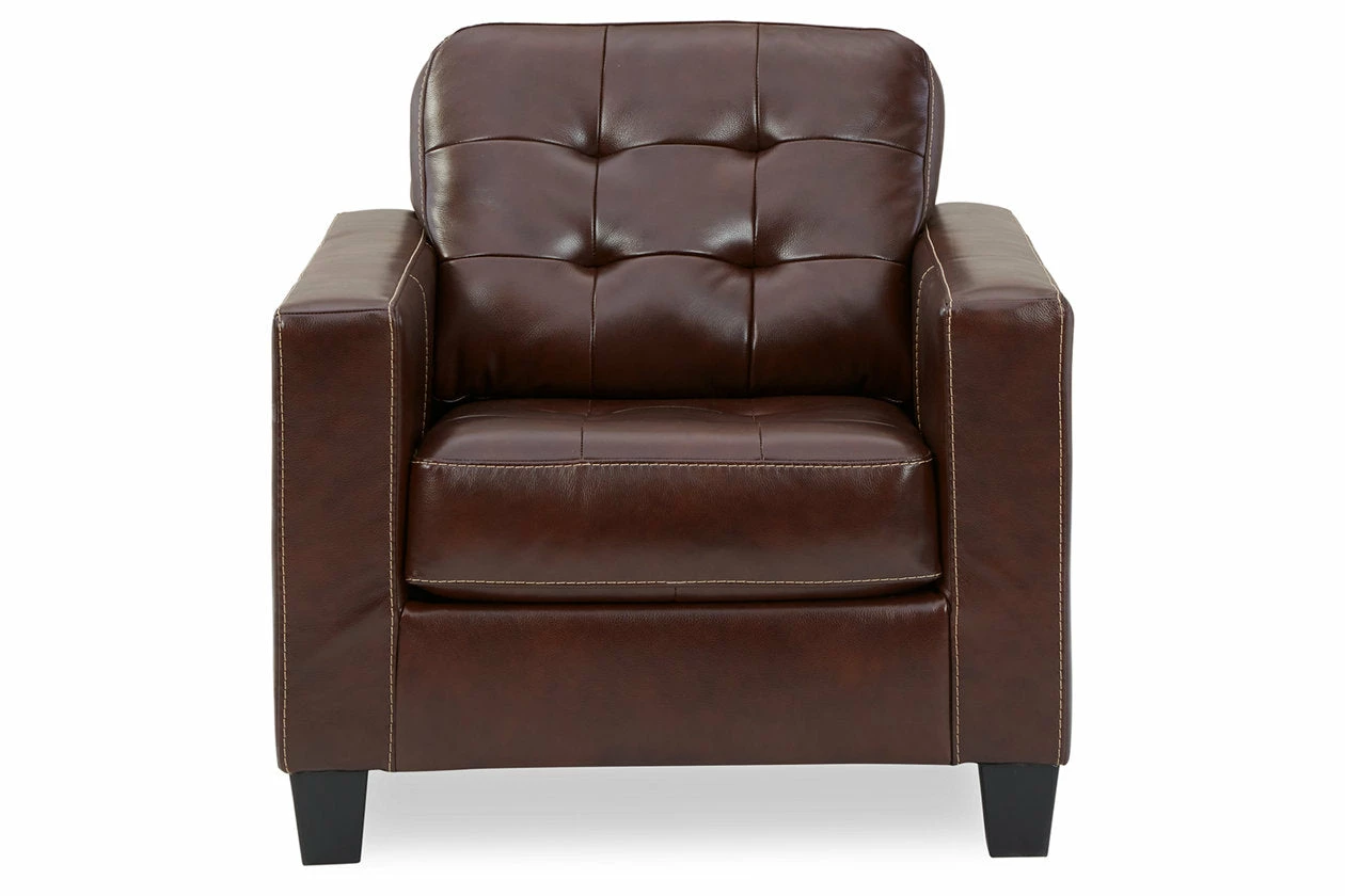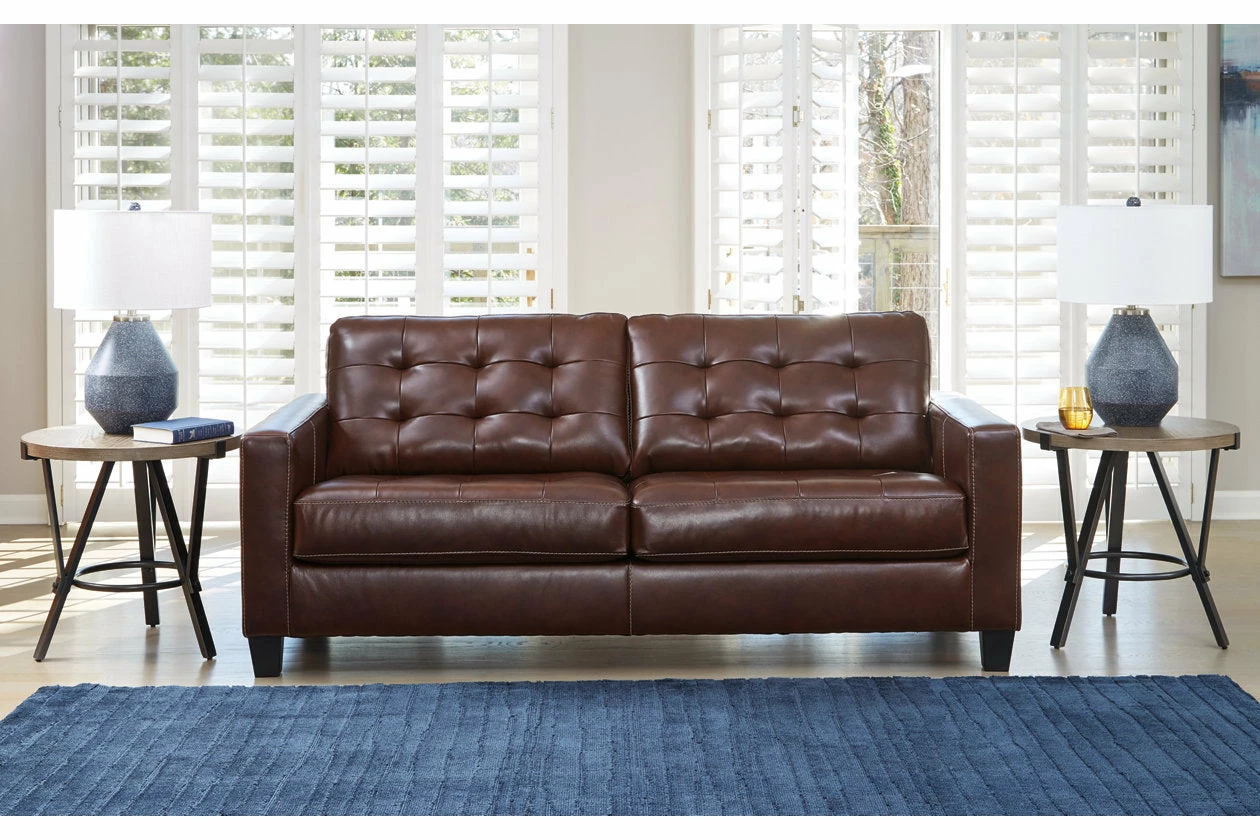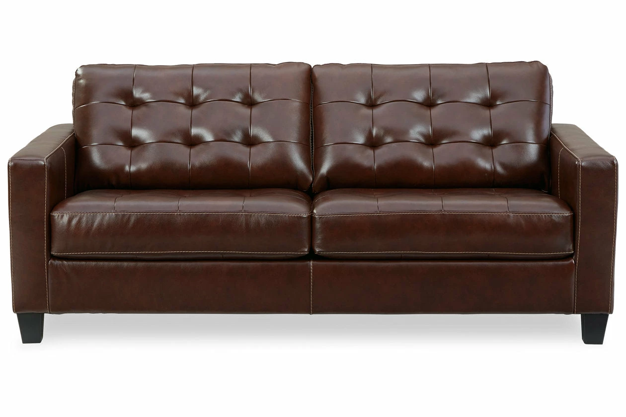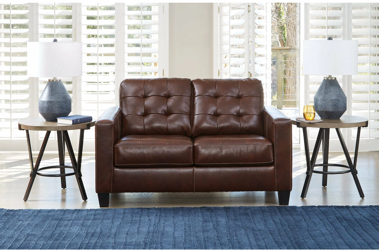 Tailor your space with the tidy structure of this loveseat. Decorative stitching and button tufting on the box cushion make for a very neat appearance. With combination leather and faux leather upholstery, this piece prioritizes luxury at a price you can afford.