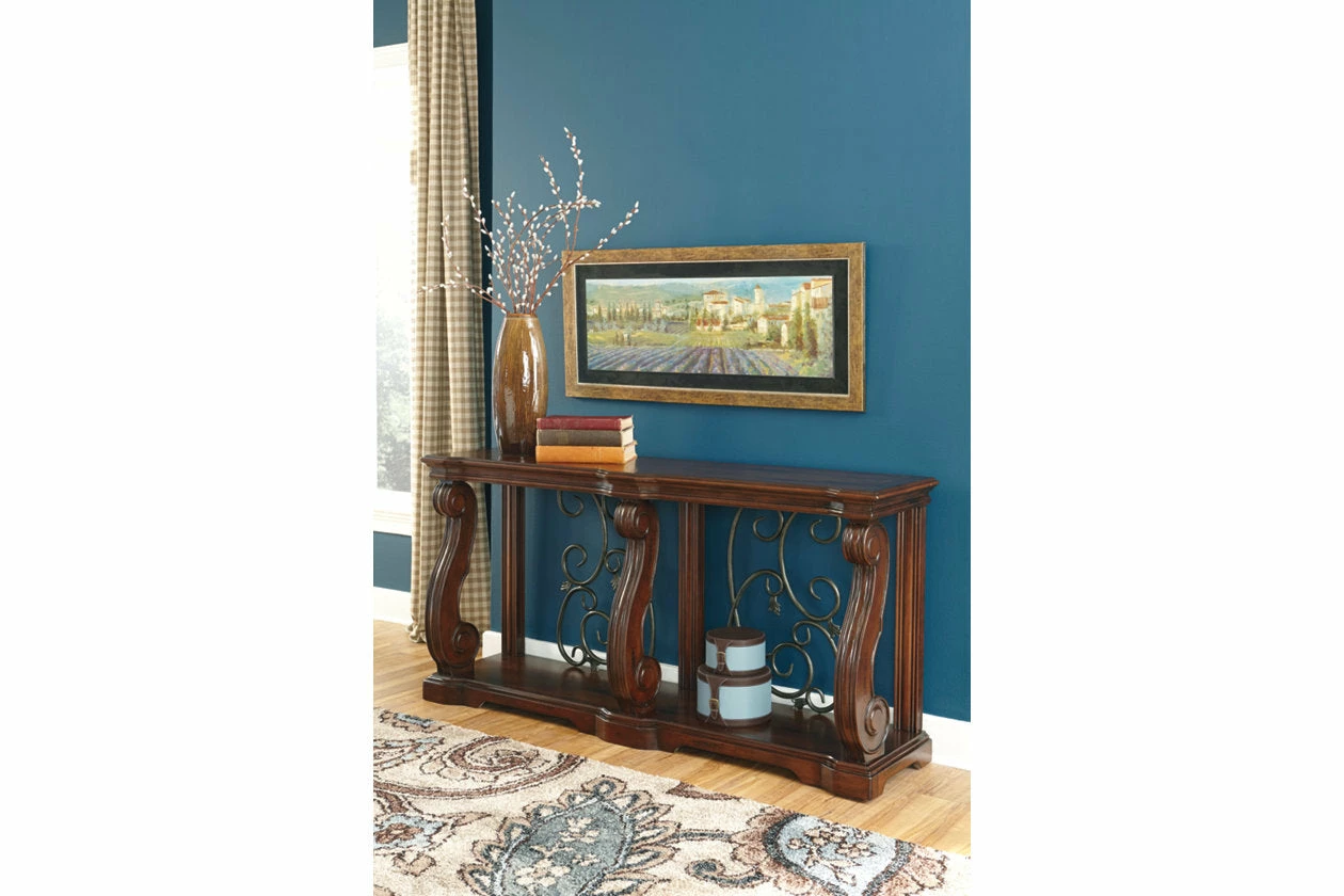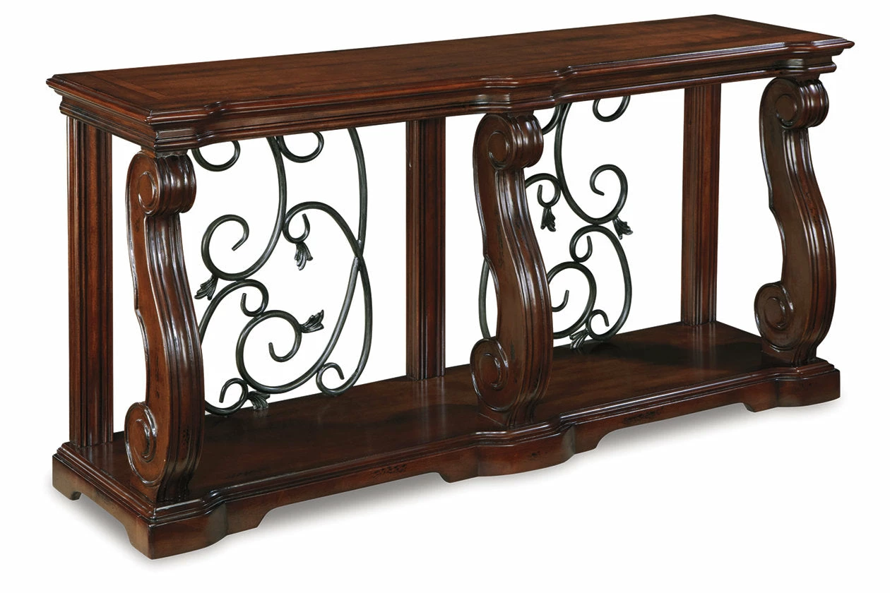 Rich wood and rustic metal work so well together in this sofa table. We love how the curvaceous shape of the table’s serpentine legs is echoed in the scrolled metal accents—for a modern-classic style that’s substantial without being heavy. A fixed shelf provides display space for your favorite whatnots, adding function to great form.