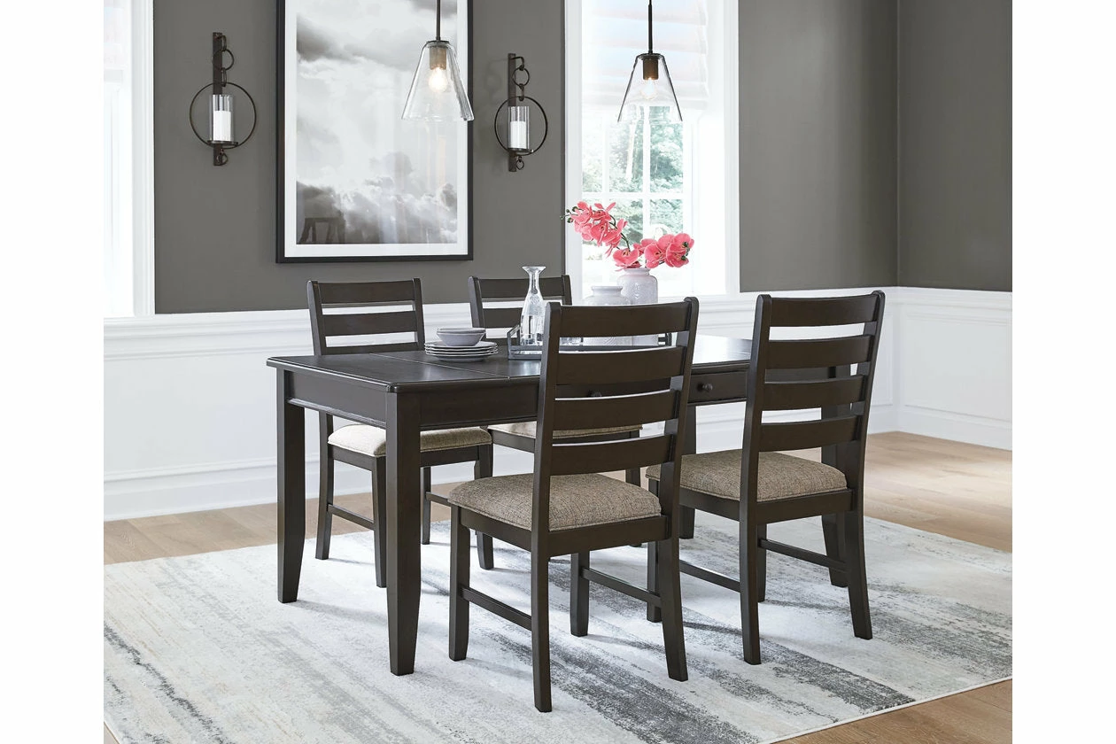 Serve up style and comfort in your dining room seating with this dining package. Perfectly suited to accommodate family dinners or the occasional work from home arrangement, its warm brown wood finish adds a touch of allure to your space. This set is sure to satisfy your appetite for great form and function.
