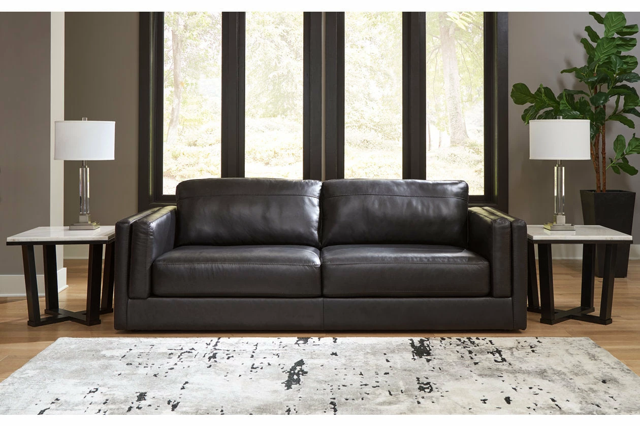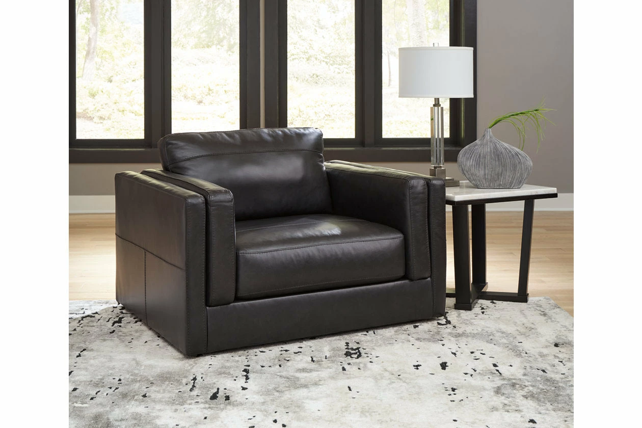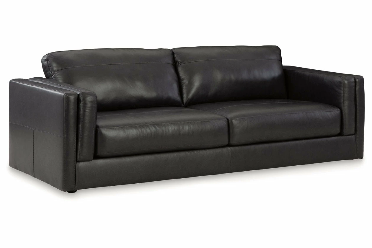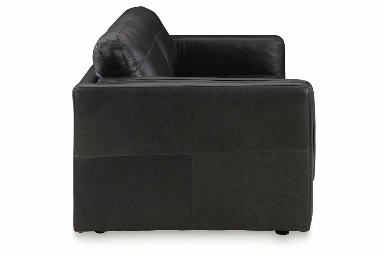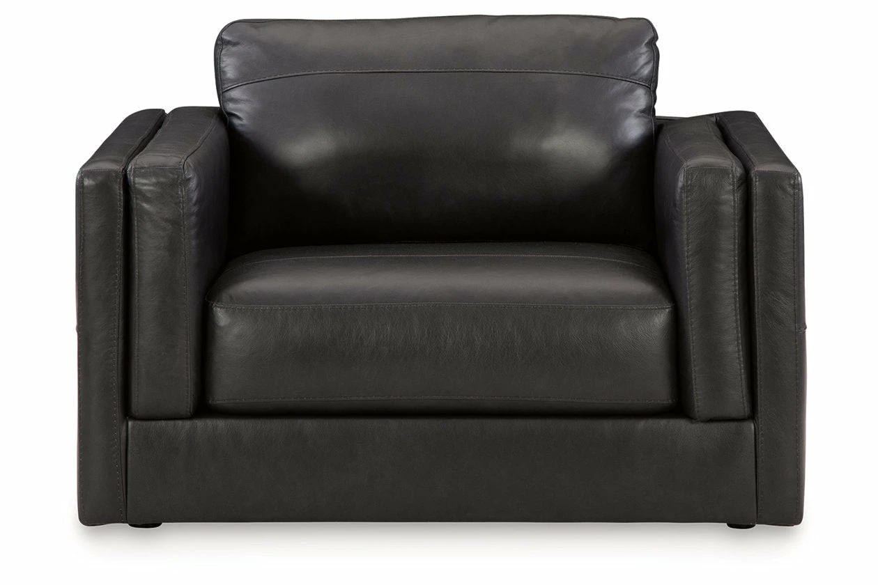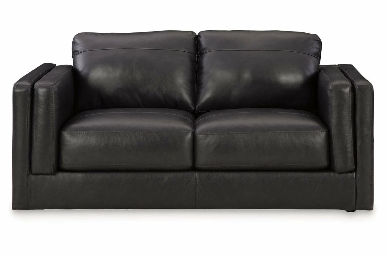 Keen on crisp, contemporary design? Adore the pleasure of leather? Look no further. This loveseat satisfies on every level. Richly textured and decadently supple, the cushion is wrapped with combination leather and faux leather upholstery in an on-trend onyx tone. Sleek double-padded arms and a low, clean-lined profile complete the spacious loveseat’s simply chic appeal.