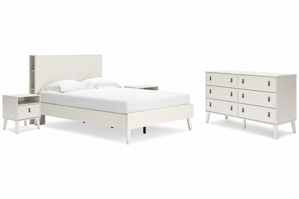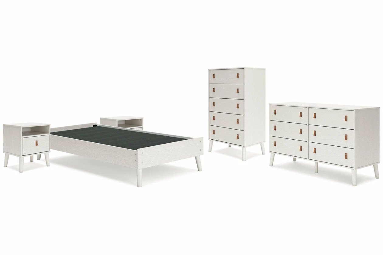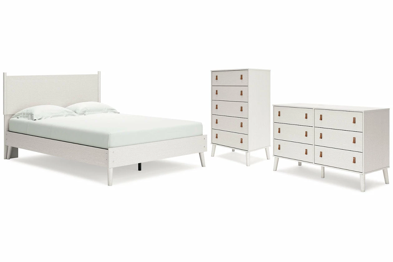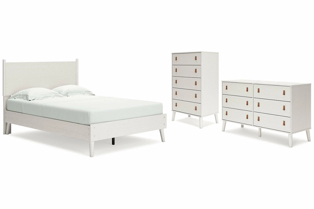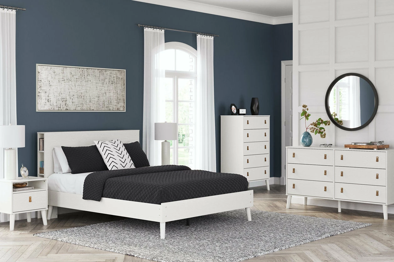 Dare to take minimalism to the max. This bedroom package has an air of sleek simplicity thanks to its white painted finish with subtle replicated wood grain. Magnificently mod splay legs are a compelling complement to the set’s streamlined design. Two sets of faux leather pulls in light brown and gray allow you to customize the drawers to suit your space.