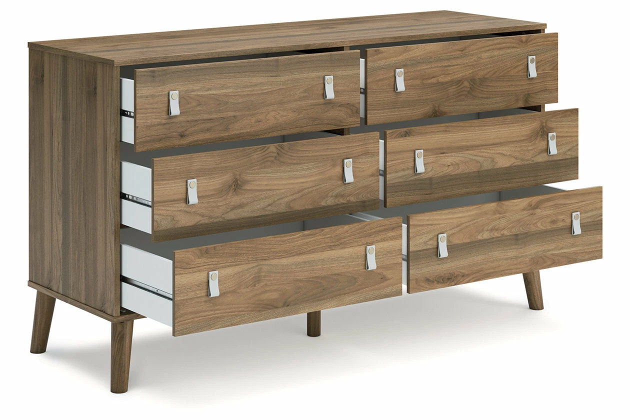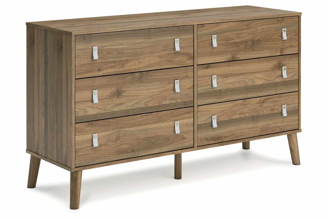 Dare to take minimalism to the max. This dresser has a richly relaxed feel thanks to its honey brown finish over replicated wood grain. Magnificently mod splay legs are a compelling complement to the streamlined design. And with two sets of faux leather drawer pulls that allow you to customize the dresser to suit your space, there’s no doubt about it: This contemporary piece is sure to become a classic.