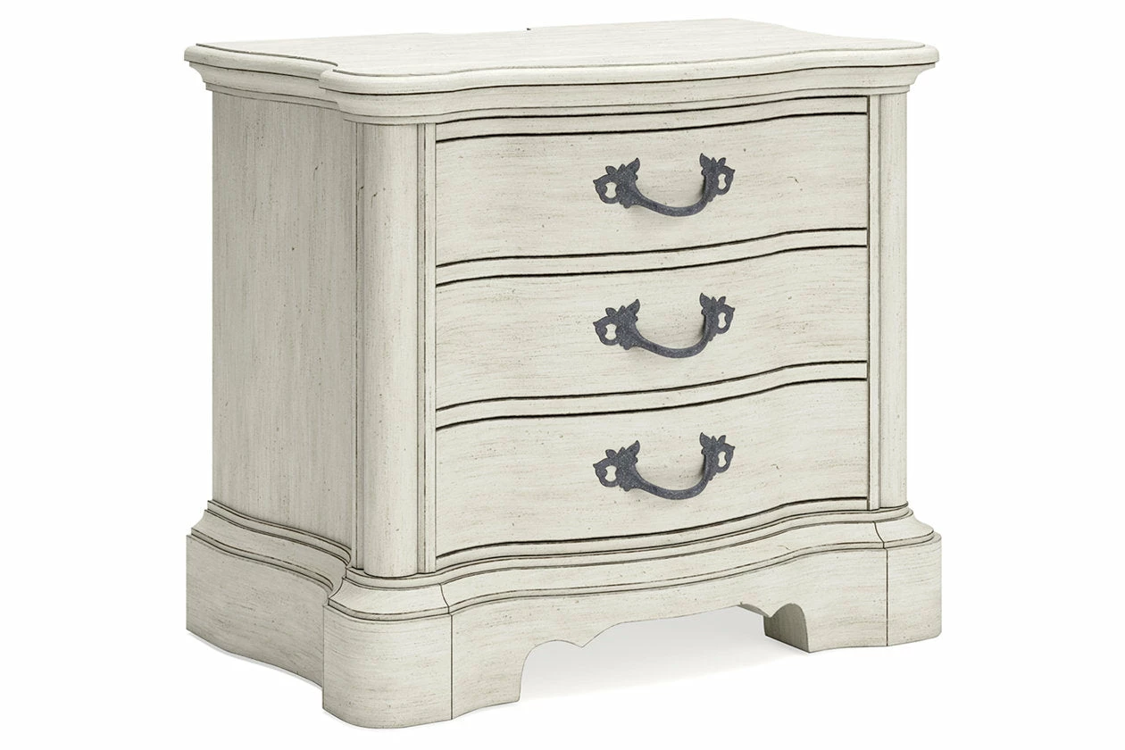 Add a touch of romance to your bedroom with this nightstand. Its antiqued white painted finish and serpentine-shaped silhouette are the definition of easy elegance. The nightstand’s three spacious drawers accommodate bedside essentials, while an integrated power outlet and USB charging keep up with your high-tech lifestyle.