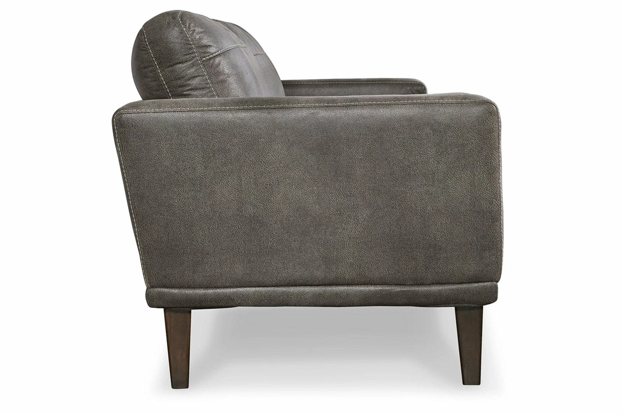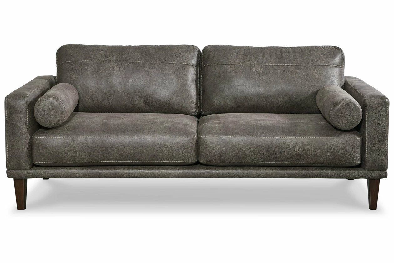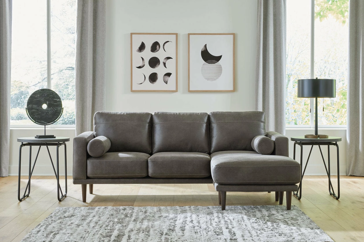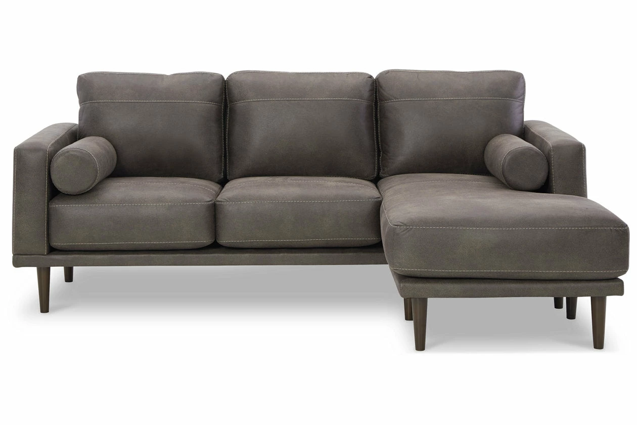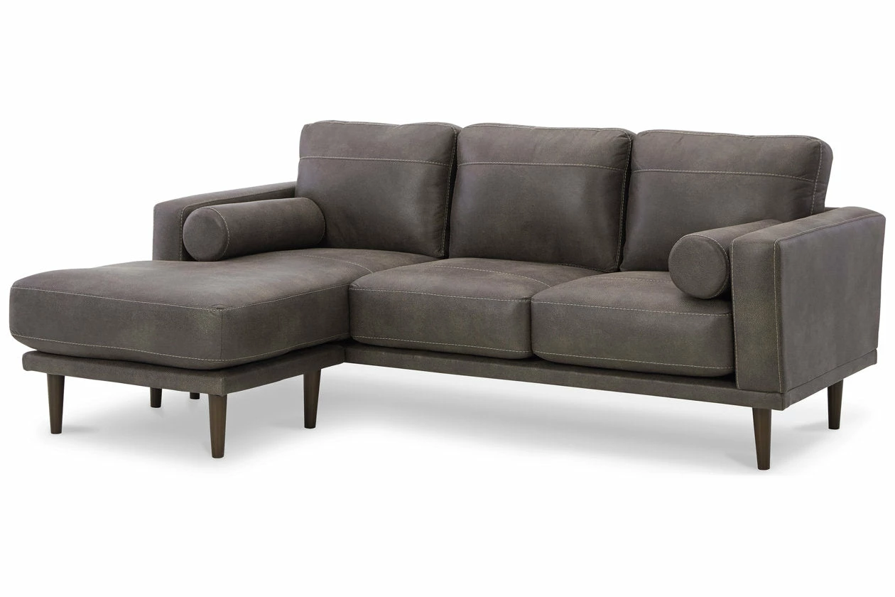 For a fresh spot in your space, turn to this sofa chaise. The invigorating piece breathes warmth into your home with its soothing smoke-colored faux leather upholstery, modern bolster pillows and tapered legs. Wind down at the end of a long day and sink into this canyon of comfort.