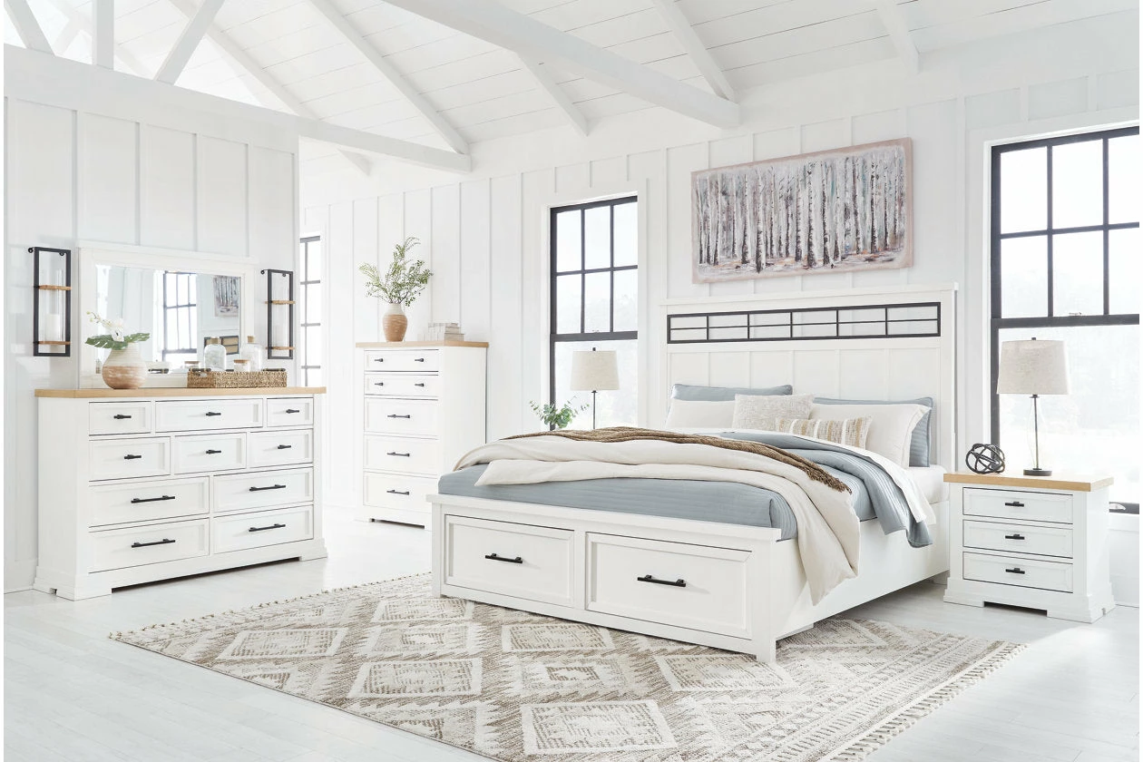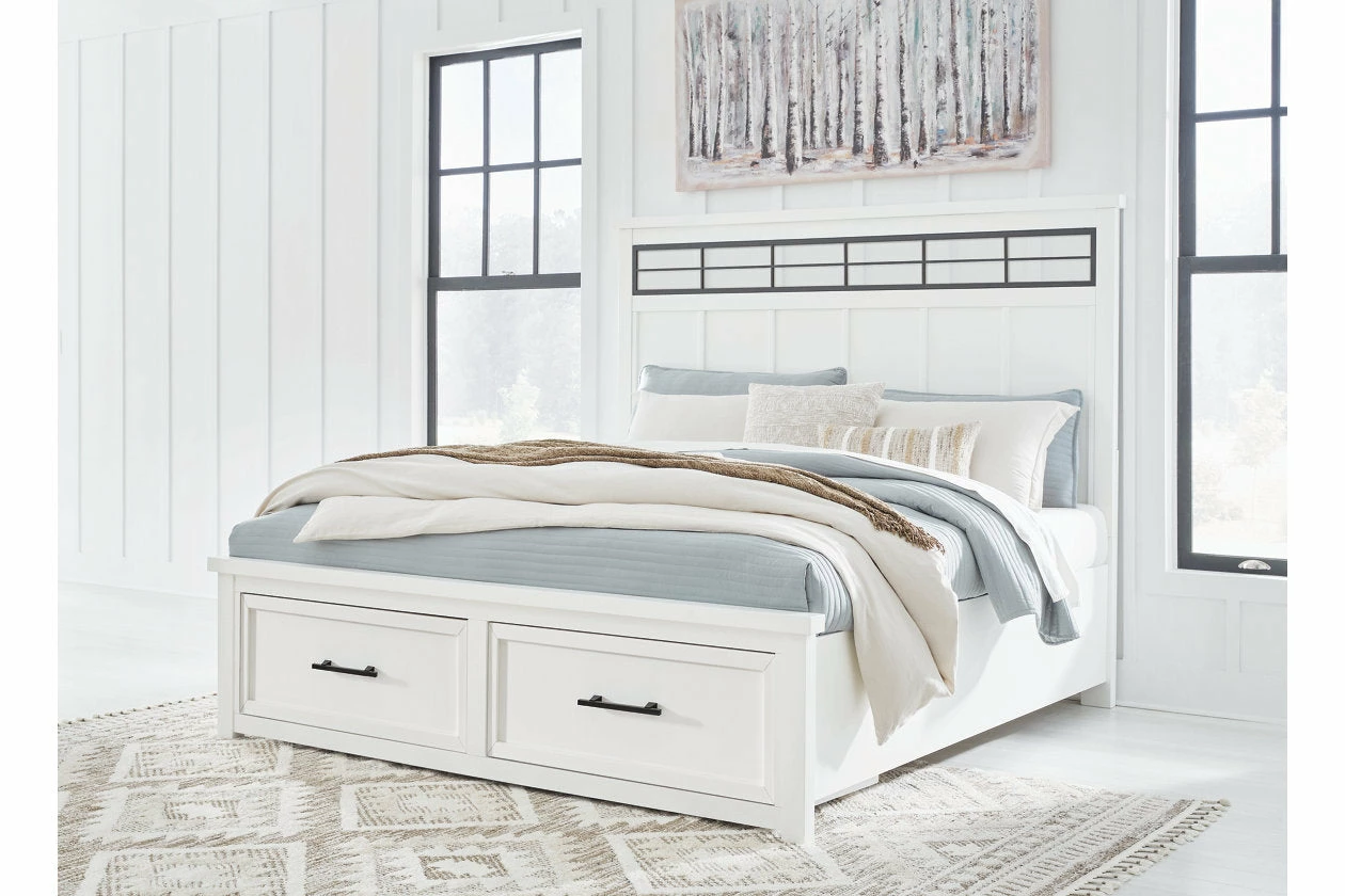 This California king panel storage bed delivers casual style with substance. An inset metal detail on the headboard displays a unique take on modern farmhouse design. The bed’s sturdy silhouette, classic white finish and black pulls exude a comfortably cozy vibe in your soothing sanctuary. Storage drawers are spacious enough for all your essentials.