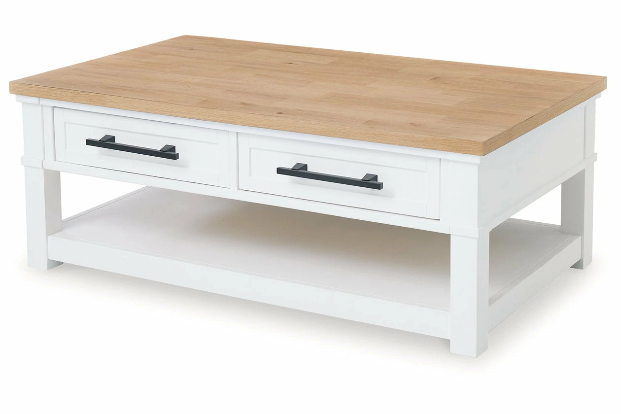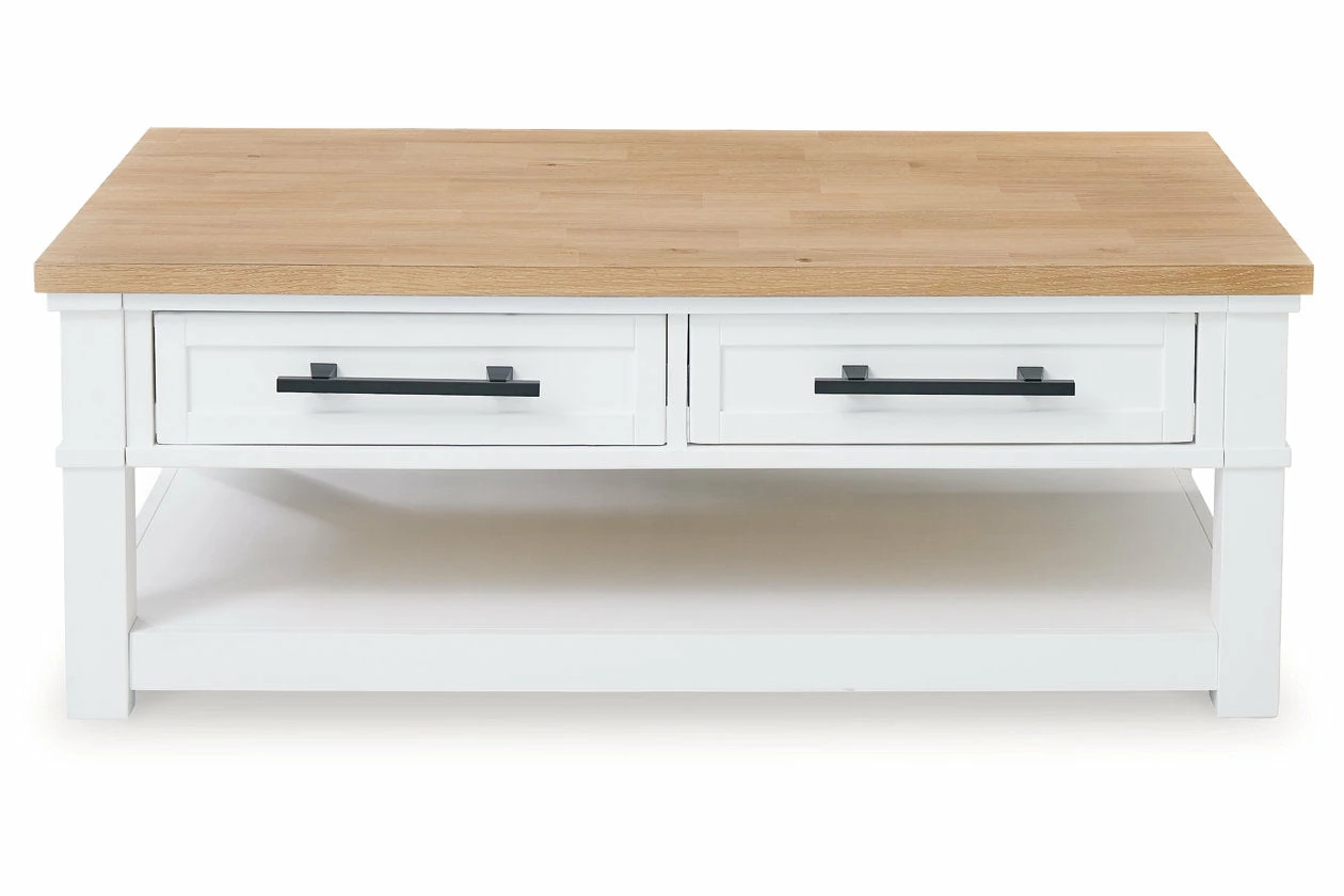 Casual style with substance. This two-tone coffee table raises the bar on comfortably cozy design. A sturdy silhouette with a classic white finish and black metal hardware exudes modern farmhouse vibes. The butcher block oak veneer top adds a relaxed aesthetic. And with two storage drawers and a lower shelf, this charmingly curated piece lets you display or tuck away.