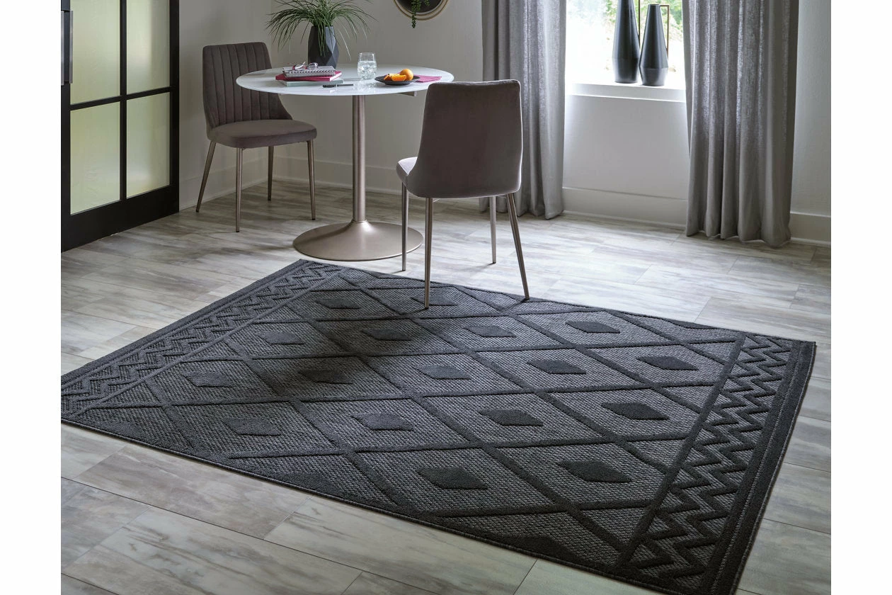 Refined in design with a bit of an edge, this rug keeps your contemporary cool aesthetic consistent in both indoor and outdoor spaces. The gray and black diamond design is luxe yet approachable, inviting stunning style from head to toe.