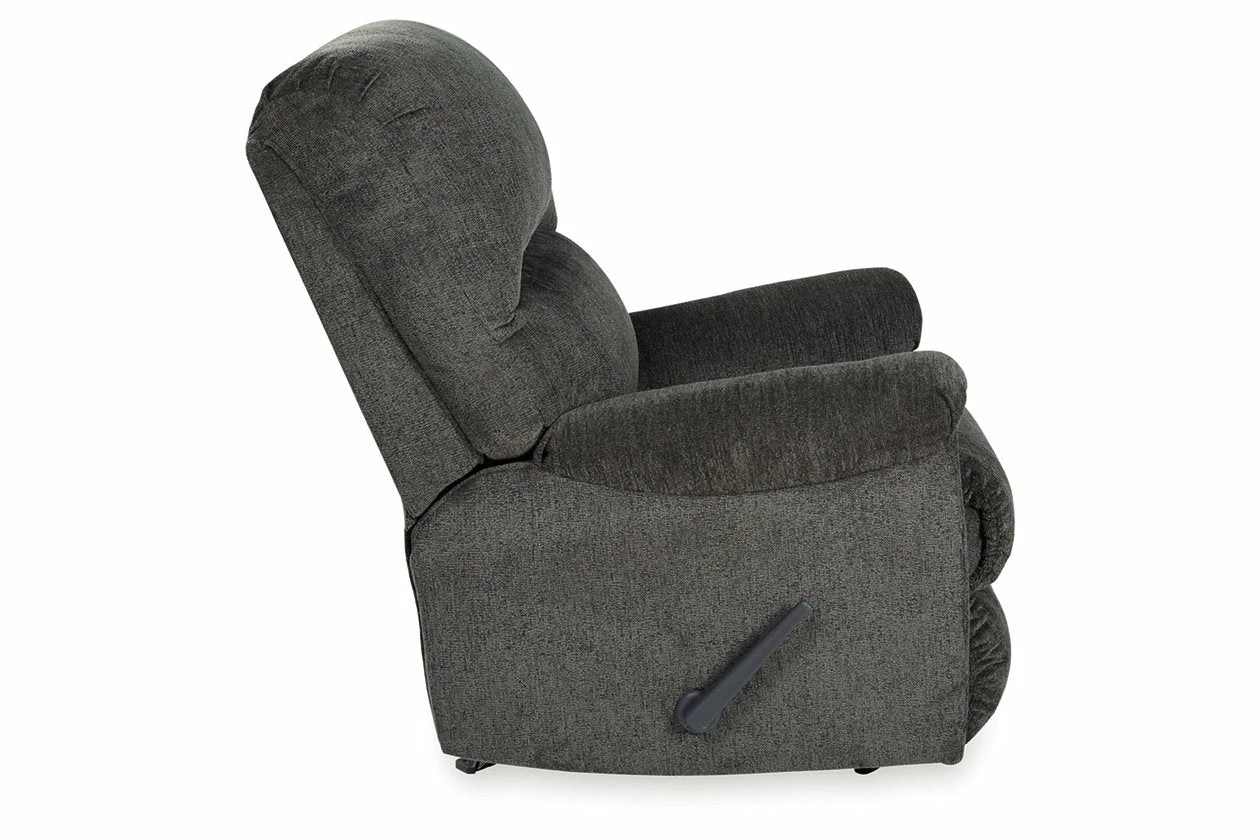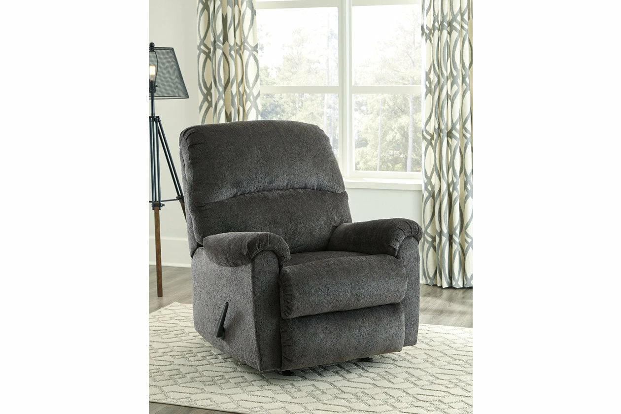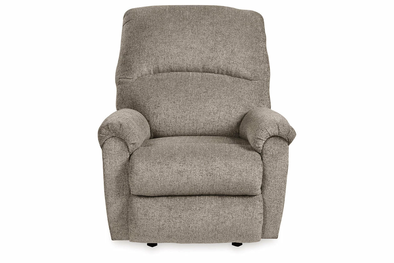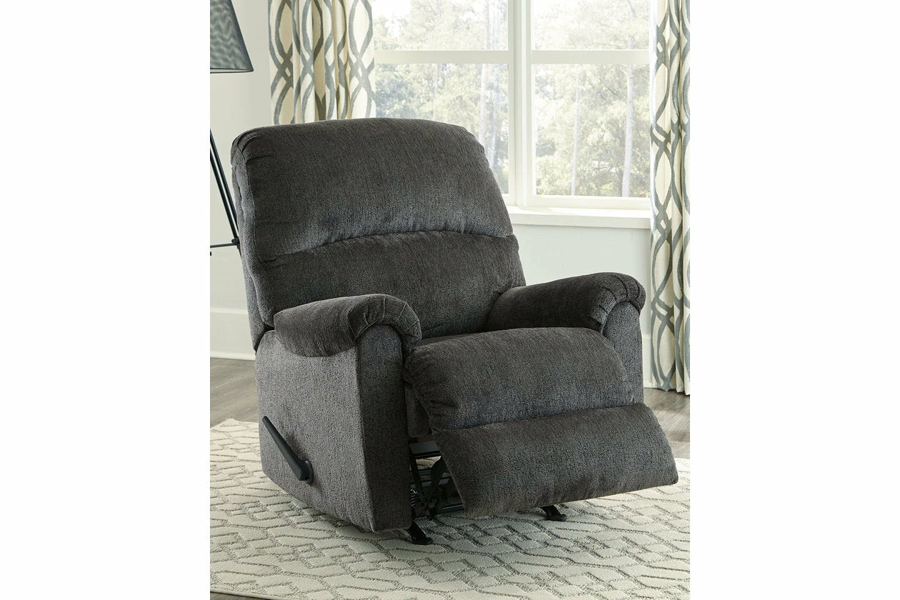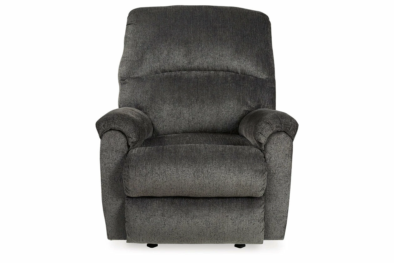 A mastery in less is more, this rocker recliner manages to make cool, contemporary design so warm and cozy. A new twist on neutral, the recliner’s soothing “smoky” gray upholstery is incredibly plush to the touch. Curved divided back and deeply tufted footrest give the clean-lined profile a sense of sumptuousness impossible to resist.