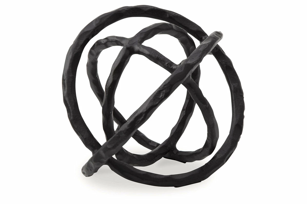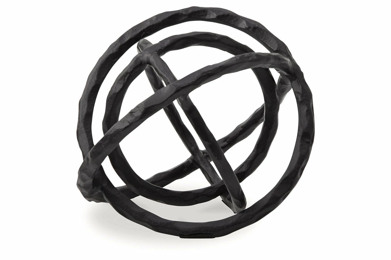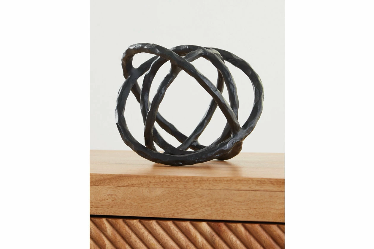This sculpture brings contemporary art full circle. Interlocking metal rings in a black finish add an art gallery touch for a console table, bookshelf or mantel.