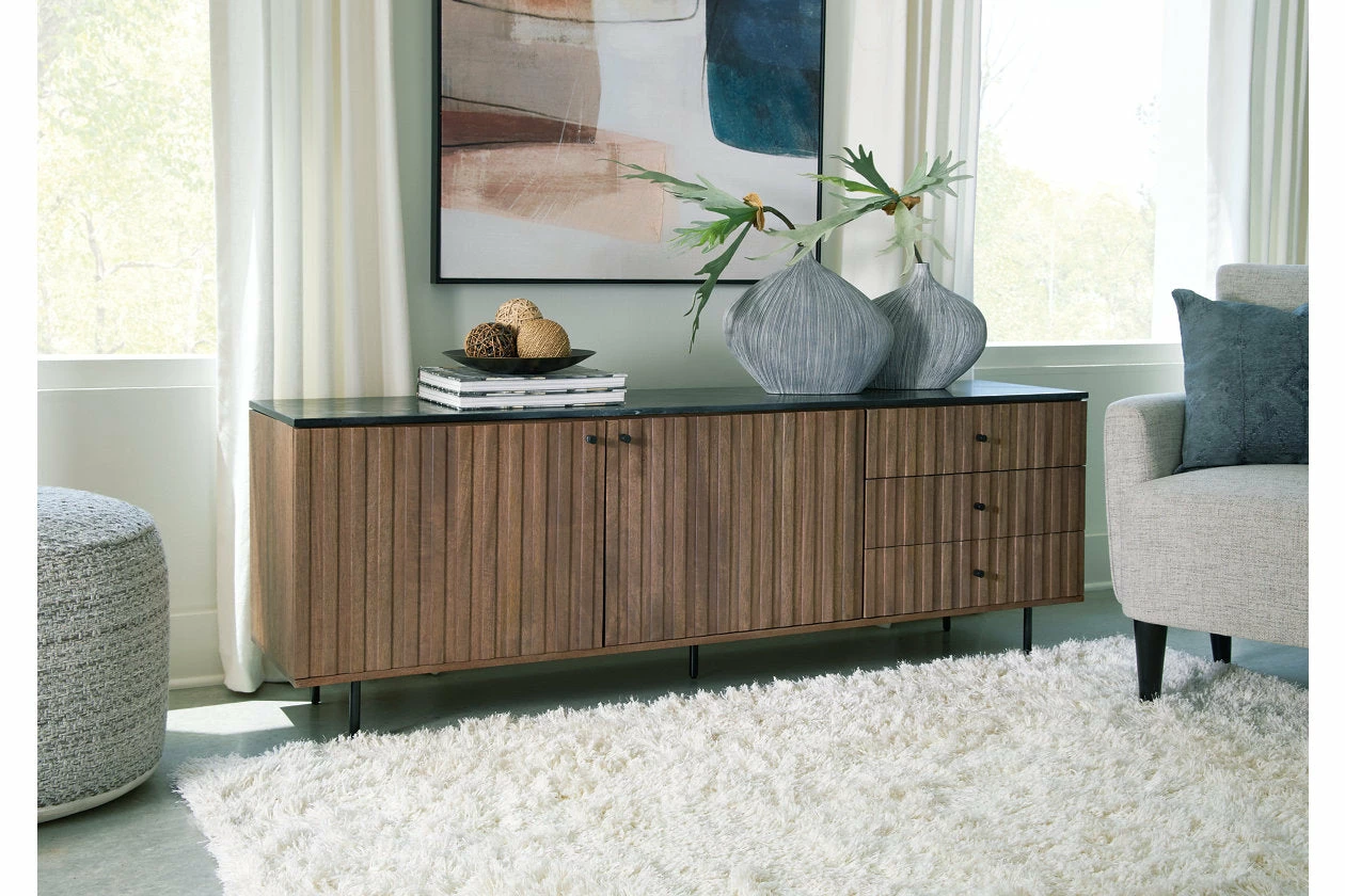 Curate a home that captures your unique eye for contemporary style with this accent cabinet. Show your knack for dynamic design with its combination of vertical striped wooden details and a black marble top. A storage cabinet and three drawers give this piece with forward-thinking flair a layer of function.