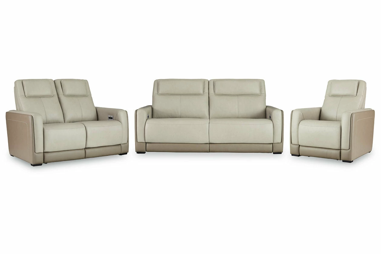 Double down on sleek style with this power reclining package. It has a streamlined, space-conscious appeal, with two-tone upholstery in neutral hues creating subtly striking visual intrigue. And with one-touch reclining, adjustable headrests and wireless charging, this set combines contemporary function and fashion in a clean-lined design.
