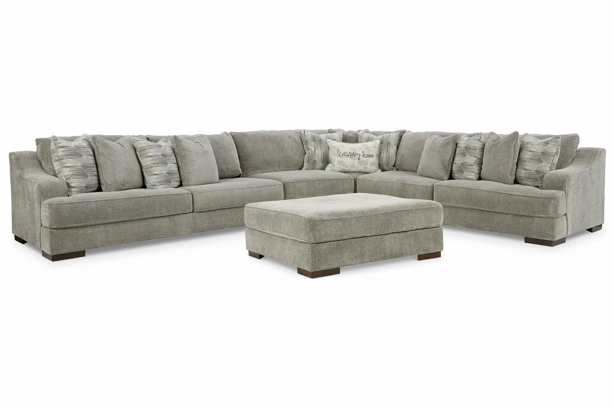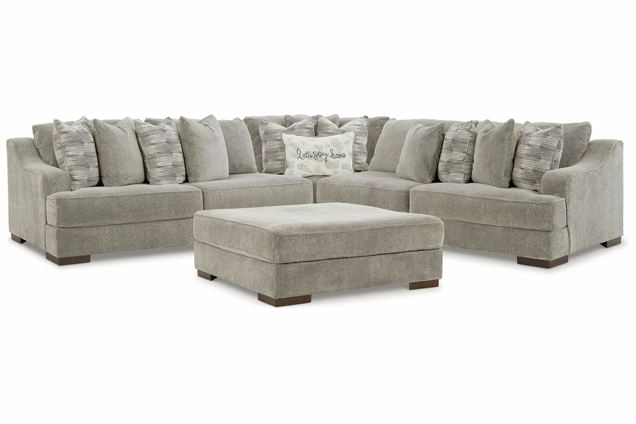 Get a leg up on comfort with this sectional and oversized ottoman package. Sumptuously soft smoke gray upholstery welcomes you with open arms. A versatile performer, these stylish pieces step in as a contemporary spot for impromptu entertaining.