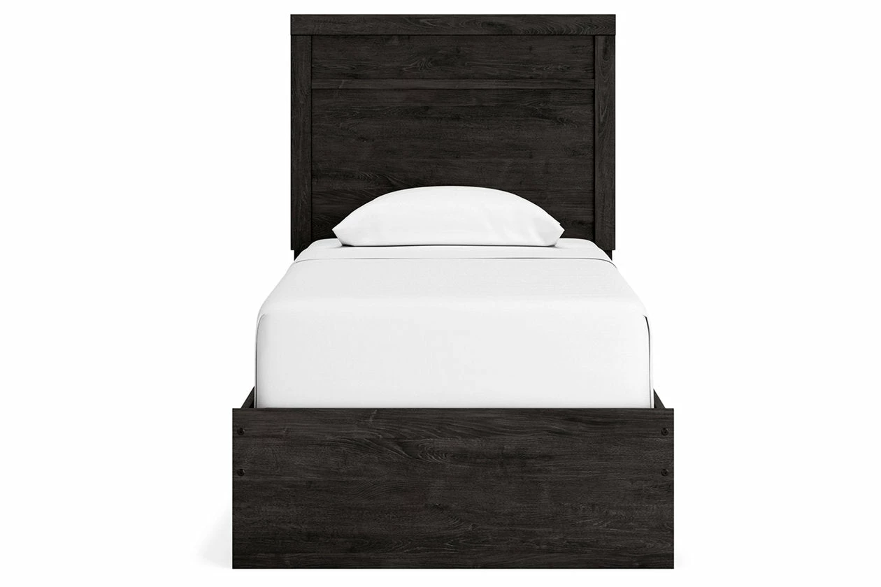 With its clean-lined look and modern attitude, this twin panel bed is a fresh style awakening. A warm charcoal hue over replicated oak grain easily complements other furniture finishes. The simple, unadorned profile is given depth and dimension with the addition of plank-style moulding on the headboard—proof that beauty lies in the details.