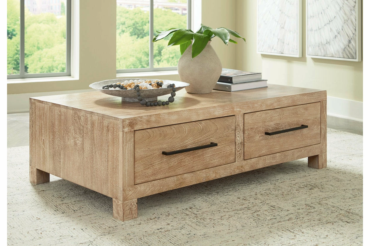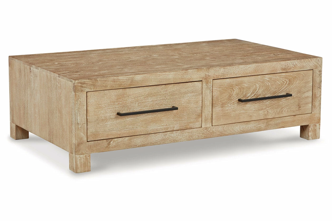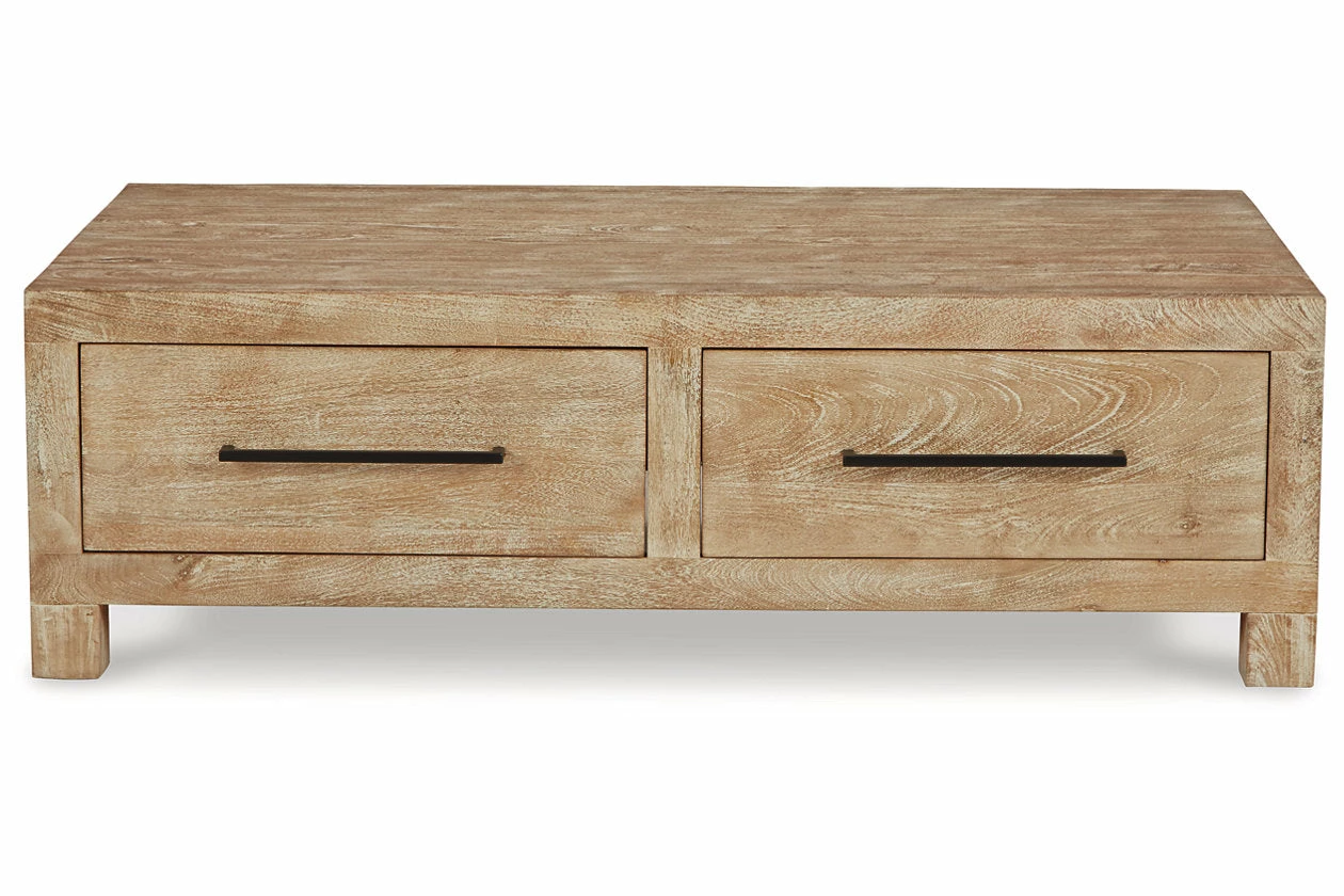 Make life simple in style with this coffee table. The classic geometric construction gets a bit of flair with a hand-applied whitewash finish over a natural hue. Bronze-tone pulls accent the four drawers, which provide easy access to storage space. Those with an eye for naturally beautiful design will love this wood table’s understated sensibility.