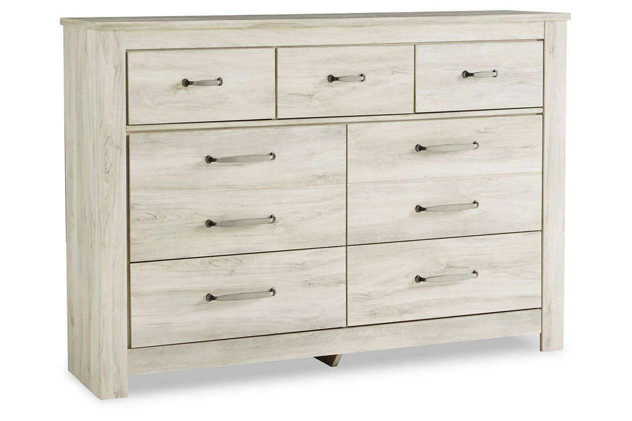 Your bedroom isn’t just a room. It’s a canvas. Express your farmhouse style with this dresser. Wispy white finish over replicated oak wood grain brightens up the space with charm. Brushed nickel-tone handles with black edging finesse the piece with a bit of shine. Drawers are spacious and lined with faux linen laminate to hold your belongings with care. This clean-lined profile is the perfect authentic foundation for inviting decor.