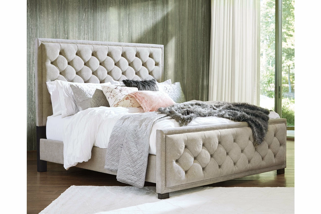 Few pieces demand attention like this upholstered bed. In addition to opulent button-tufting, its clean contemporary lines and simple symmetry have a minimalist appeal that fits perfectly in an upscale transitional setting.