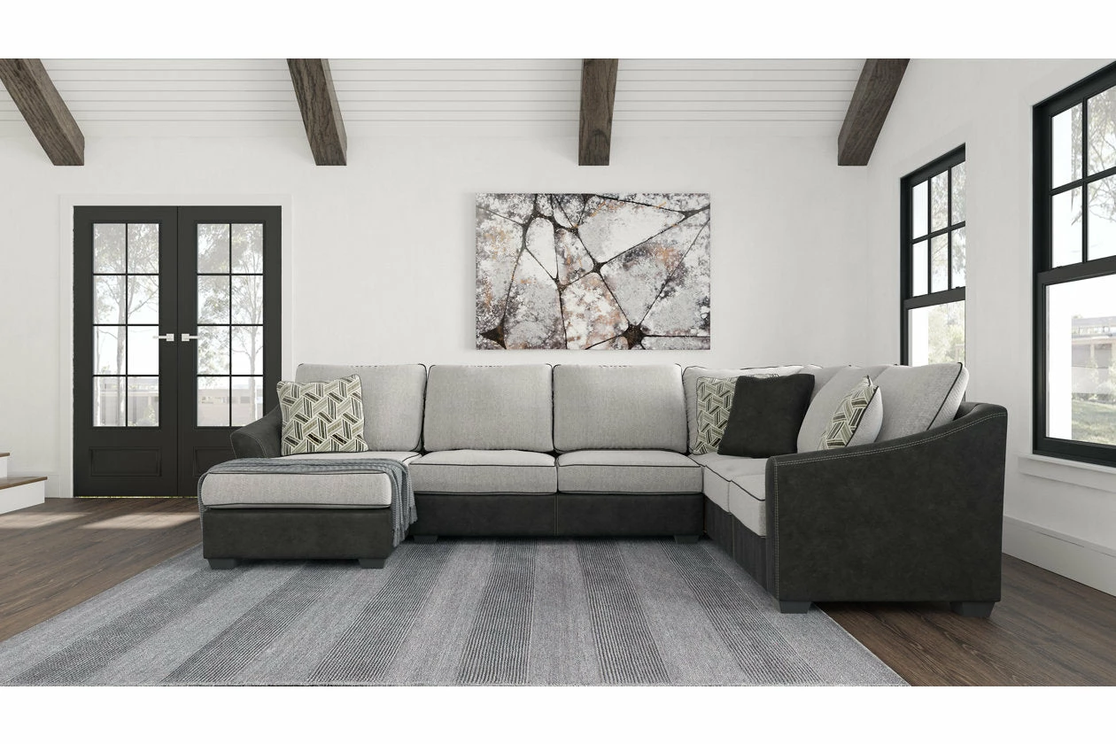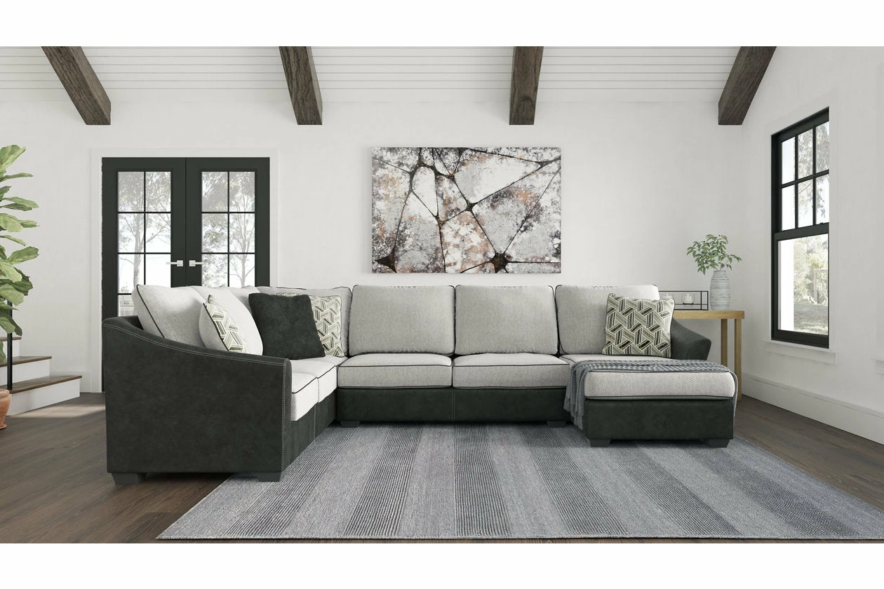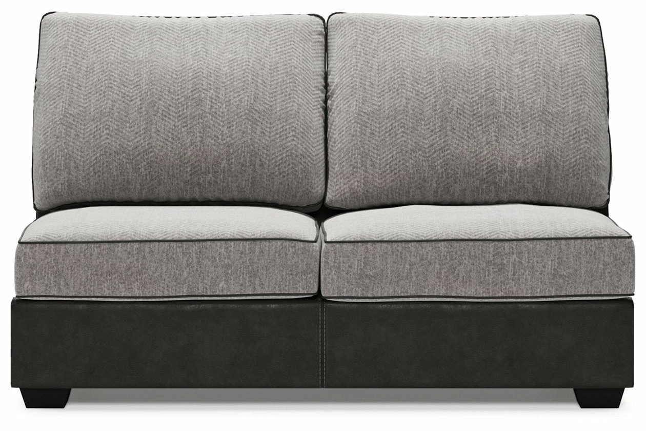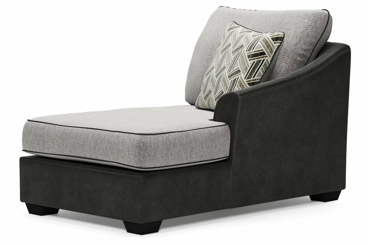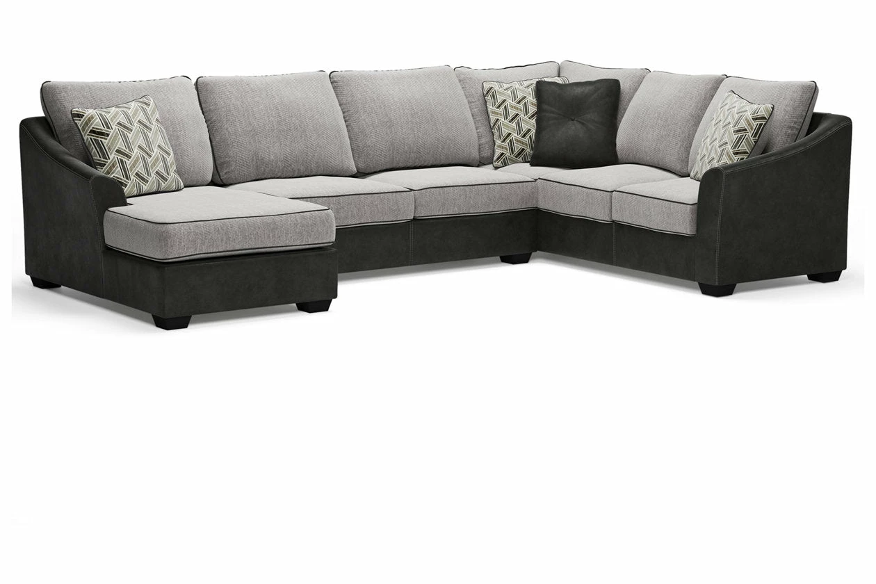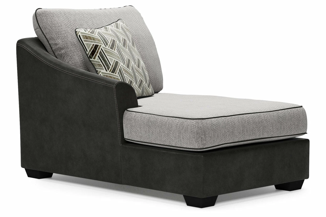 Double your pleasure with the cool and contemporary Bilgray sectional that distinguishes itself with dual fabric treatment. Wrapped in a feel-good herringbone weave upholstery outlined with pretty piping, the back and seat cushions provide the sumptuousness you crave. Beautified with contrast stitching, the faux leather on the frame adds a fashion-forward twist. Sloped flared armrests and abstract-patterned pillows perfect the aesthetic.