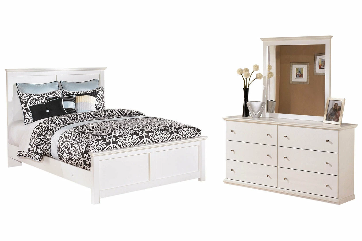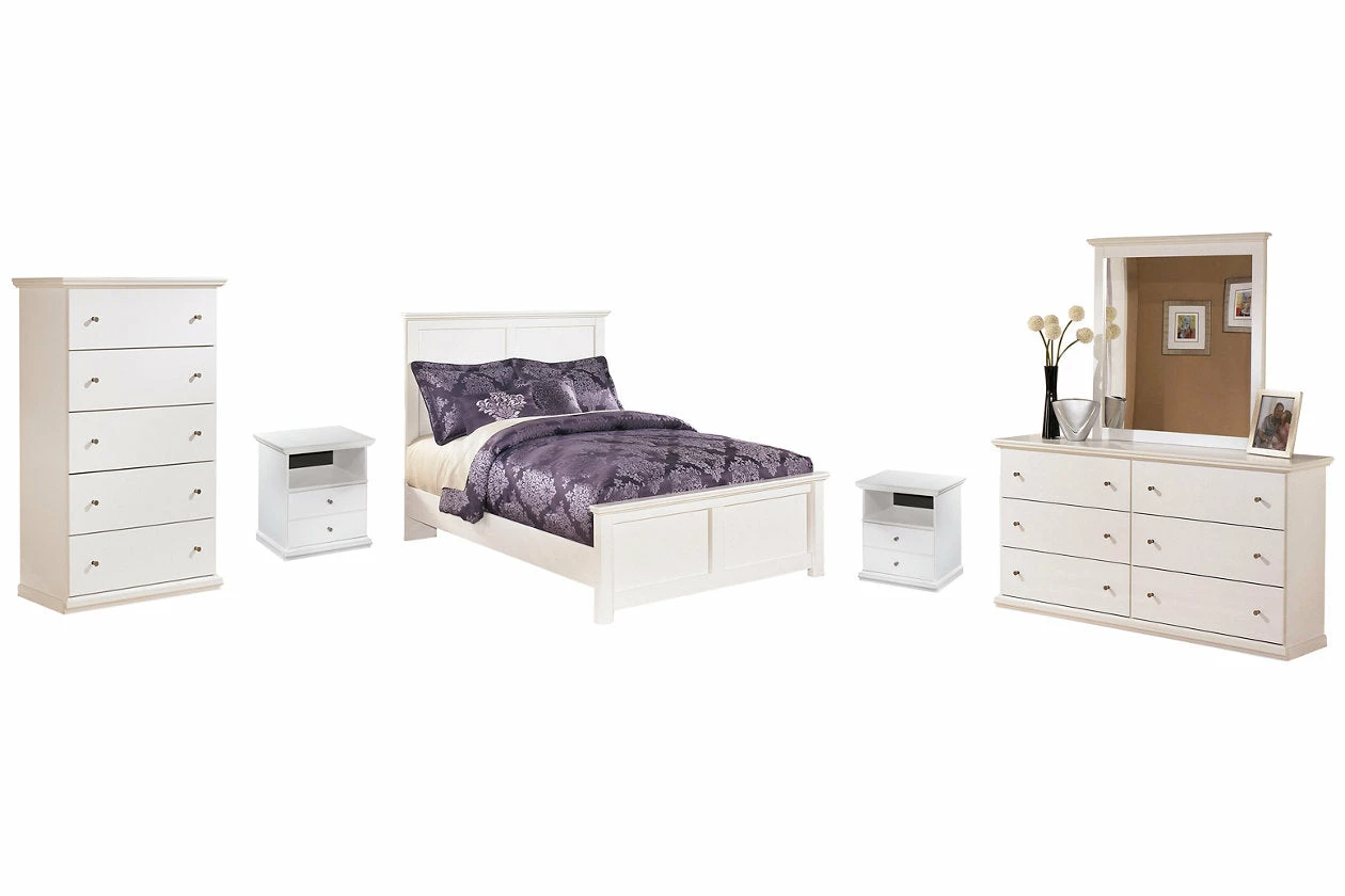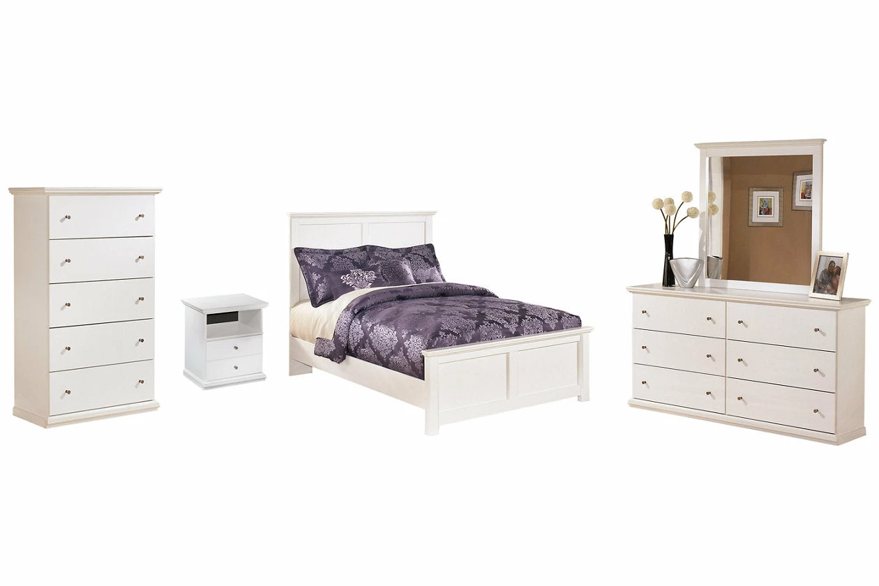 This bedroom set—with queen panel bed, chest of drawers, dresser with mirror and pair of nightstands—beautifully stands out with its understated sense of refinement. Whether you’re looking to exude an air of cottage chic flair or a timeless classic sensibility, you’re sure to appreciate this bedroom set’s great versatility. Mattress and foundation/box spring available, sold separately.