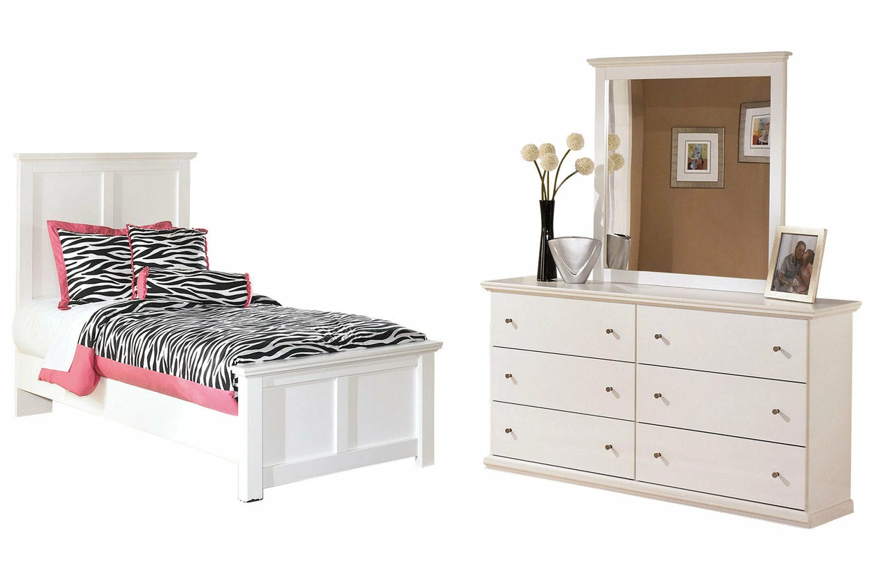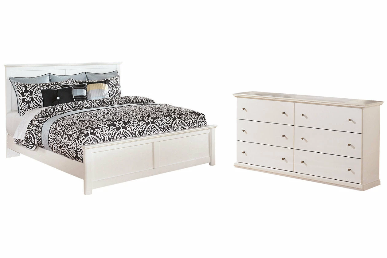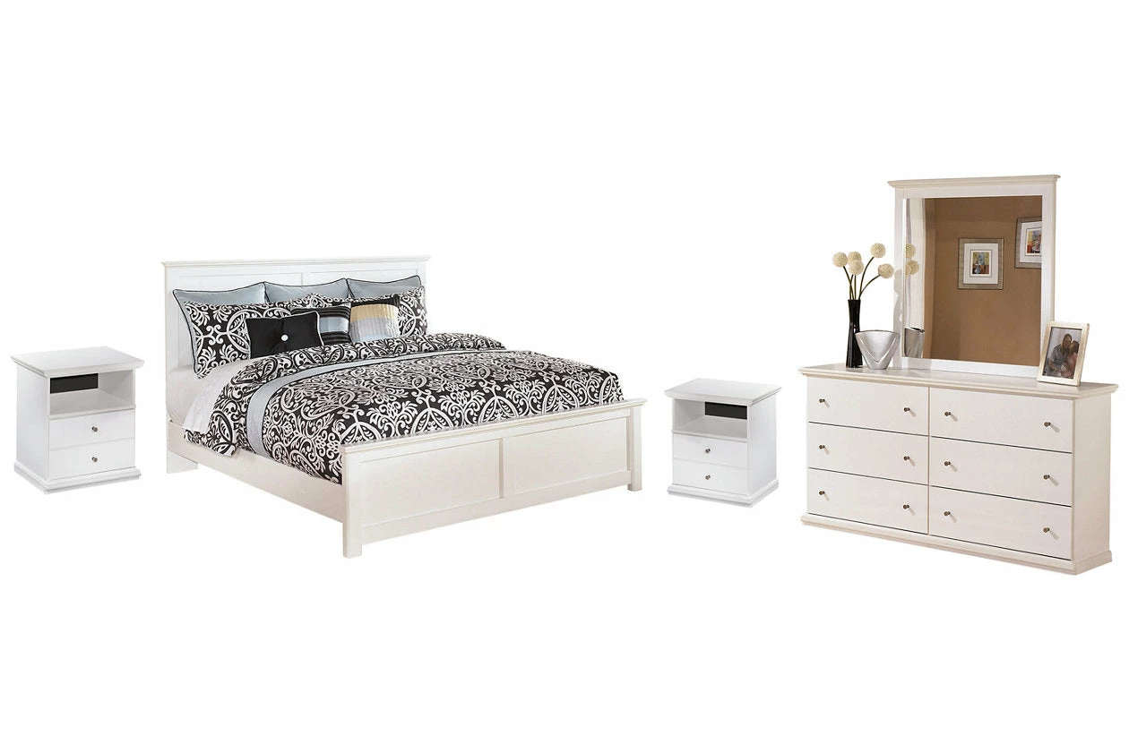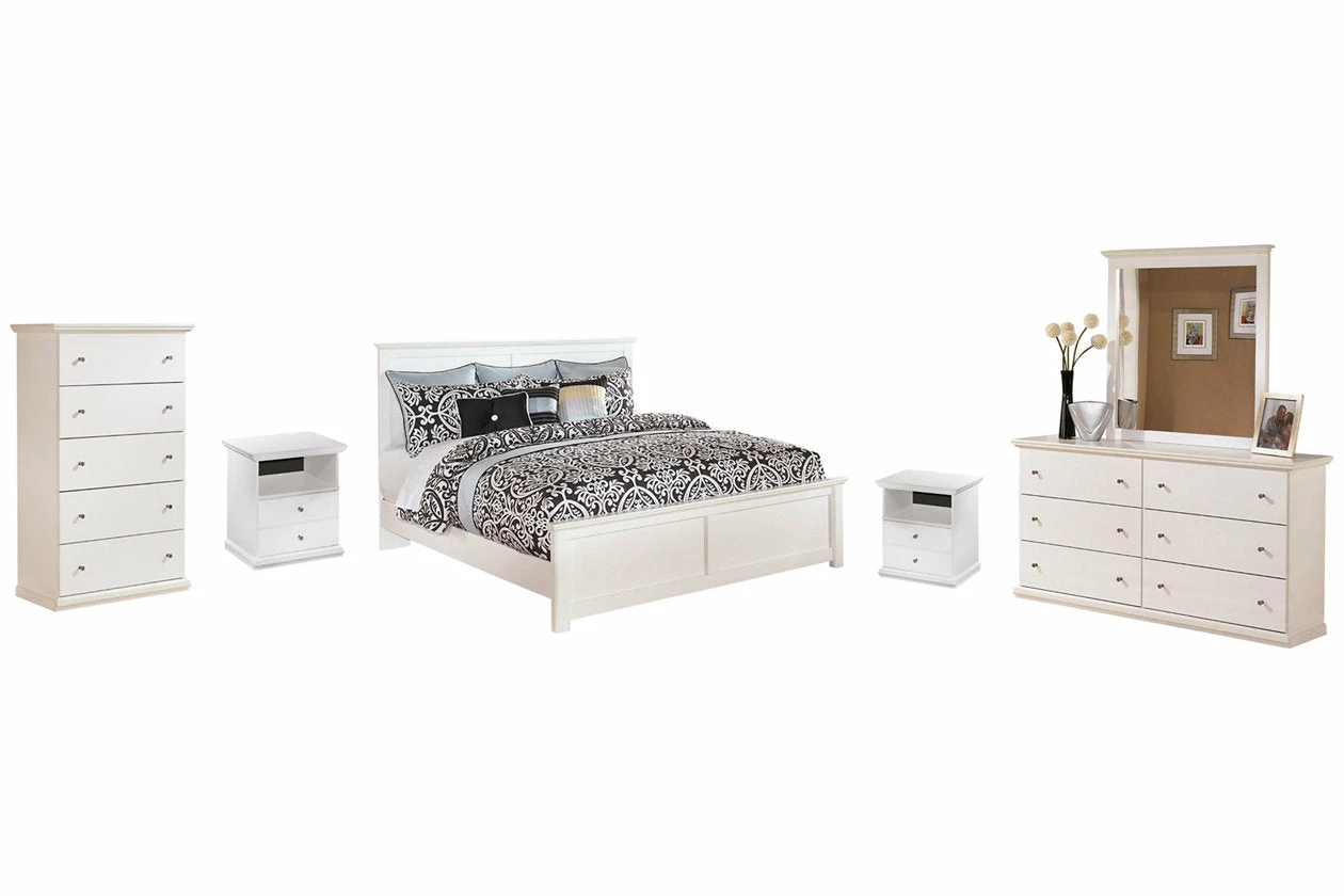 This bedroom set—with queen panel bed, chest of drawers, dresser with mirror and pair of nightstands—beautifully stands out with its understated sense of refinement. Whether you’re looking to exude an air of cottage chic flair or a timeless classic sensibility, you’re sure to appreciate this bedroom set’s great versatility. Mattress and foundation/box spring available, sold separately.