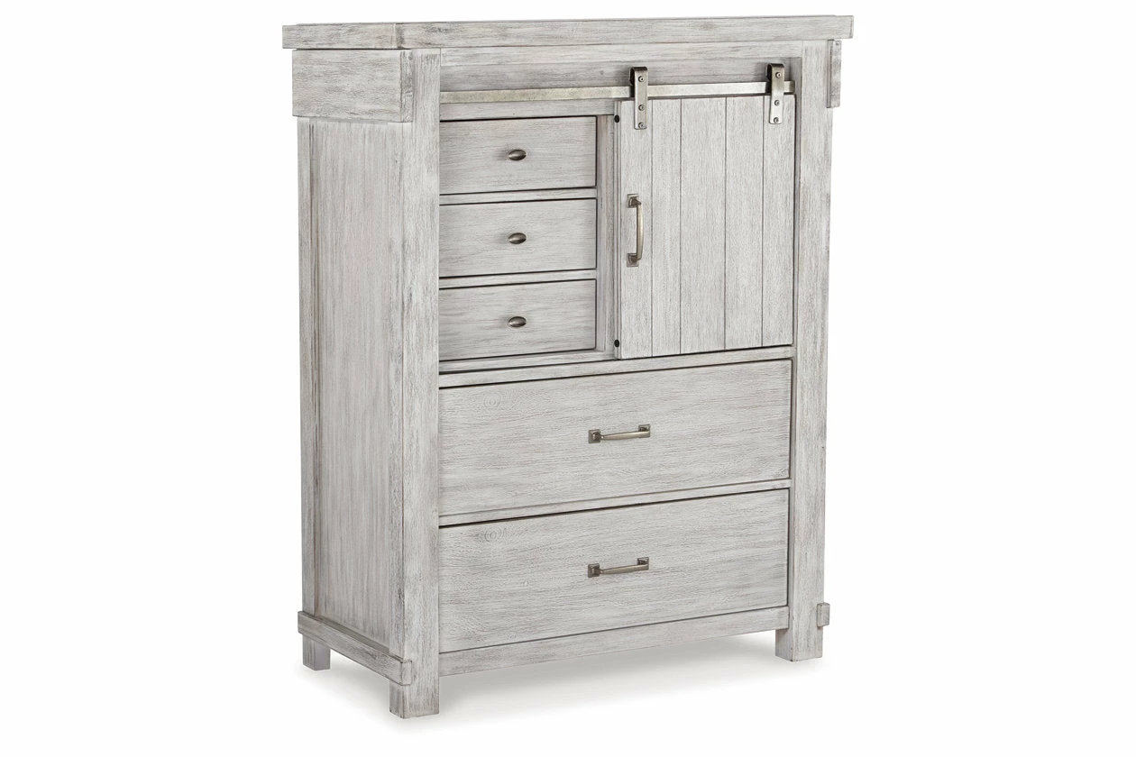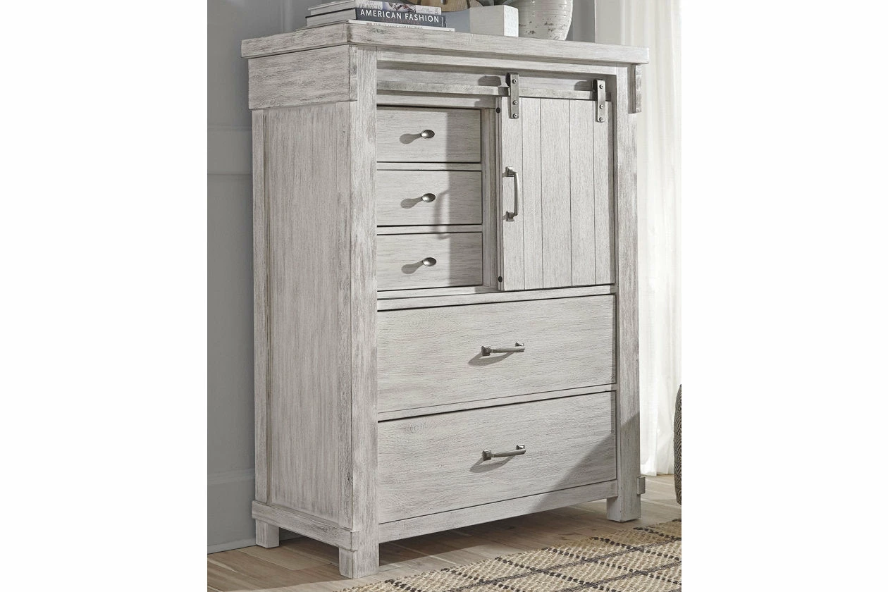 This chest of drawers brings a fresh twist to the modern farmhouse movement. Its handsome, hearty profile is made all the more interesting with a sliding “barn door” revealing shelved storage. Through-tenon styling incorporates a welcome touch of American craftsman. And the easy on the eyes, distressed white finish? Just the tone for a soothing, serene bedroom retreat.