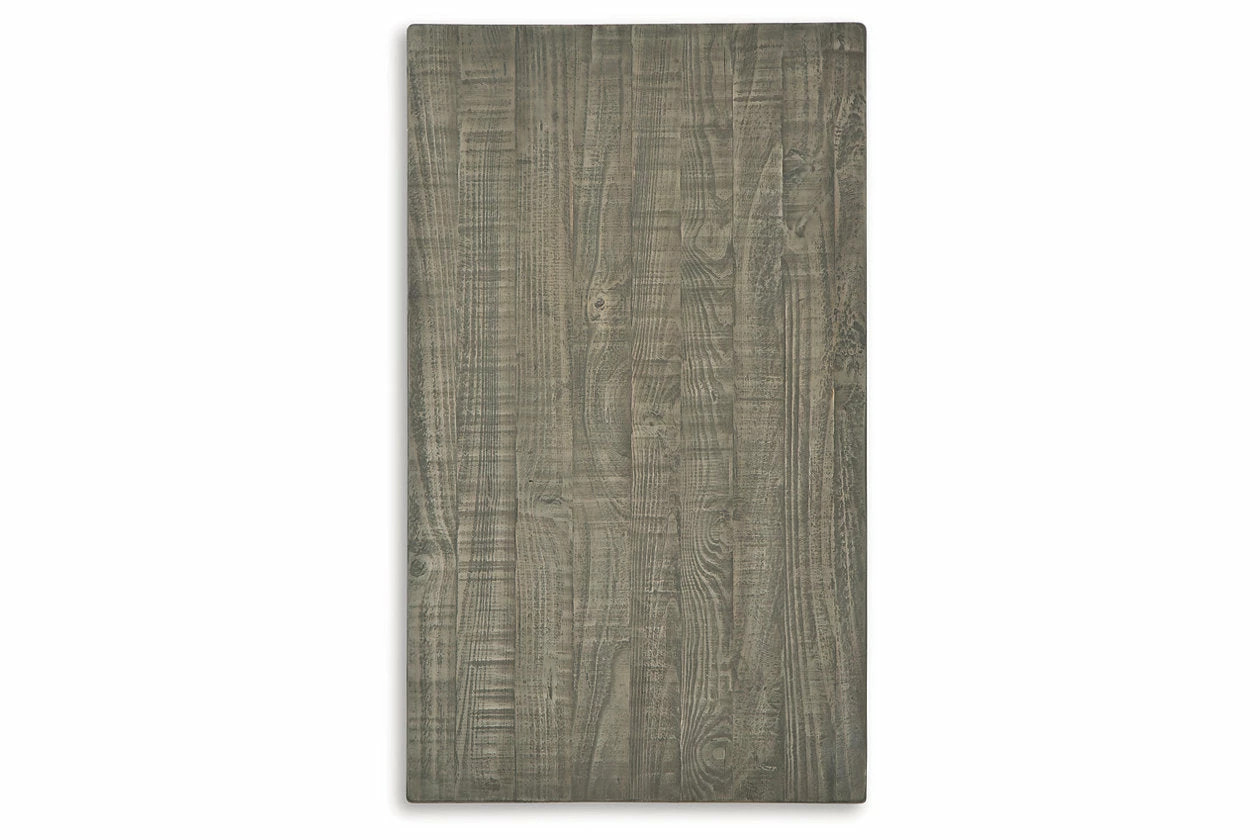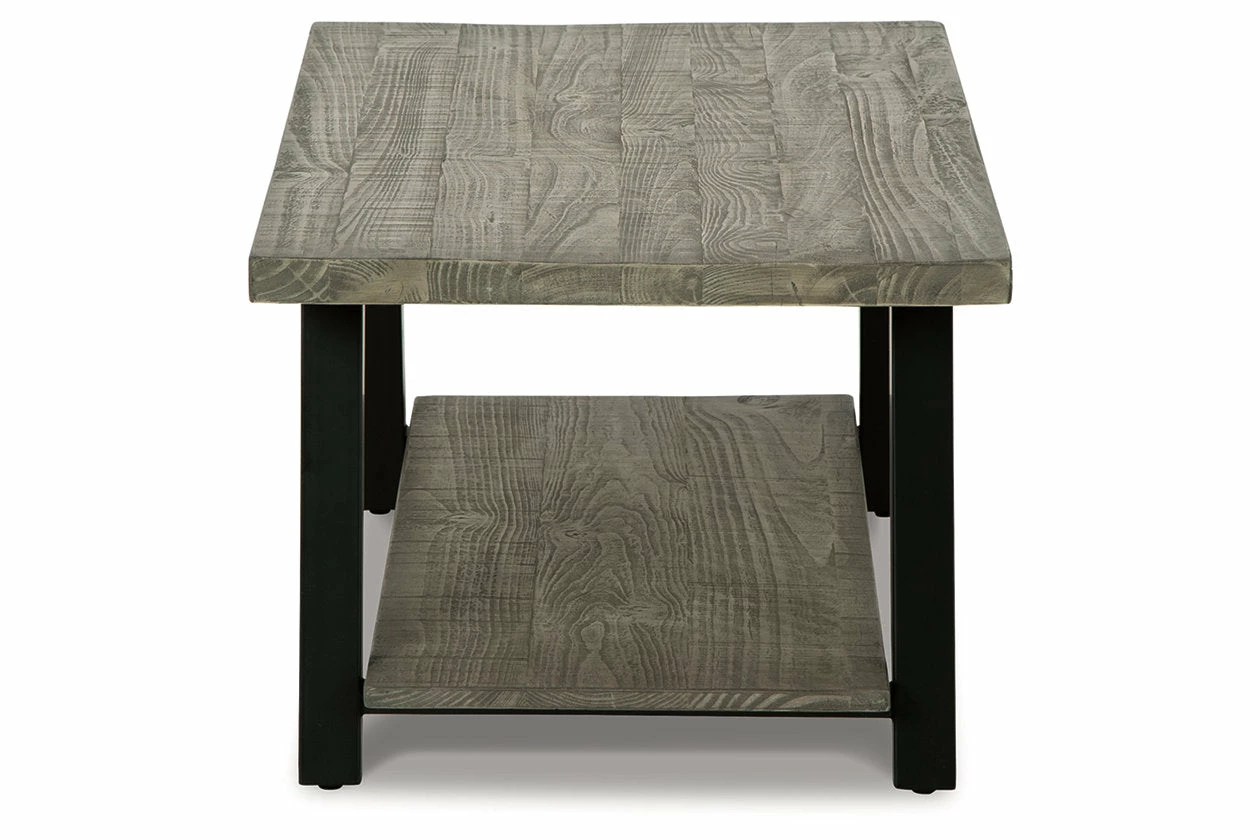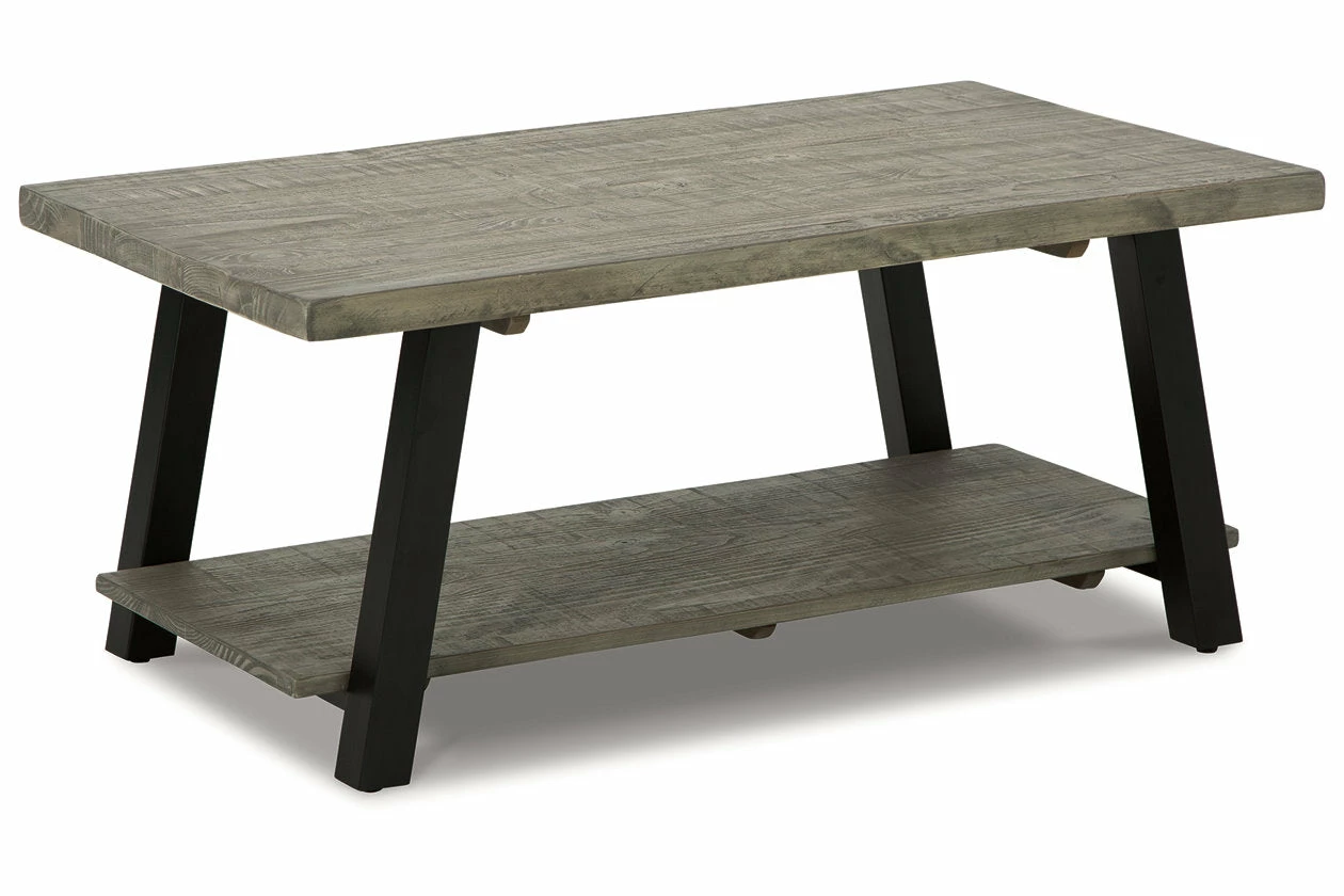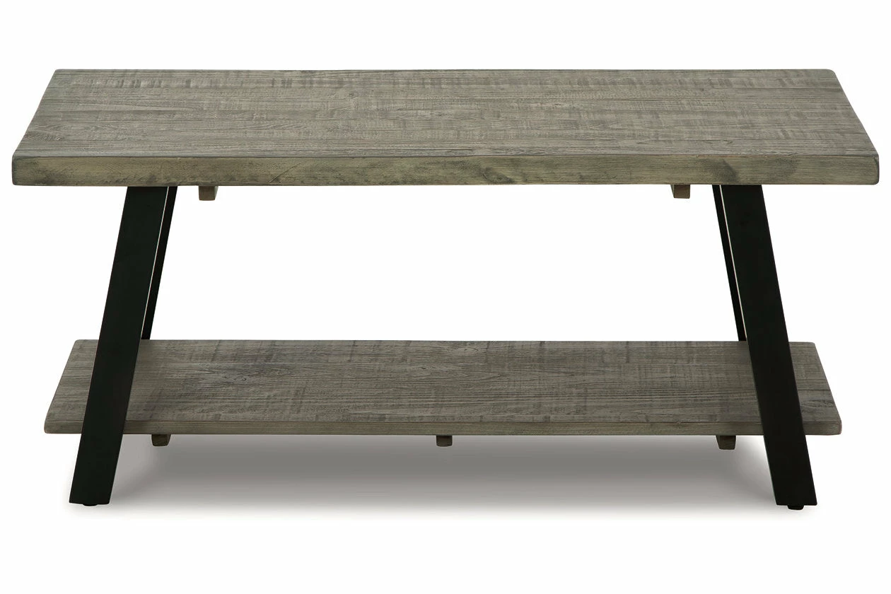 This rectangular coffee table is an achievement in urban contemporary styling. Its ultra-cool design pairs a thick slab-style tabletop and an open lower shelf of solid pine wood with linear metal legs. A weathered gray finish keeps the aesthetic warm and inviting.