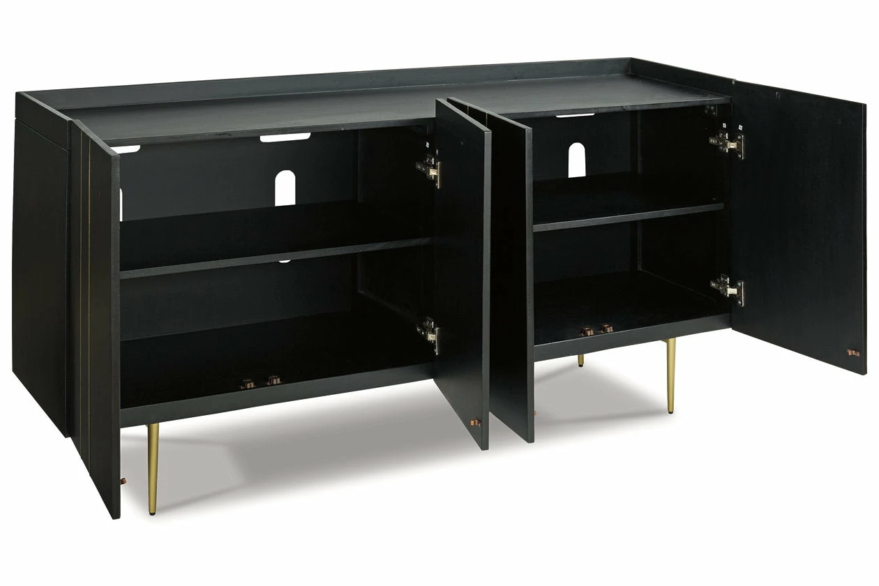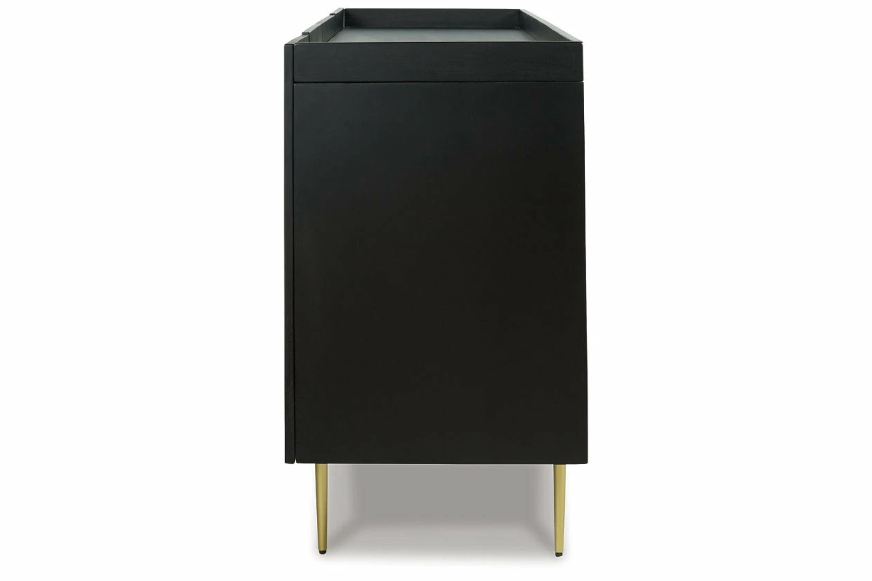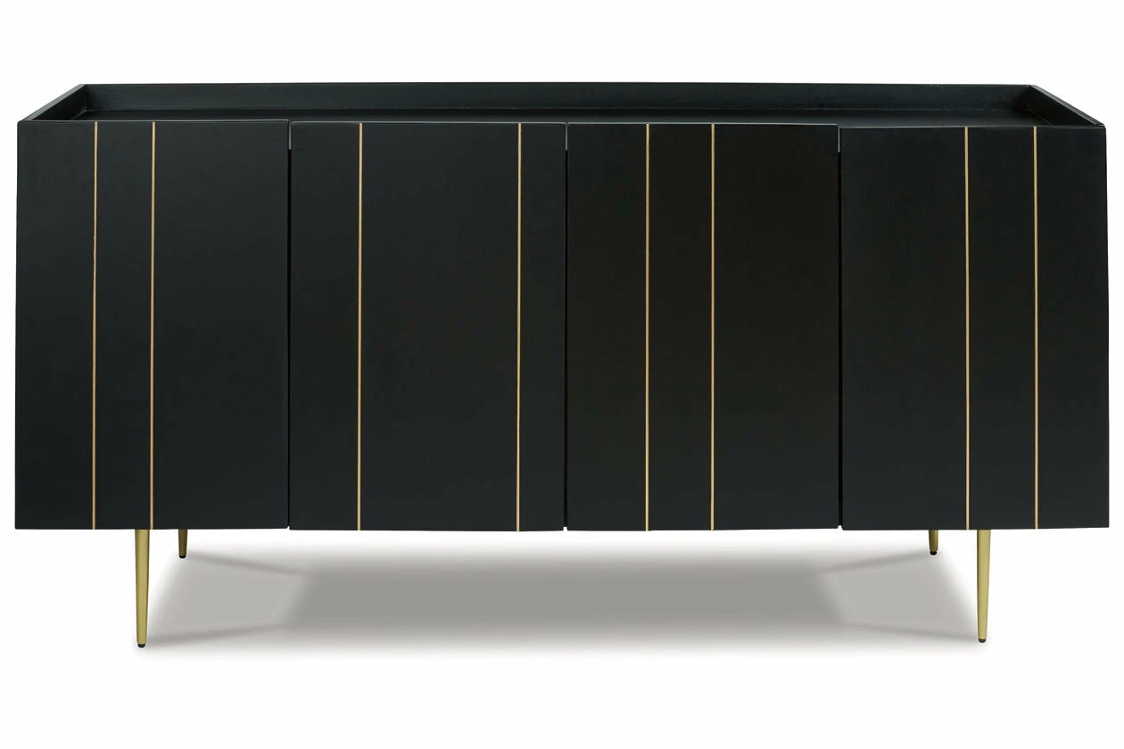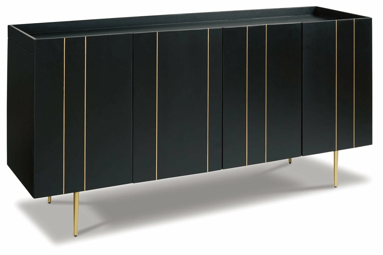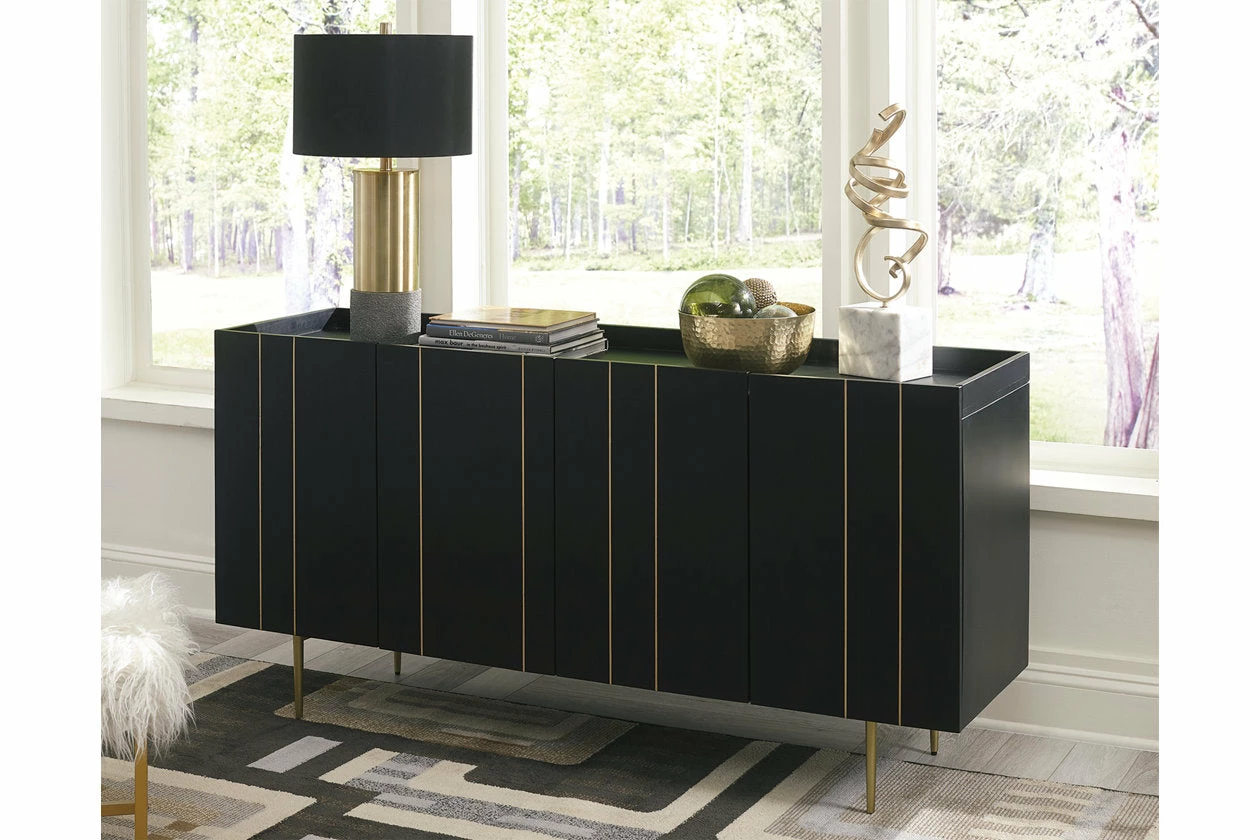 This accent cabinet is beautifully aligned with your love of contemporary style with a high-glam twist. Finished in brilliant black, this quality crafted accent cabinet is enriched with thin brass inlays and tapered metal legs in a brass-tone finish for upscale appeal.