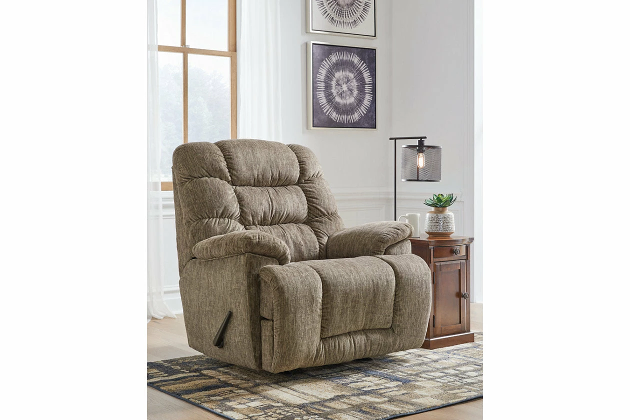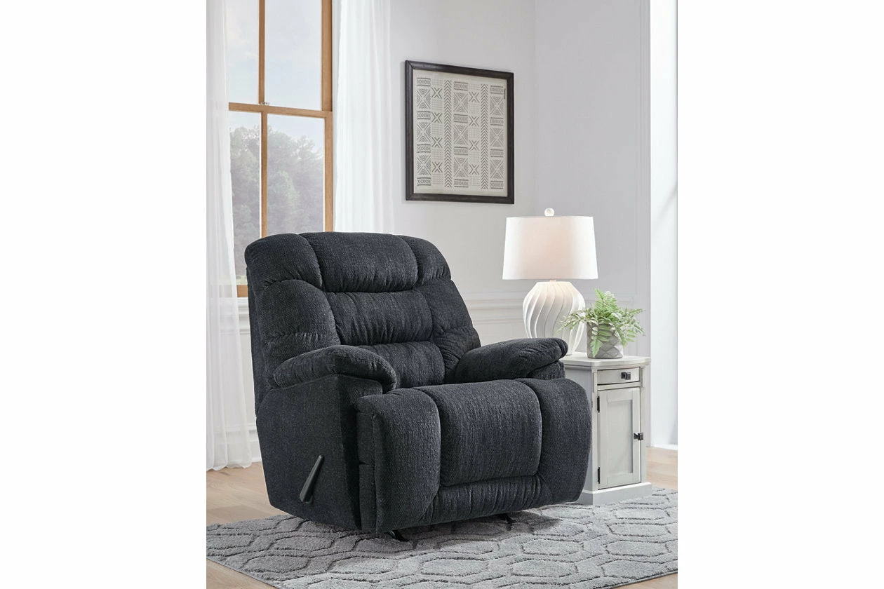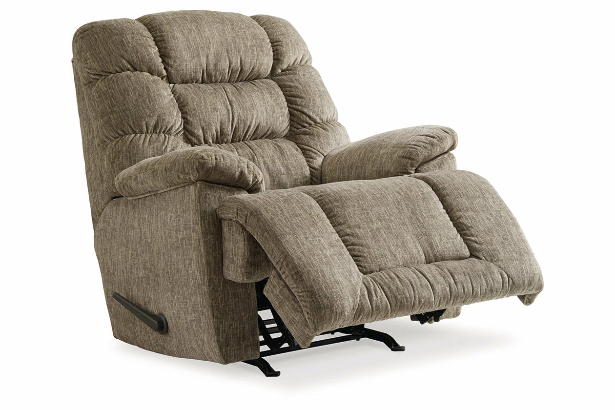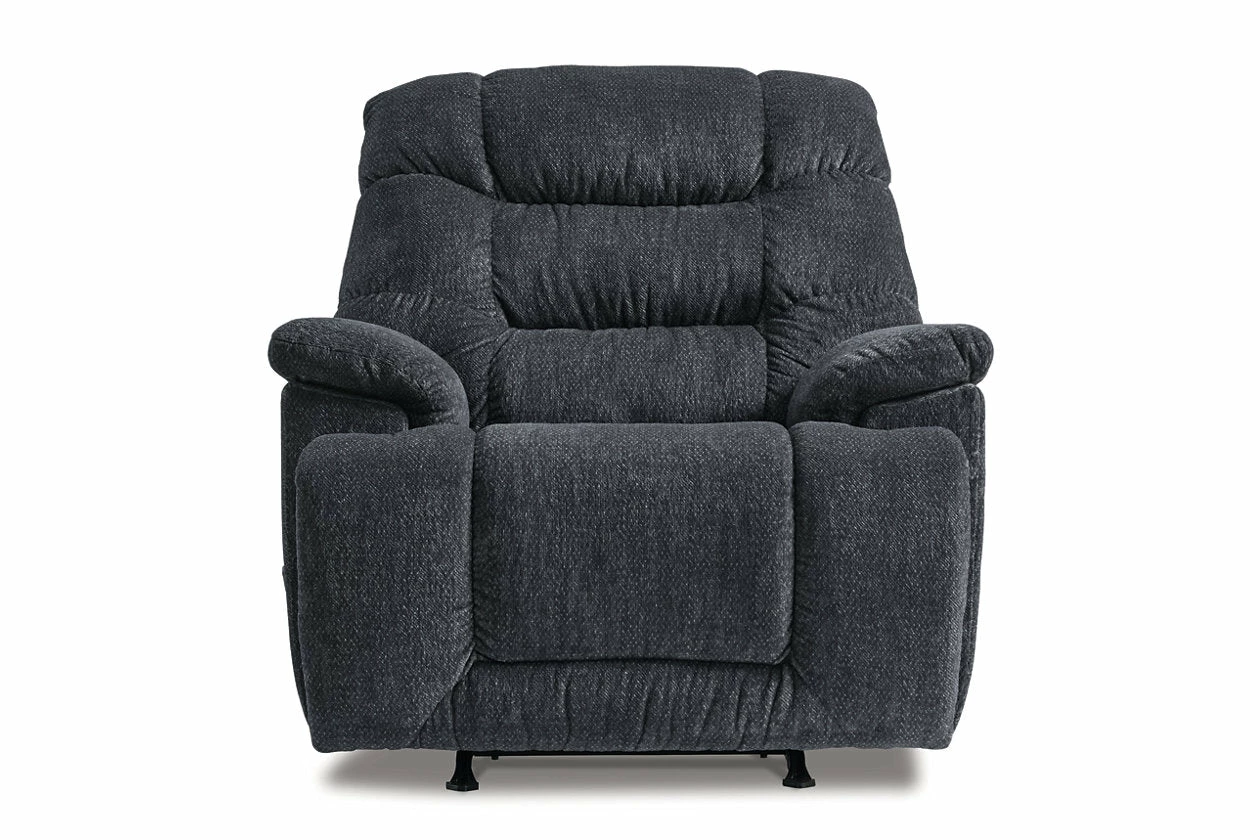 Sit back, relax and kick up your feet. Immerse yourself in total comfort as this rocker recliner embraces you with the cool look of leather and the warm, cozy feel of fabric. Plush, pillowy cushions, an oversized headrest pillow and wide pillow top armrests feature heavyweight stitching in a stunning shade of charcoal gray. The warm, welcoming look fits easily with other colors in the room and is right at home with a variety of design styles. A comfortable big and tall high-back profile allows an abundance of softness that is over the top.