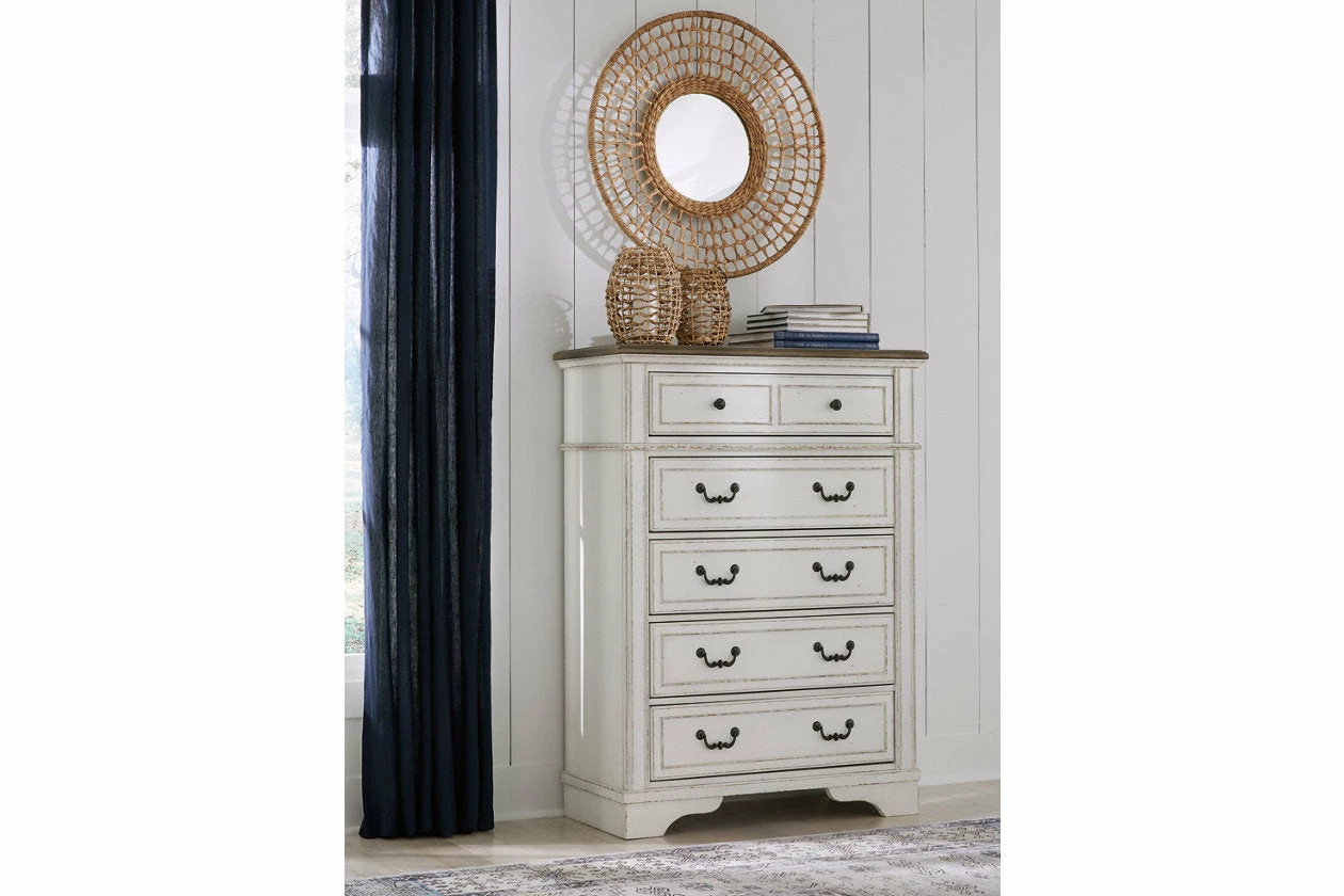 Traditional style doesn’t have to be stuffy. It can feel warm, inviting and beautifully in the moment. Case in point: this chest of drawers. Merging yesteryear elements such as profiled drawer fronts and pilasters, a waist moulding and traditional pulls with dark bronze-tone coloration, this unique piece has an allure all its own. Equally special is the brilliant two-tone finish, which exudes a mood of casual charm and easy elegance.