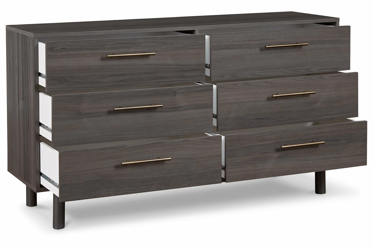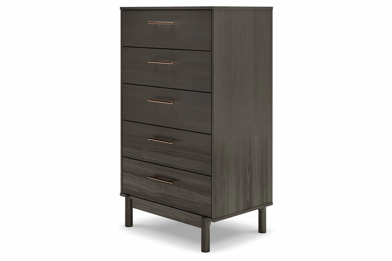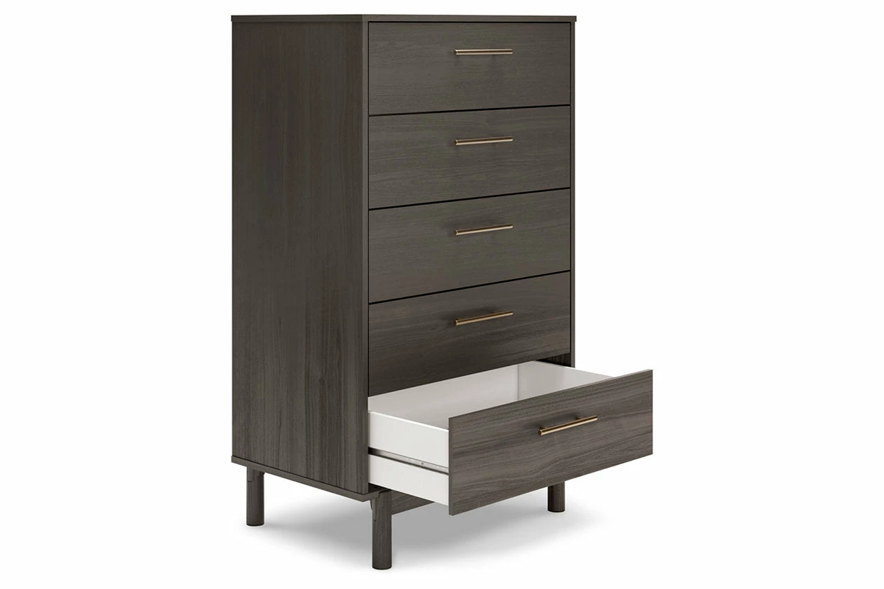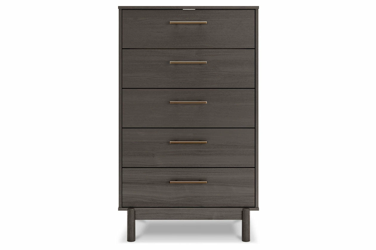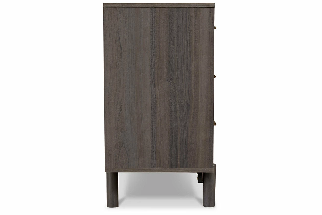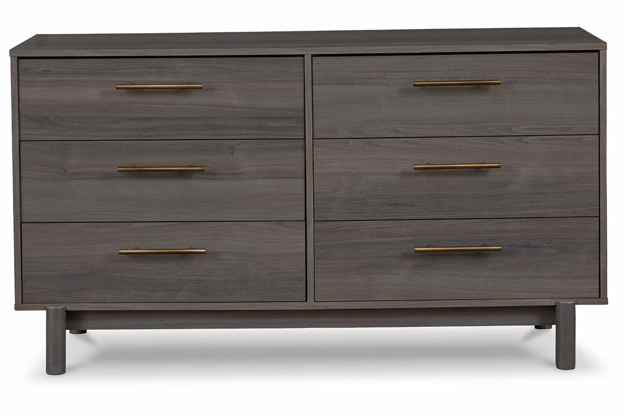 With clean lines evoking a true mid-century spirit, this chest of drawers creates a sense of sleek harmony in your room. The subtle warm gray finish and burnished goldtone handles add an authentically modern touch. This striking piece elevates your environment to coolly sophisticated.