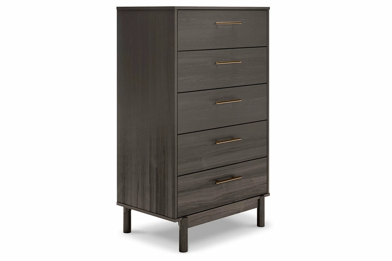 With clean lines evoking a true mid-century spirit, this chest of drawers creates a sense of sleek harmony in your room. The subtle warm gray finish and burnished goldtone handles add an authentically modern touch. This striking piece elevates your environment to coolly sophisticated.