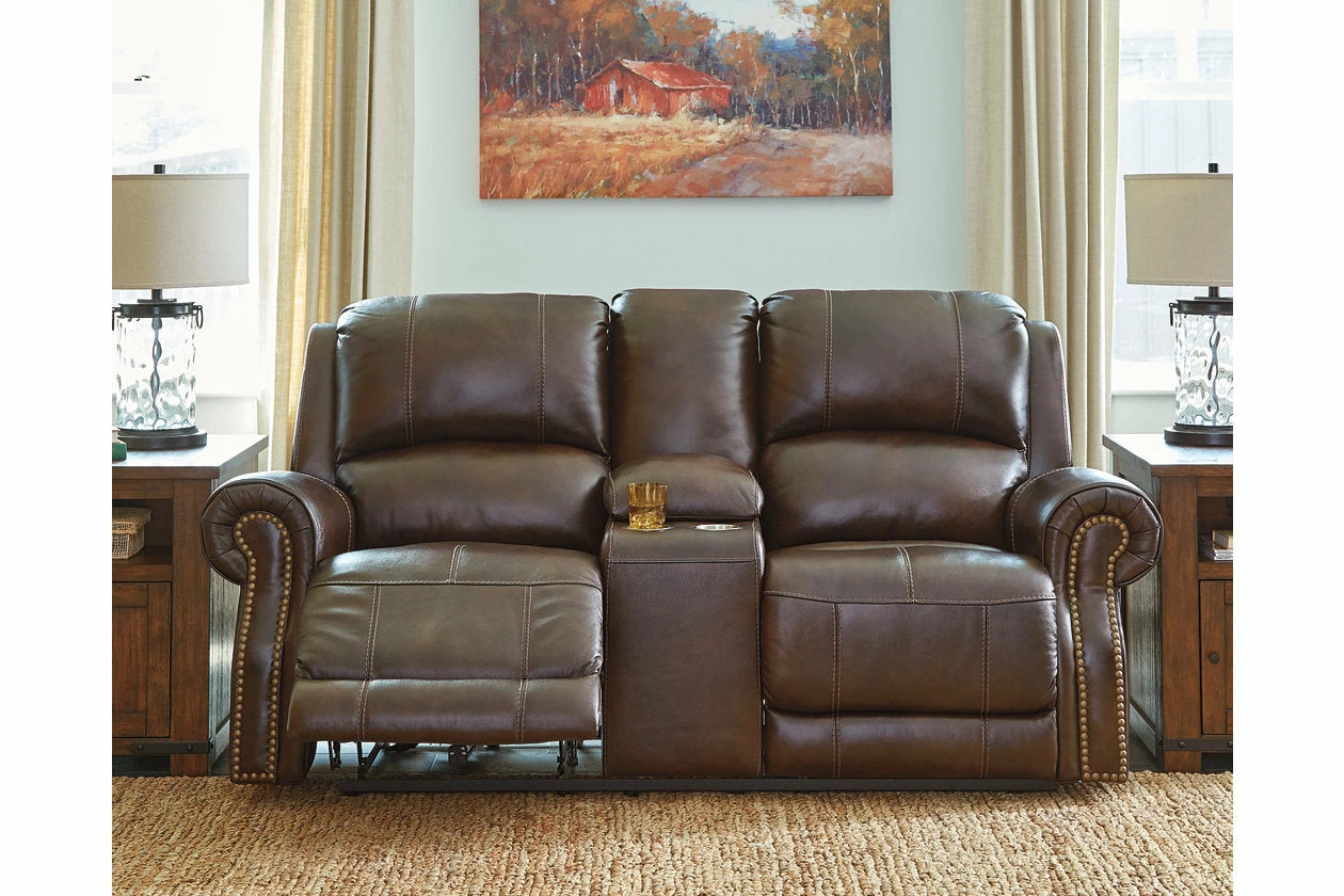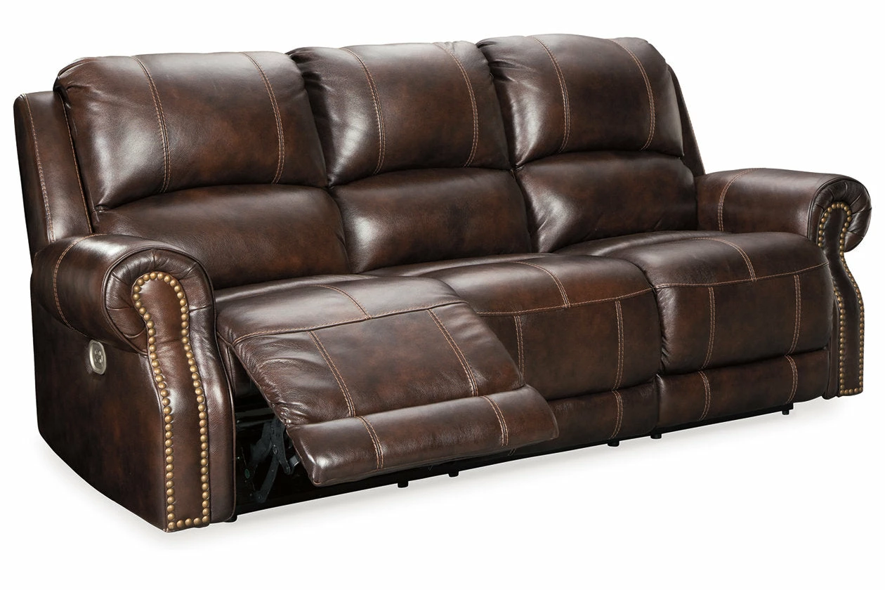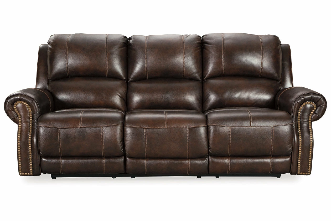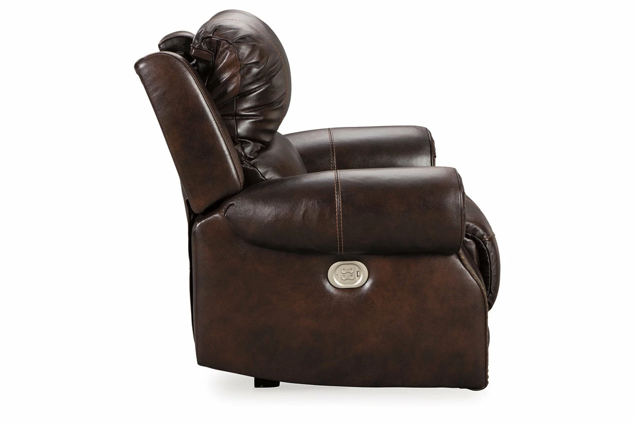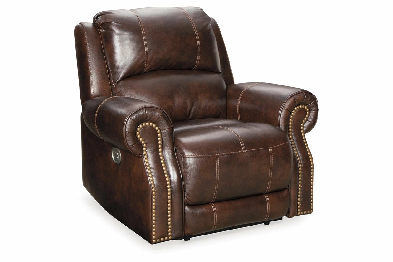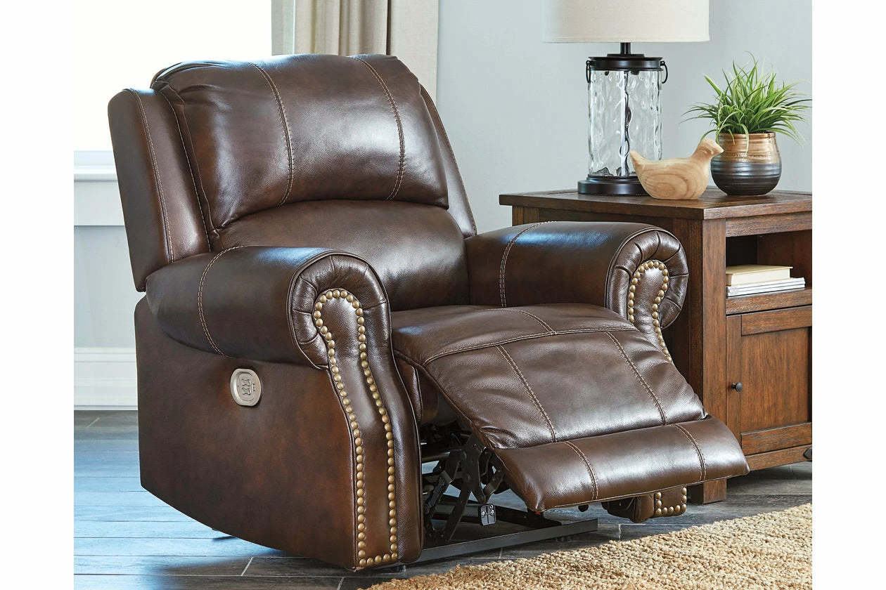 Recline in the modern luxury and convenience of this power recliner with high back and Easy View™ power adjustable headrest. With the touch of a button, you can easily position the recliner and its headrest for maximum comfort. Plus, with the convenient USB charging port, you can keep your electronics charged without having to get up. The genuine leather upholstery is paired with expertly matched faux leather for affordability. Bring a luxurious look full of details, such as nailhead trim and rolled armrests, to your living area—what a treat packed with comfort to be enjoyed for years to come.