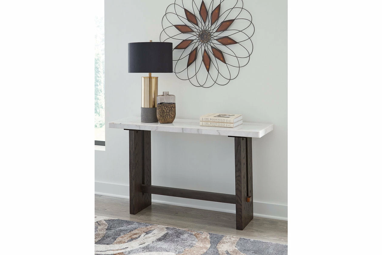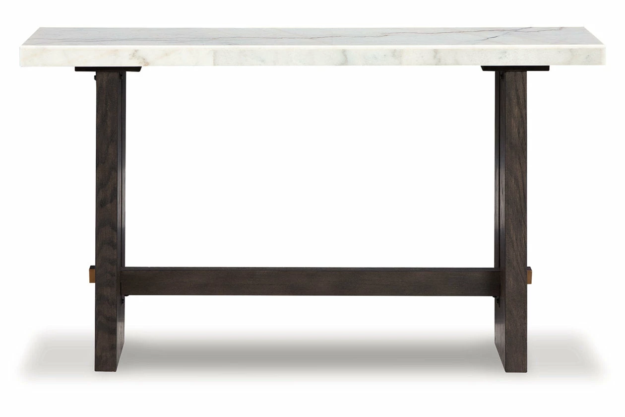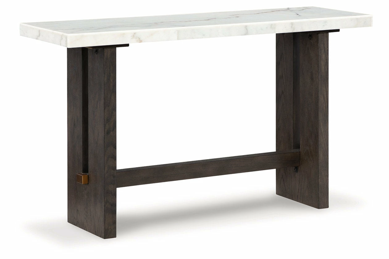 Dressed to thrill, this simply stunning sofa table offers a high-design look at a down-to-earth price. Ultra-sleek lines are accentuated with a dark waxy brown oak finish that’s so easy on the eyes. Clean-lined and modern, the plinth base and natural marble tabletop showcase quality craftsmanship and attention to detail. This table is the perfect sofa companion for a living room or family space, with a timeless look that’s made to last.
