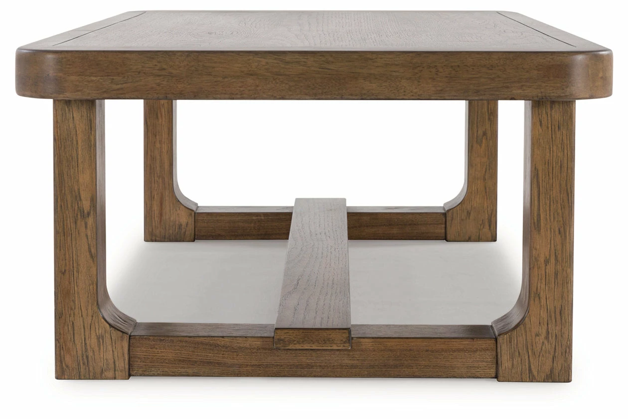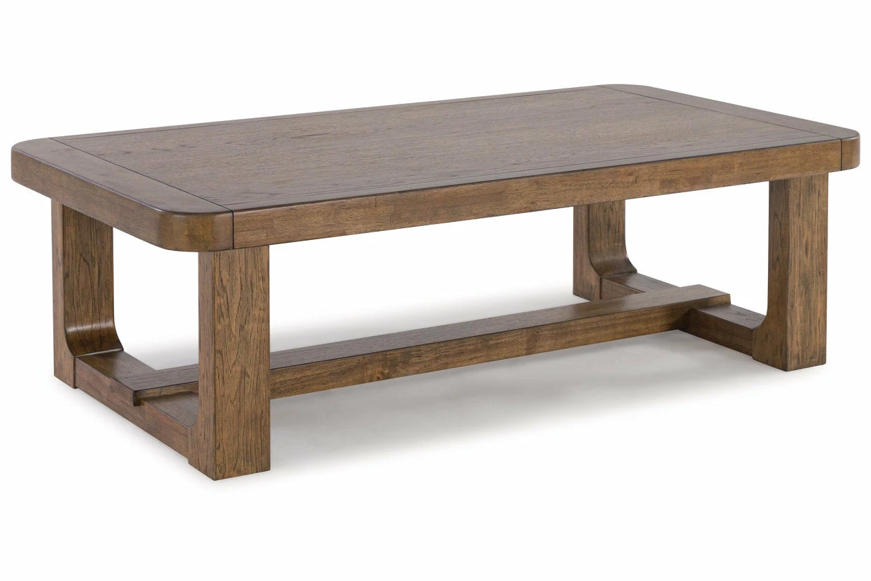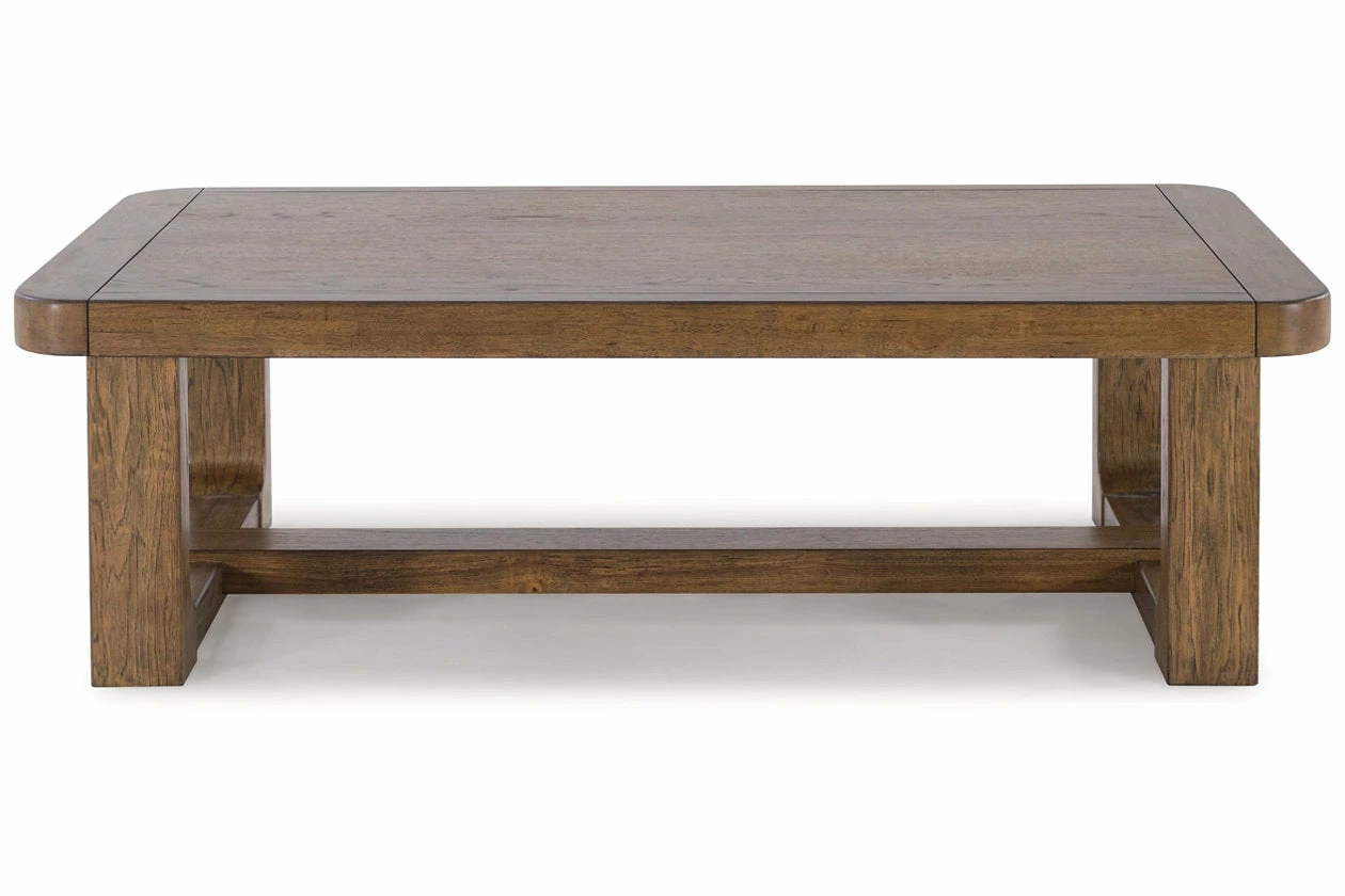 This coffee table sits comfortably at the intersection of modern lodge and farmhouse aesthetics. Your warm and welcoming disposition is reflected in the charming architectural elements and light brown glazed finish. Even with its poise, this coffee table remains practical. Its softly rounded corners keep kids safe and your living room stylish.