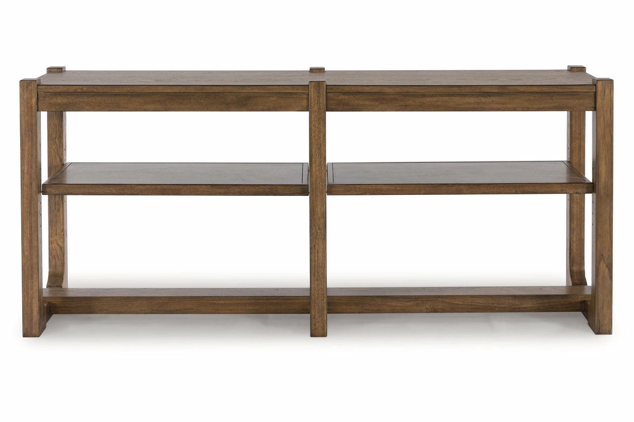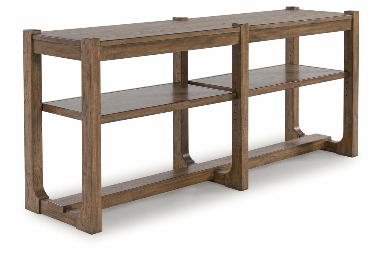 This sofa table sits comfortably at the intersection of modern lodge and farmhouse aesthetics. Your warm and welcoming disposition is reflected in the charming architectural elements and light brown glazed finish. Even with its poise, this table remains practical. With its multifunctional design, it doubles as a stunning TV stand or as a bookcase in the office.