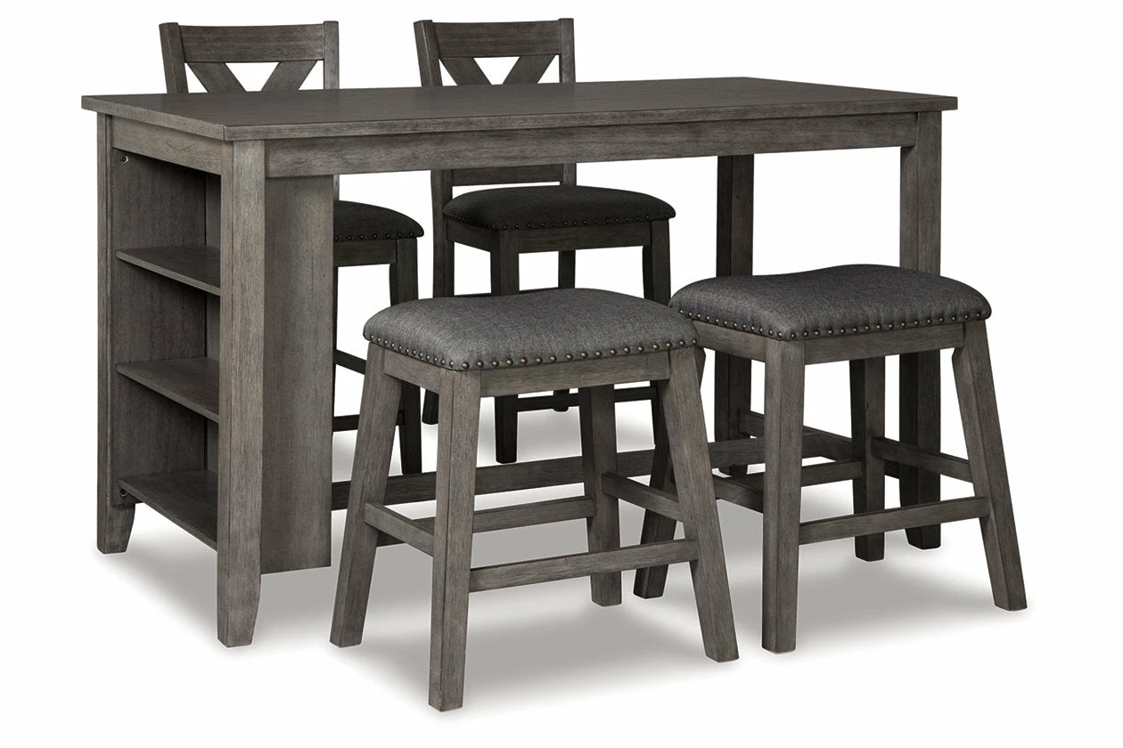 Bring a relaxed yet refined sense of good taste to your space with this 5-piece counter-height dining set. The antiqued gray wash finish gives the clean-lined design a casually cool sensibility. The table’s side shelves cleverly balance form and function while the textured gray upholstery of the stools serves up high style. This set is an inspired choice for modern farmhouse living.