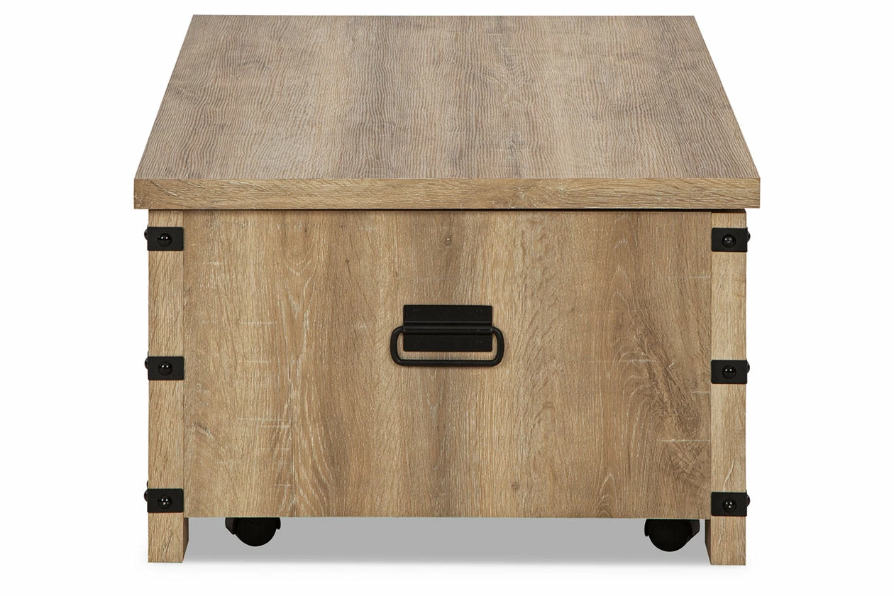 This coffee table reinvents yesterday’s style with casually modern flair. Its replicated natural oak grain is warm and inviting, while metal accents deliver a rustic, mixed-material edge. This laid-back luxe piece is further elevated by the lift-top design, providing surface space for daytime work or movie-night snacks.
