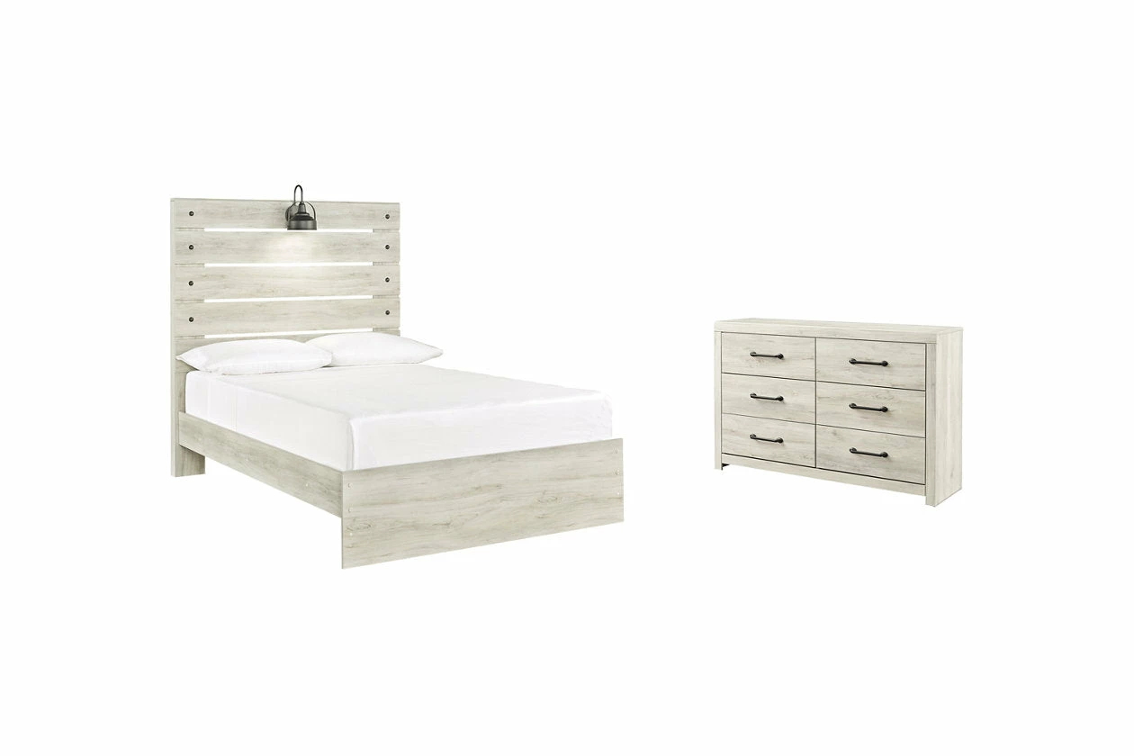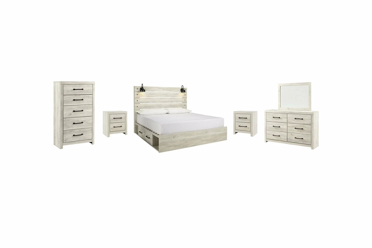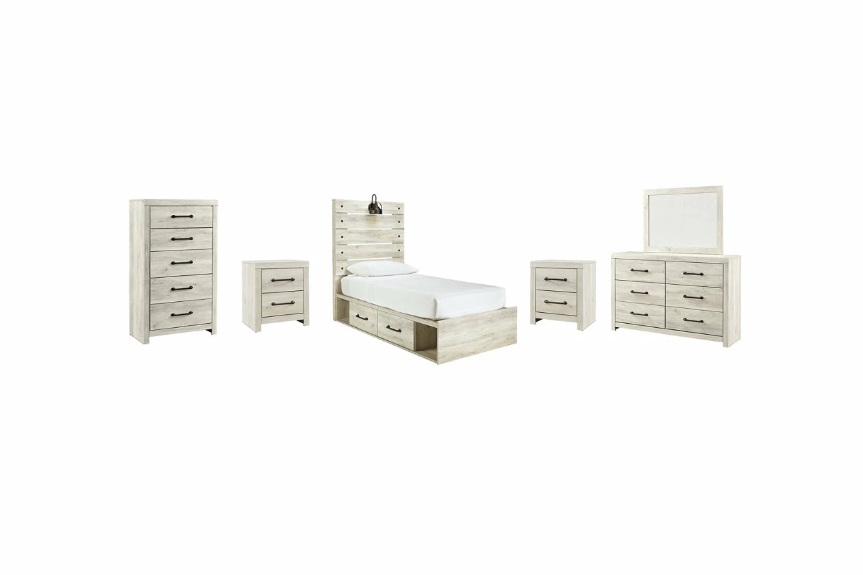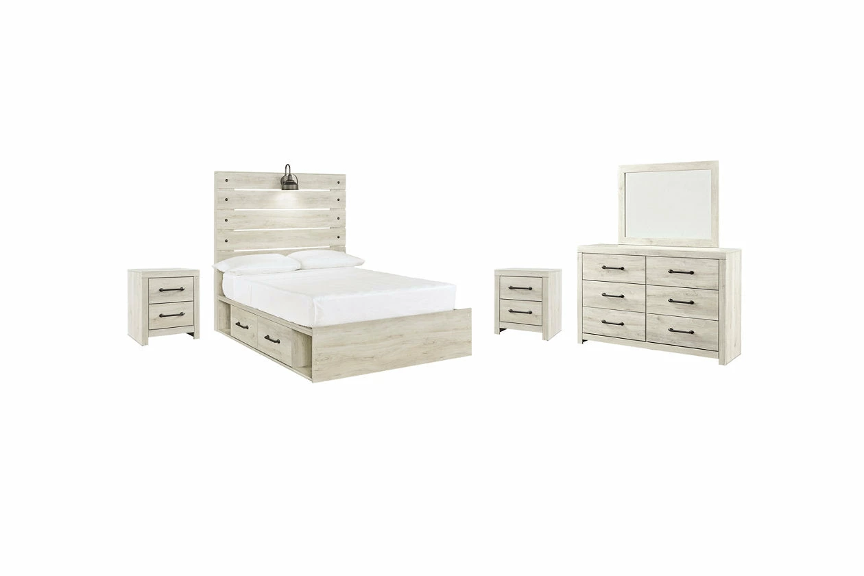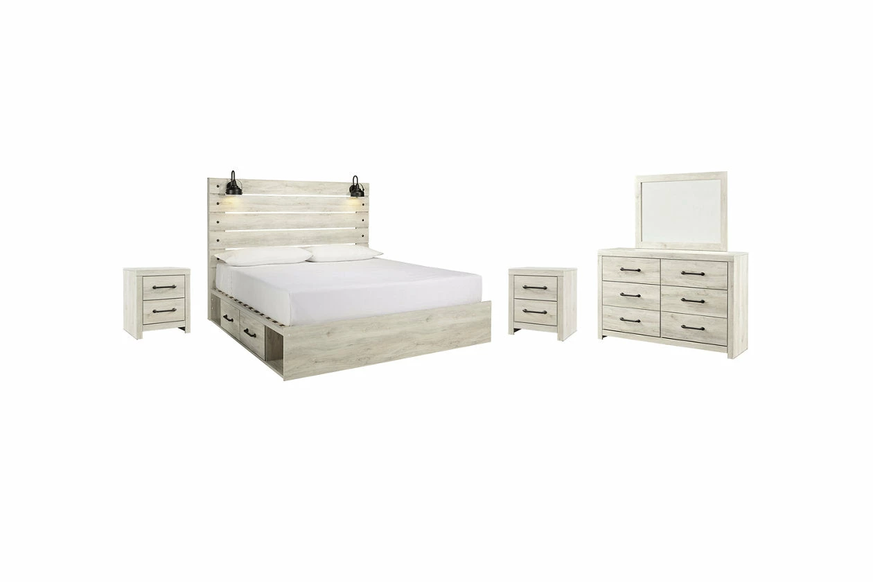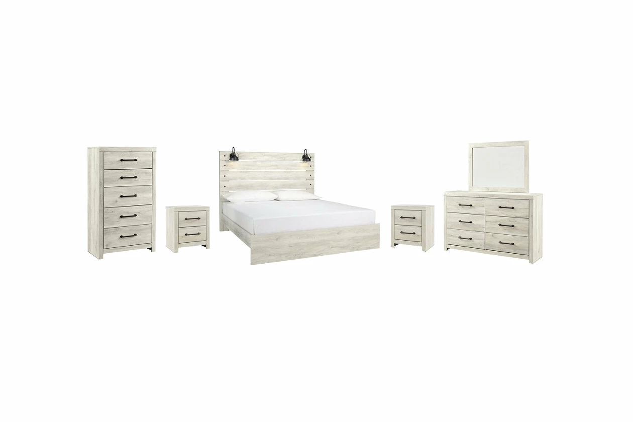 Whether you lean towards modern loft or modern farmhouse, this panel bed, two nightstands, chest of drawers and dresser with mirror tip the balance in your favor. The wispy whitewash finish enhances the style without covering the grain for that weathered look you just can’t get enough of. Love to read in bed? You’re sure to find the retro-chic light sconce and USB plug-ins on the open-slat style headboard to be a totally bright idea, while the elongated metal drawer pulls really elevate the aesthetic. What a delightful take on rustic industrial style.