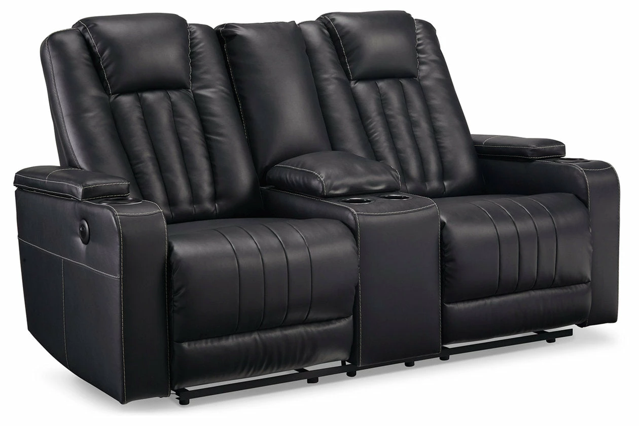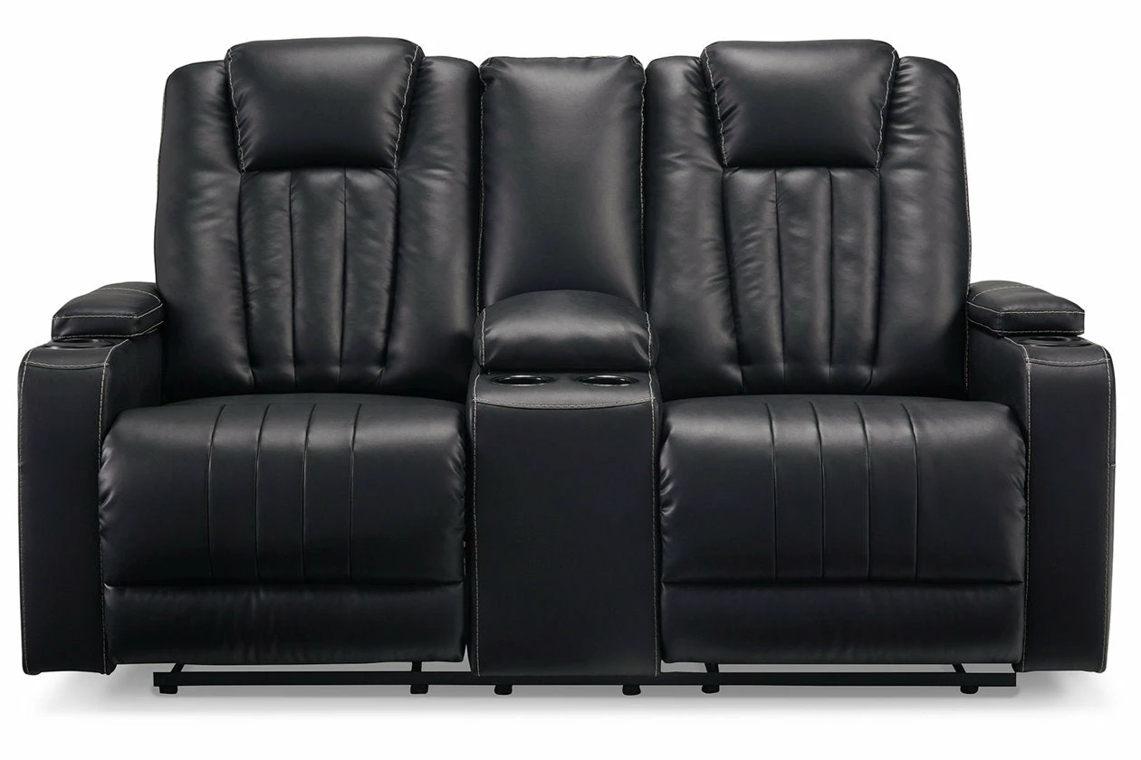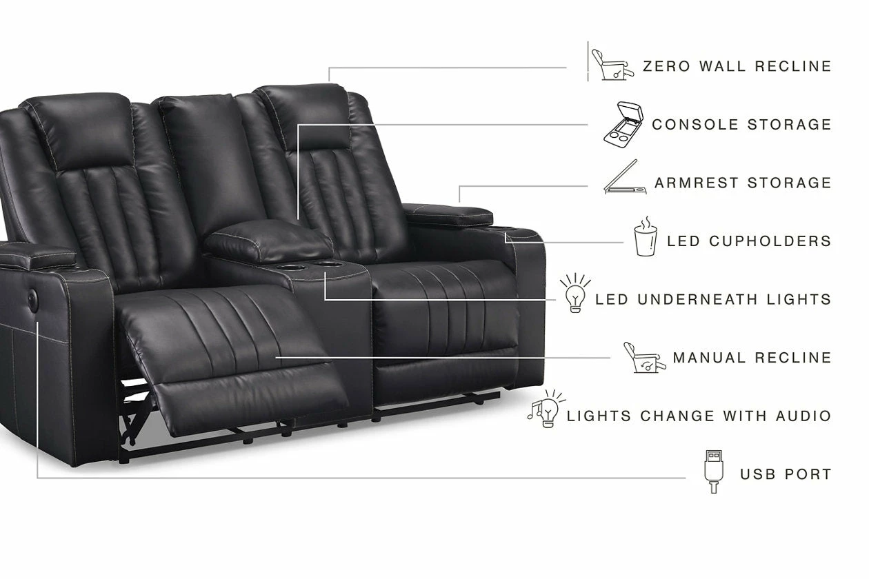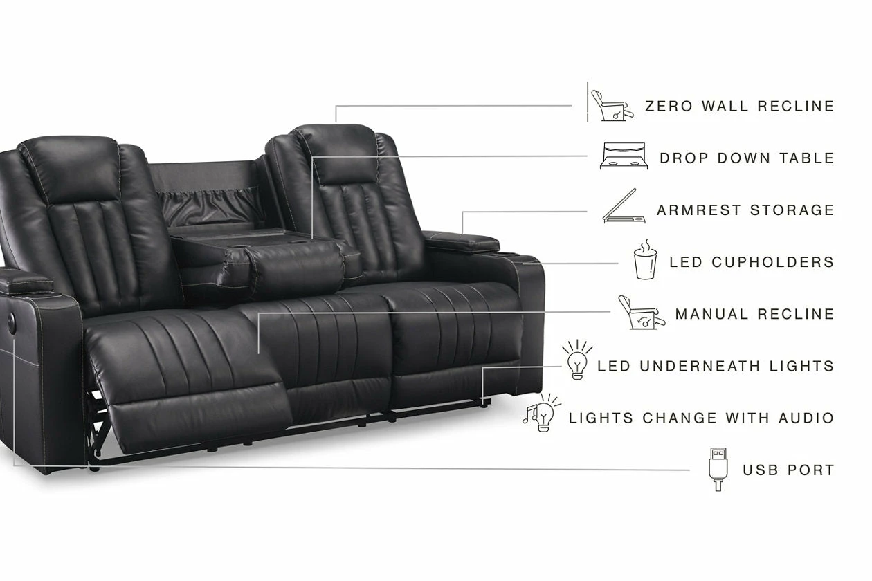 Not your father’s easy chair, this double reclining loveseat with console brilliantly showcases the next generation of recline design. Transform game or movie night into an interactive sensory experience with the touch of a button. Built-in LED lighting lets you choose from a range of colors for a captivatingly cool vibe. Use the light control button to sync with any device within range and cycle through the colors to the beat of the bassline. Sleek faux leather with distinctive stitching enhances the form and function of this simply striking piece.