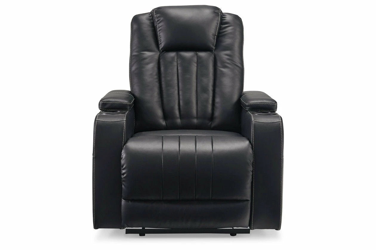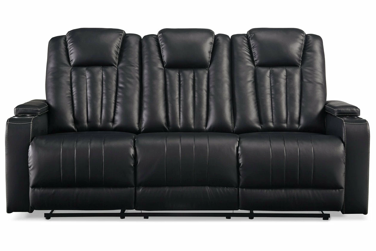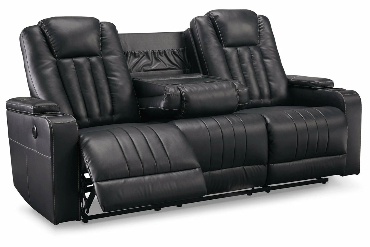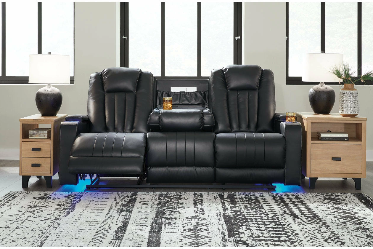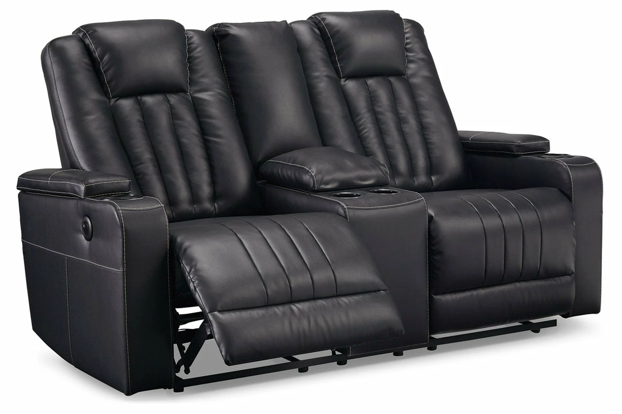 Not your father’s easy chair, this double reclining loveseat with console brilliantly showcases the next generation of recline design. Transform game or movie night into an interactive sensory experience with the touch of a button. Built-in LED lighting lets you choose from a range of colors for a captivatingly cool vibe. Use the light control button to sync with any device within range and cycle through the colors to the beat of the bassline. Sleek faux leather with distinctive stitching enhances the form and function of this simply striking piece.
