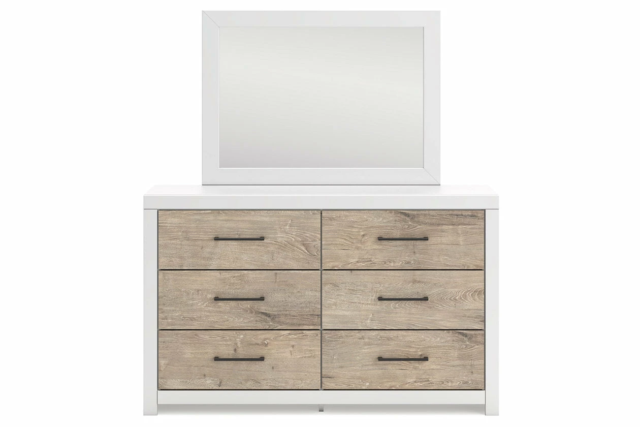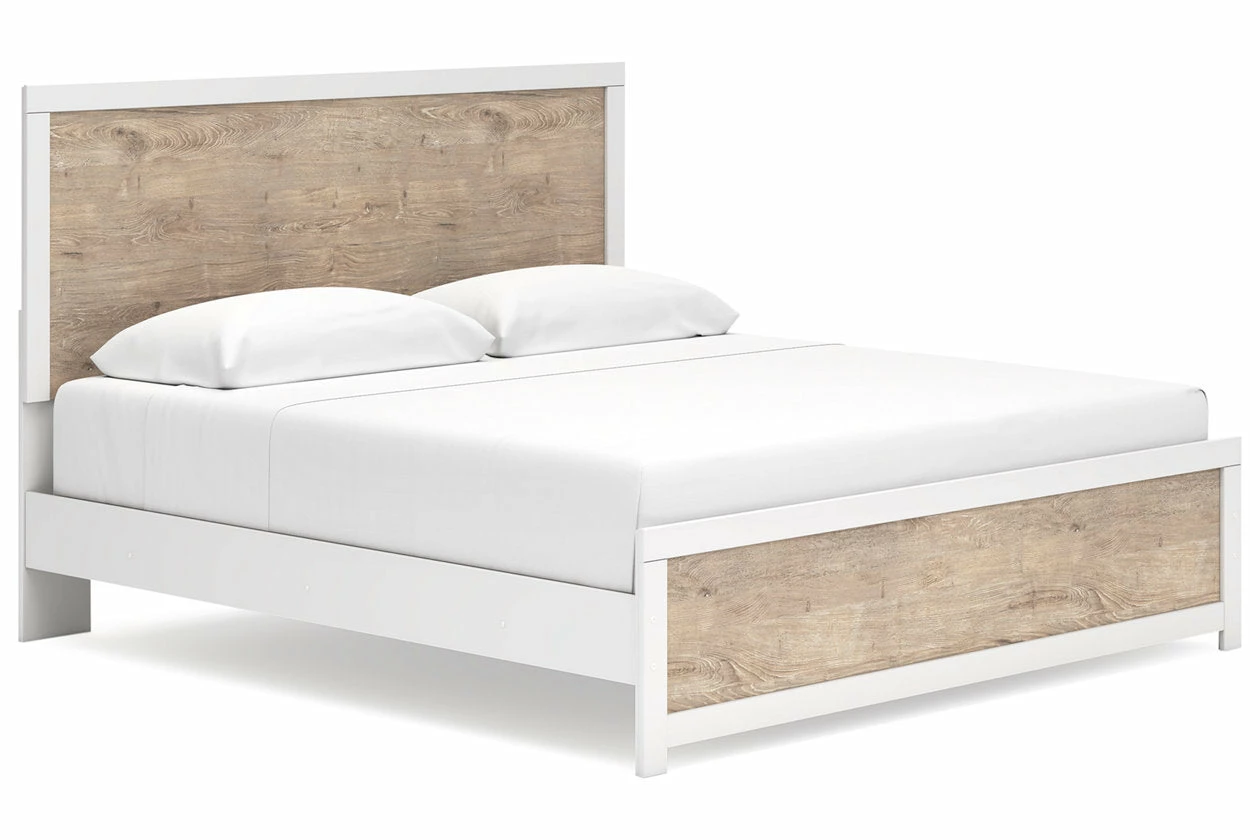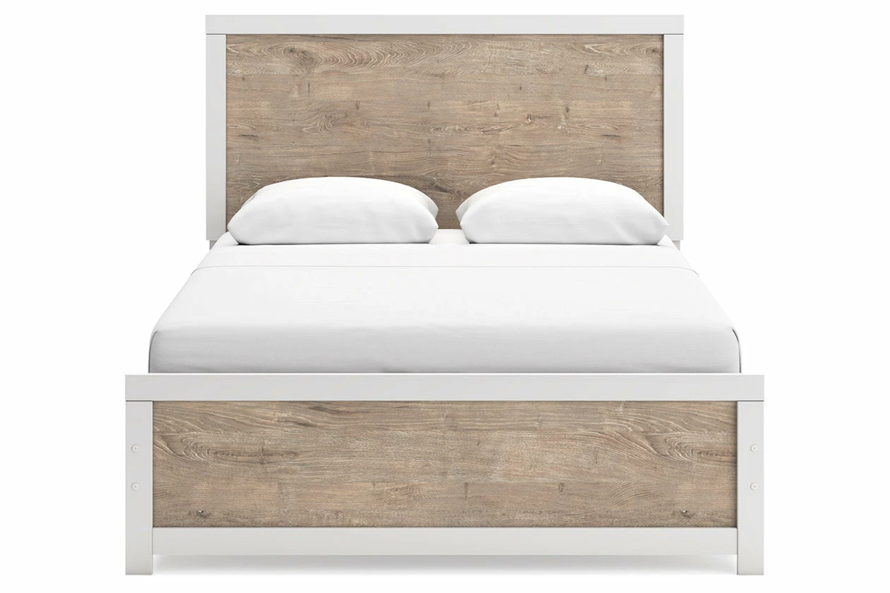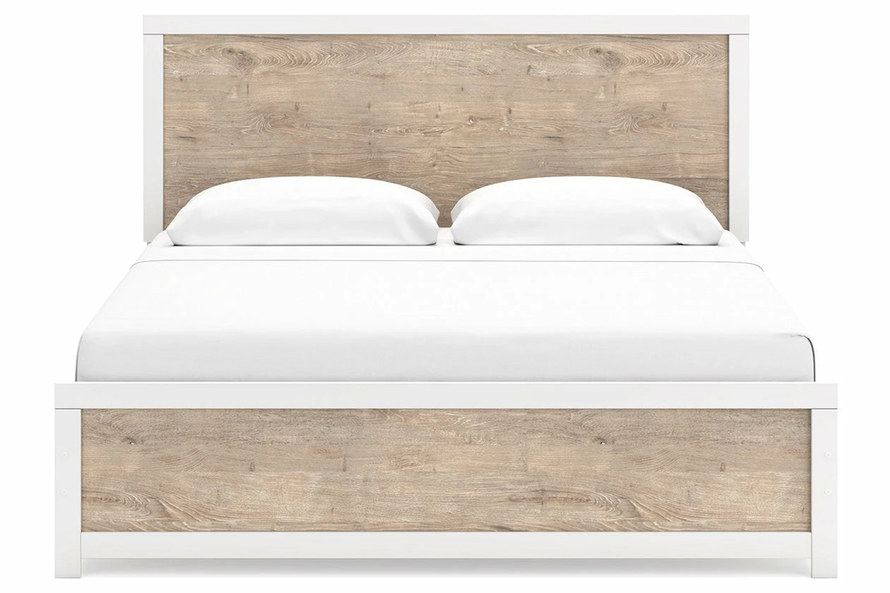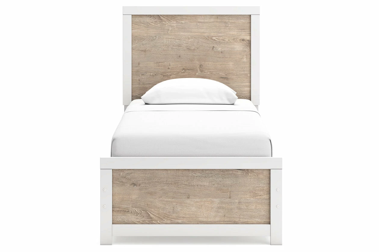 Relaxed yet striking, this twin panel bed brings casual beauty and function to your dream destination. A delightful two-tone treatment blends a fresh, replicated oak grain with a matte white finish that’s easy to love. Its simplicity lends a contemporary touch that suits your bedroom’s style to a T.
