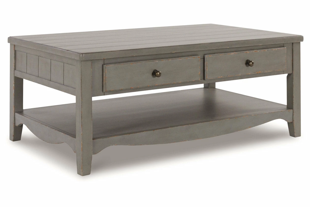 Put your love of European farmhouse styling on display. Finished with an antiqued gray chipped paint effect for an authentic vintage look, this coffee table is loaded with character. Two drawers and an open display shelf allow for storage and easy access to books, beverages and more.