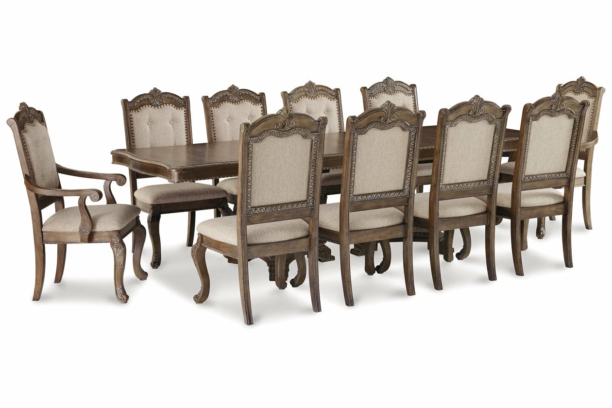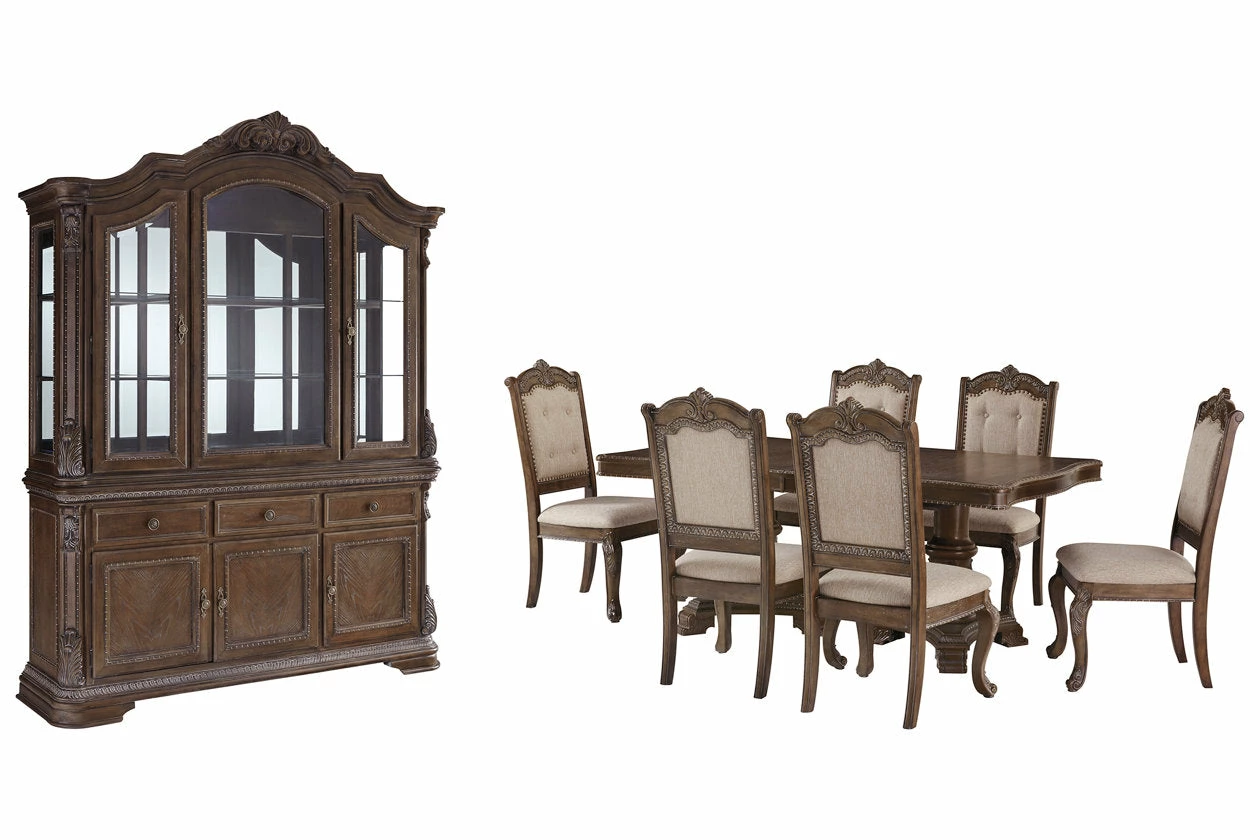 This 10-piece dining set is a uniquely luxurious interpretation of traditional style. Beautifully ornate elements of the dining table include multiple inlaid borders, softly rounded corners and scrolled acanthus accents as the double pedestal base supports the extension tabletop. Exquisitely detailed and treated to a multi-hued finish, the buffet offers two lower cabinets and three drawers in the buffet plus lighted and mirrored cabinet space with glass shelves in the hutch. Beautifully flowing elements of the upholstered dining chairs include gracefully curved legs and a rounded back with acanthus accents. The plush, padded seats and button-tufted upholstery are the very definition of comfort.